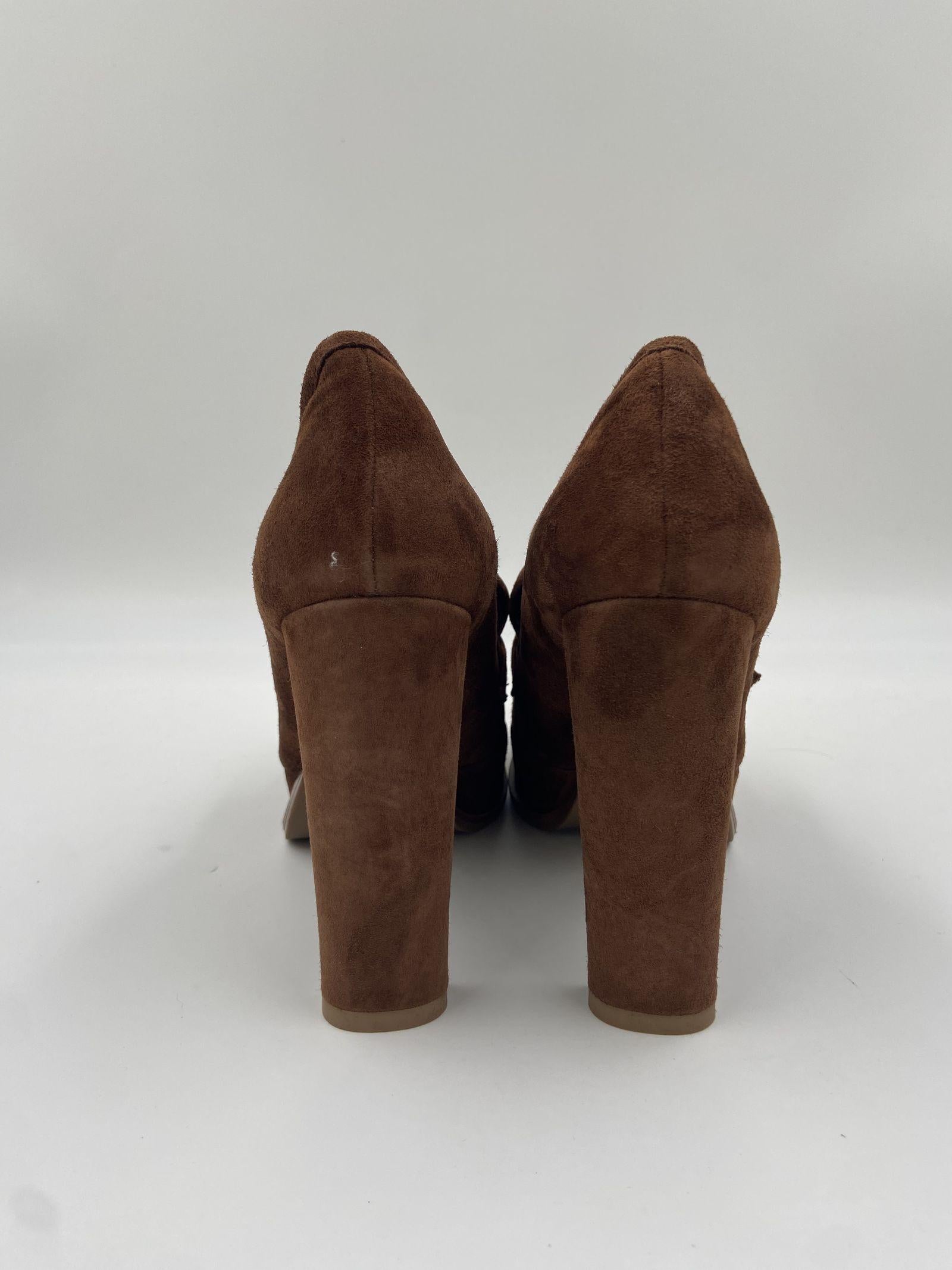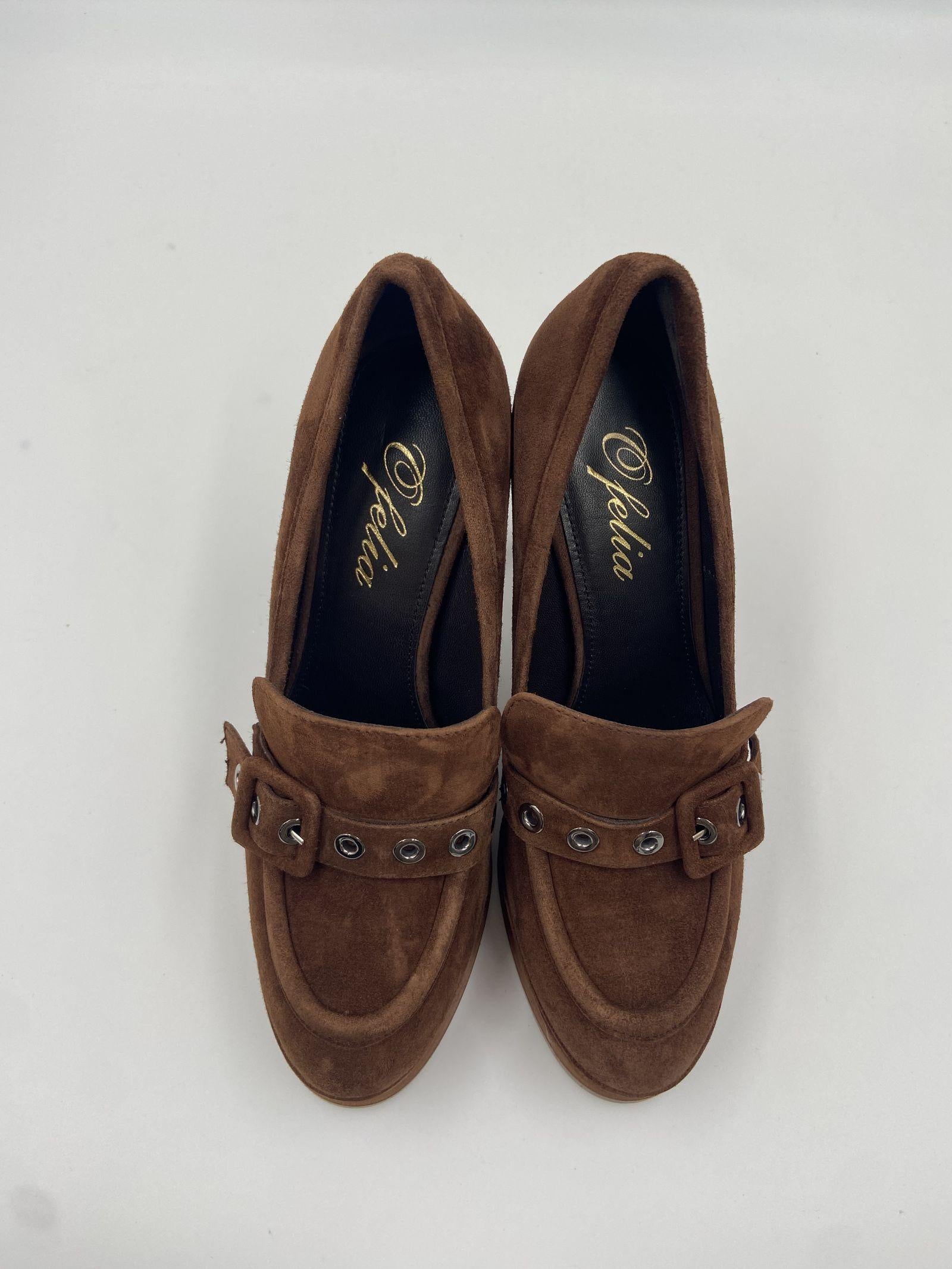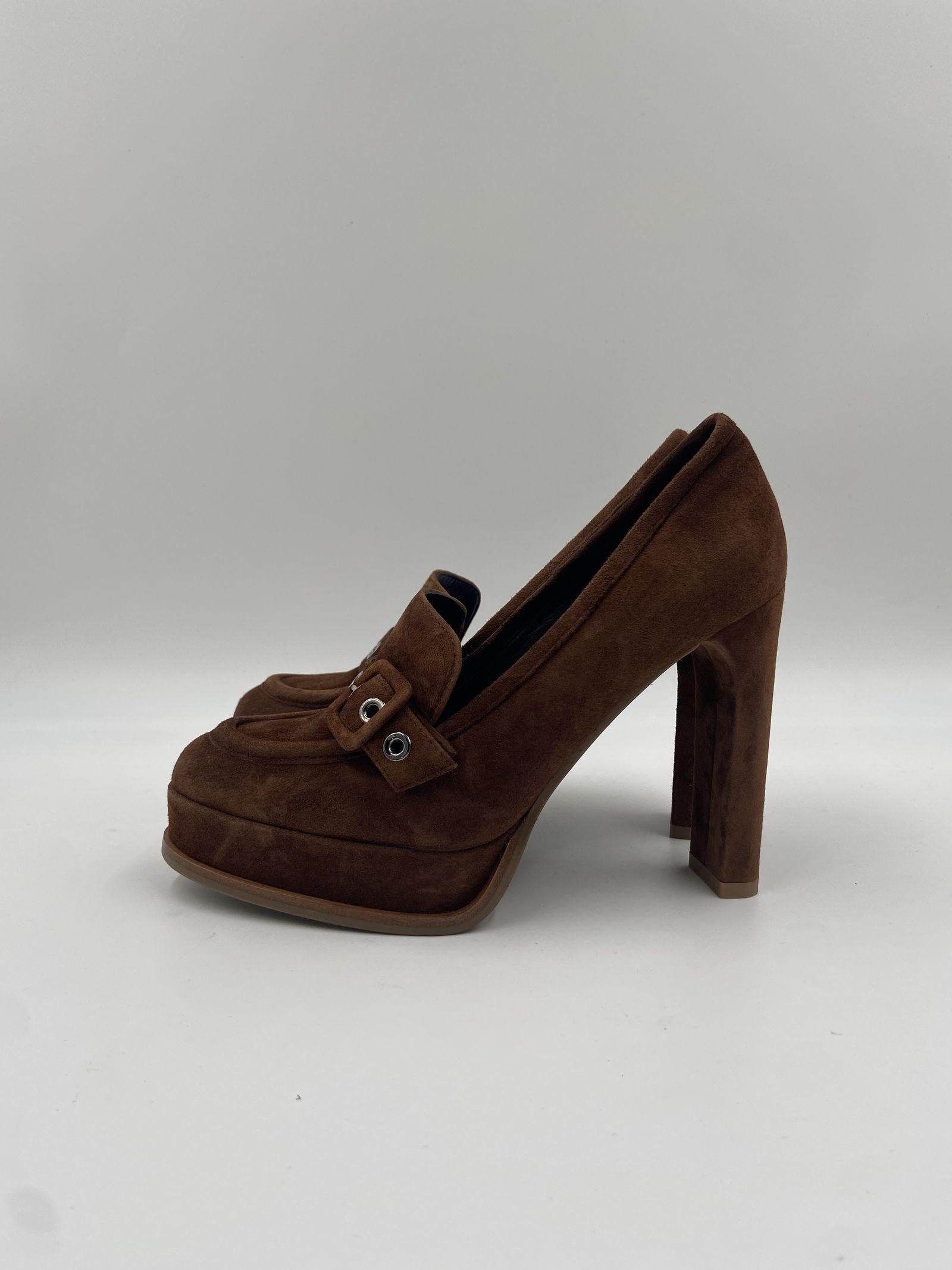 Elegante e deciso, questo sandalo dalla punta tonda è realizzato in morbida pelle scamosciata e rifinito con fodera e soletta in pelle per un comfort superiore. Il design è impreziosito da un cinturino con fibbia posizionato sul davanti, che aggiunge un tocco di carattere e stabilità al piede. Il tacco leggermente largo, rivestito nello stesso materiale, slancia la figura con un'altezza di 110 mm, bilanciata da un plateau frontale di 30 mm che garantisce maggiore comfort e sostegno durante la camminata. La suola in gomma assicura aderenza e durata, rendendo questo modello perfetto per completare look eleganti o da sera con stile e sicurezza.