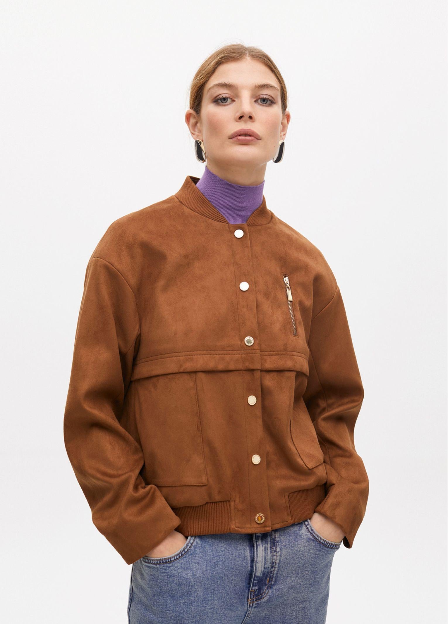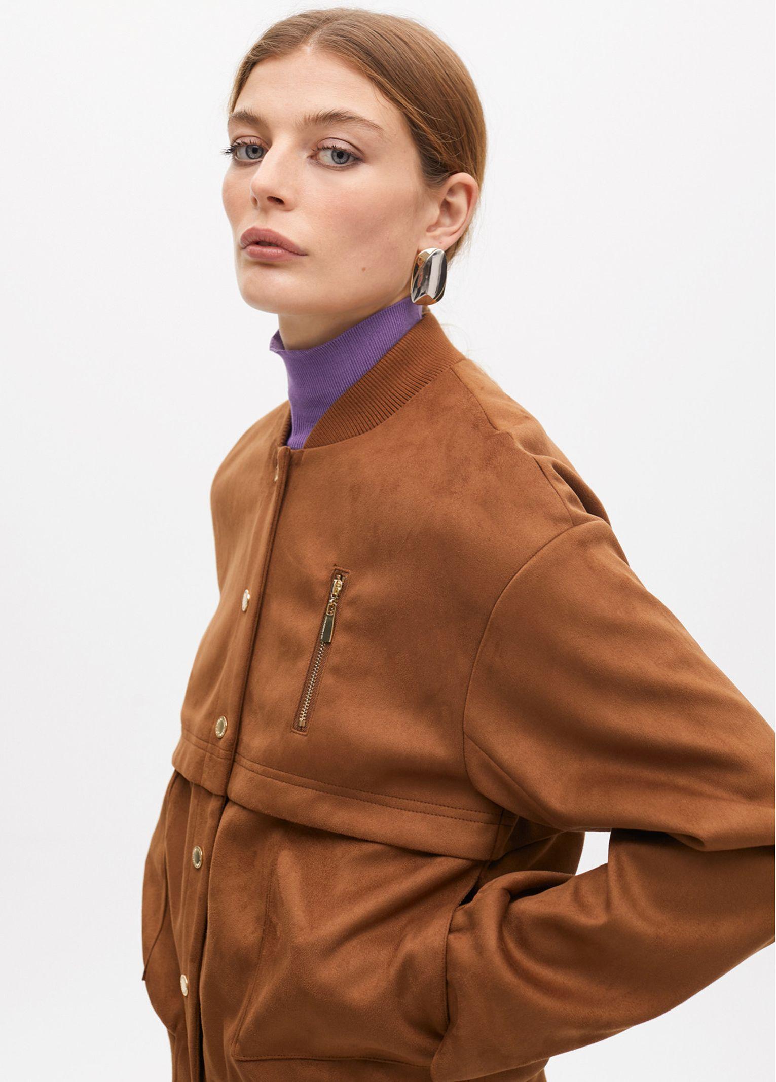 Giacca bomber realizzata in camoscio morbido con tasche frontali. Caratterizzata da una cerniera decorativa dorata e chiusura a scatto. Design moderno con collo rotondo e vestibilità rilassata. Perfetta per abbinare con jeans o gonne per un look casual ma elegante.