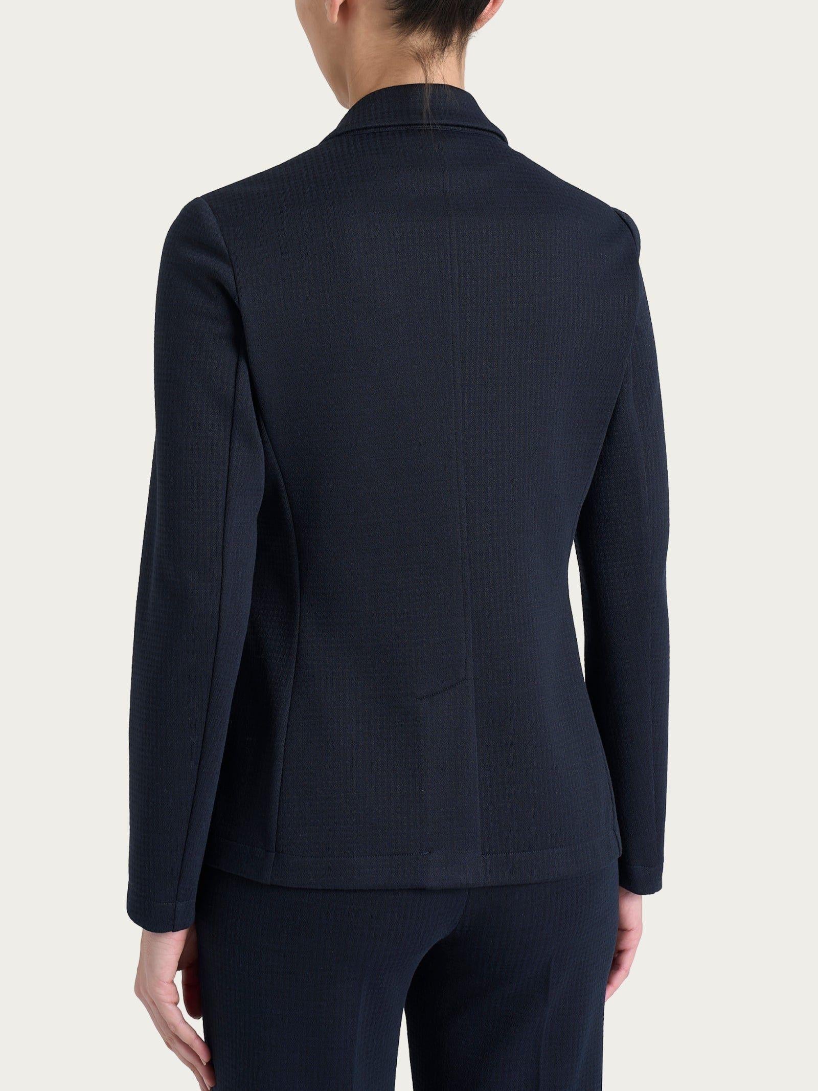 Blazer corto costruito con chiusura a due bottoni e collo rever classico. Ha una vestibilità regular pensata per valorizzare ogni silhouette e offrire comfort. Le tasche applicate oltre ad essere un importante dettaglio di stile, aggiungono praticità al capo. Caratterizzato da una fantasia micro check, motivo a quadretti di dimensioni ridotte, ordinati e regolari, che donano al tessuto un aspetto sobrio ma ricercato ed elegante. Realizzato in Eco Jacquard, un punto Milano elasticizzato che unisce la stabilità dei tessuti navetta con la flessibilità della maglia, permettendo la creazione di eleganti disegni tinto filo grazie alla tessitura jacquard. Ideale per ogni momento della giornata, si adatta con disinvoltura dallambiente professionale alle serate più raffinate, unendo stile e comodità.