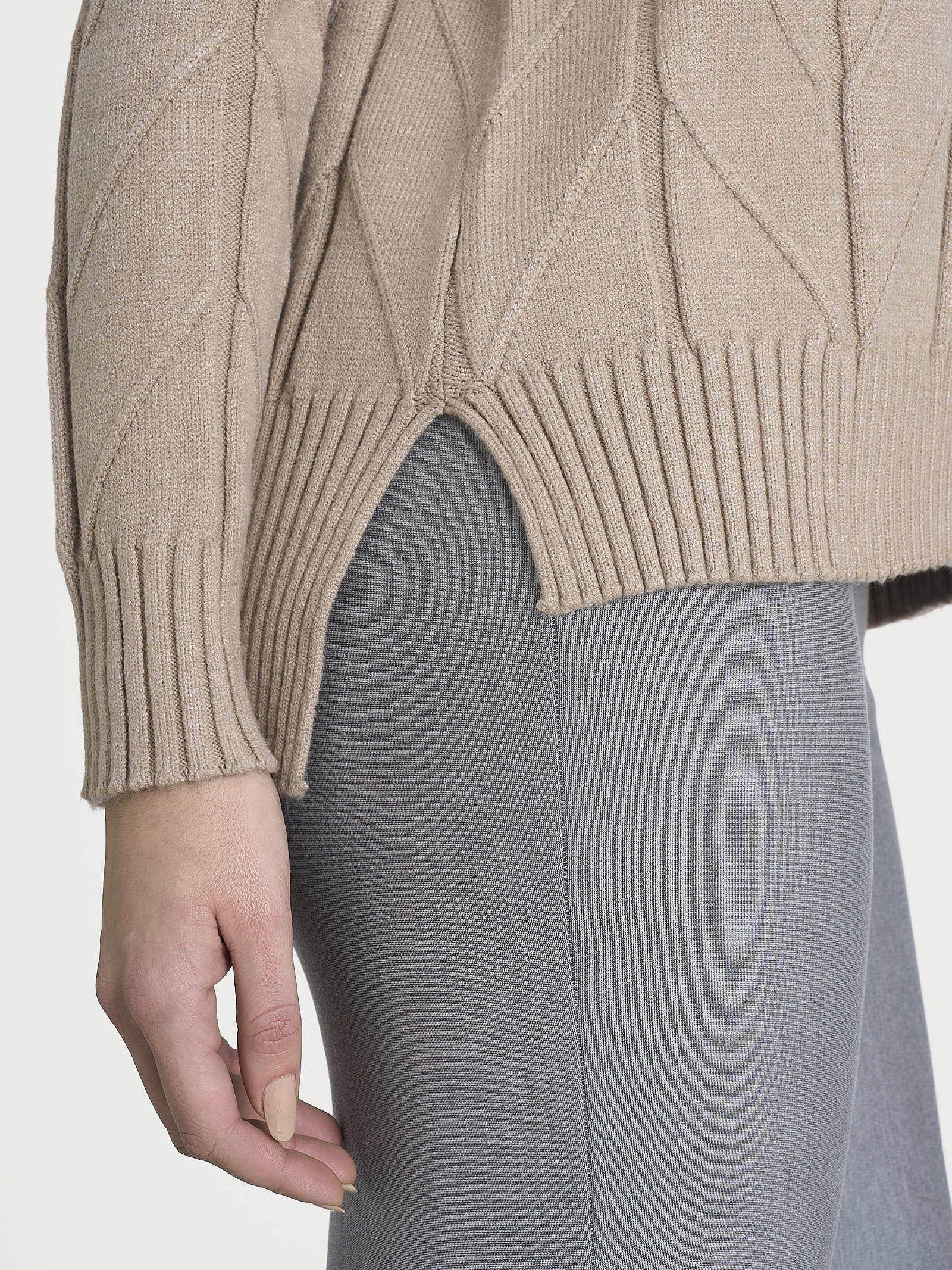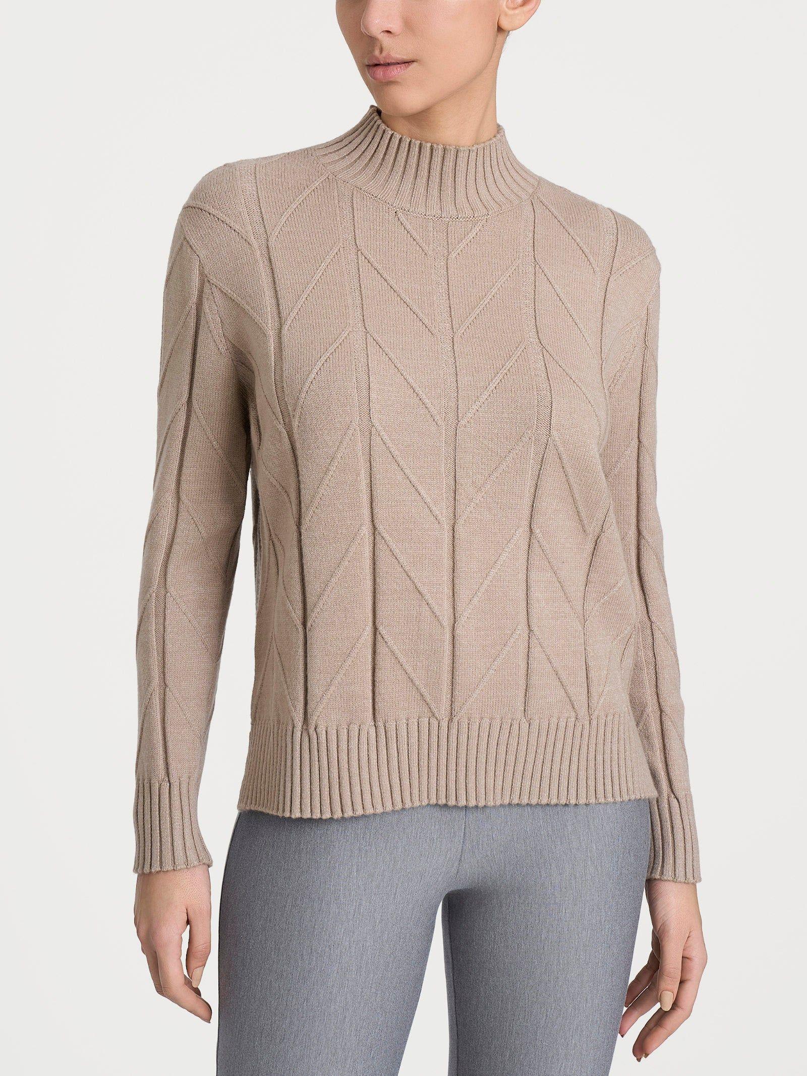 Lupetto da donna con le maniche lunghe. Caratterizzato da una lavorazione a punto spiga e una fantasia a rilievo a spina di pesce che aggiunge profondità pur mantenendo uno stile semplice ma ricercato. Il collo alto morbido, tipico del lupetto, dona calore e stile, mentre la finezza 7 lo rende leggero senza comprometterne il calore. Il fondo asimmetrico e gli spacchetti laterali donano movimento al capo facilitandone l’indosso. Con la sua vestibilità boxy offre una silhouette moderna e informale, mentre le maniche sono rifinite da pratici polsini, in armonia con la bordatura del collo e del fondo del capo per maggiore comfort. Realizzato nell'esclusivo filato Super Soft, un mix super morbido di fibre che unisce morbidezza, calore e praticità. Soffice anche sulle pelli più sensibili. Questo capo si abbina facilmente ai Ragno Pants, offrendo combinazioni di stile curate e attuali adatti a tutti i momenti della giornata.