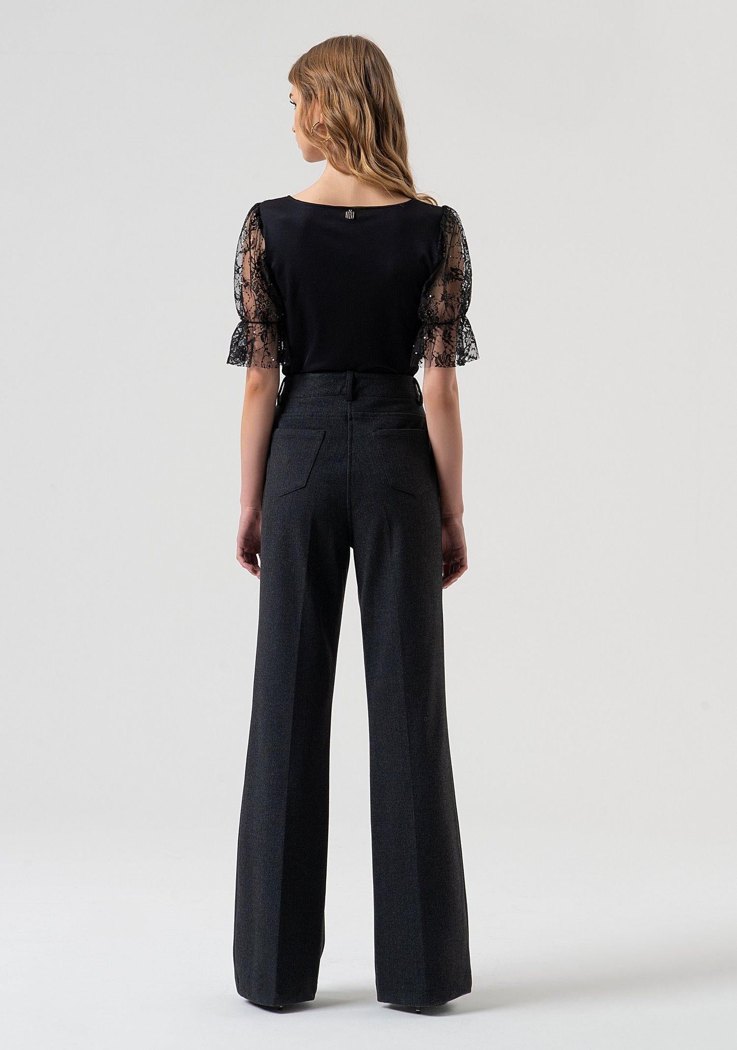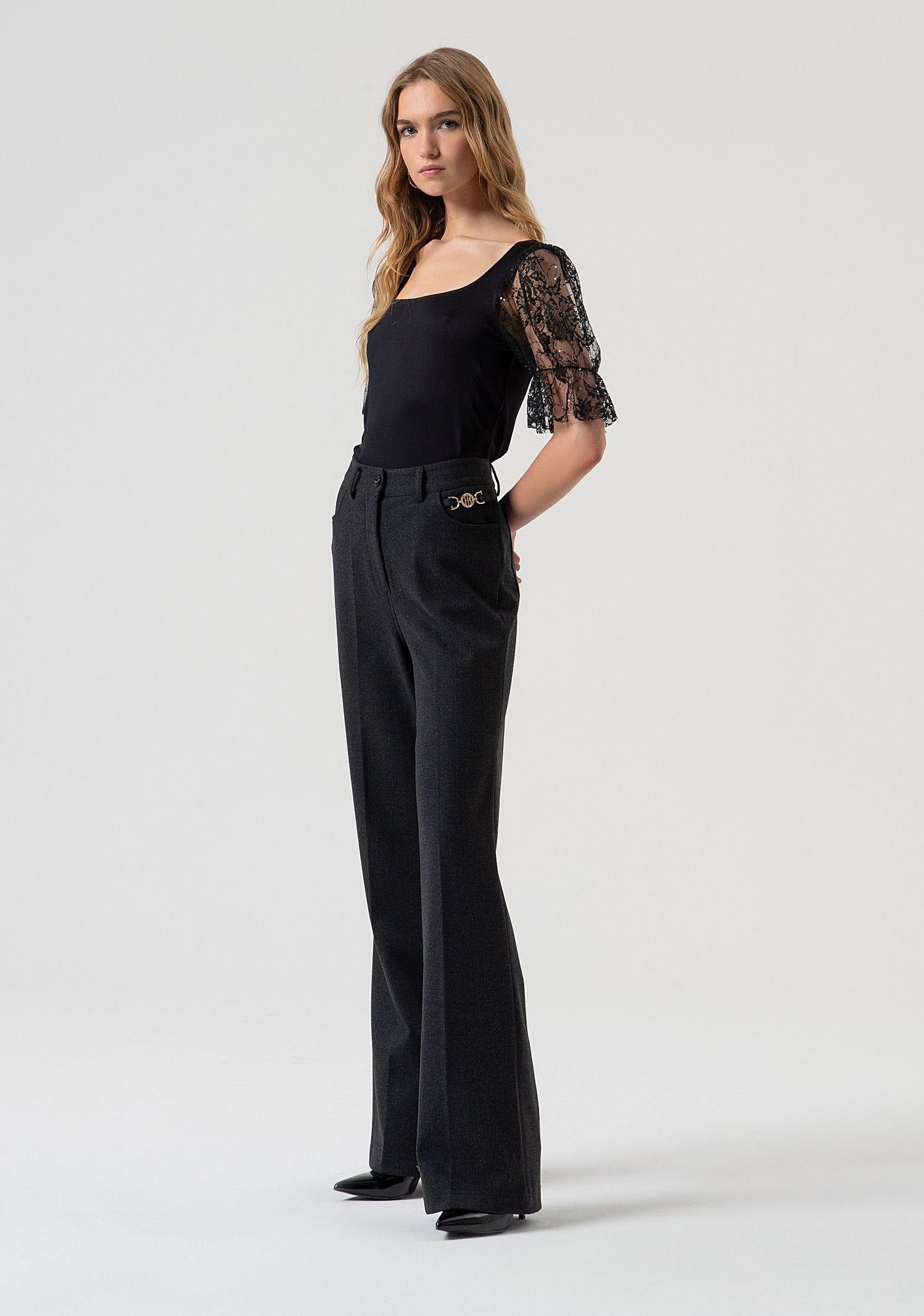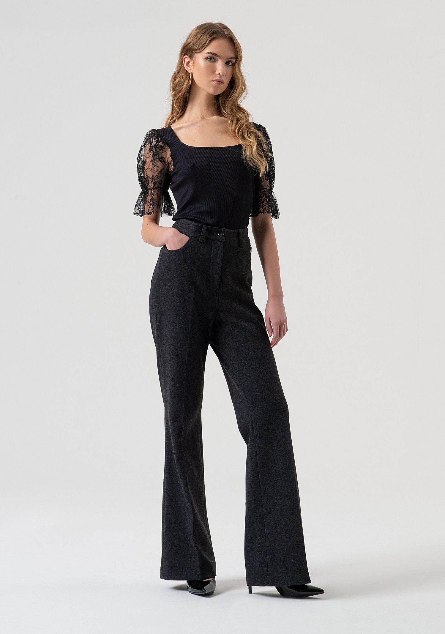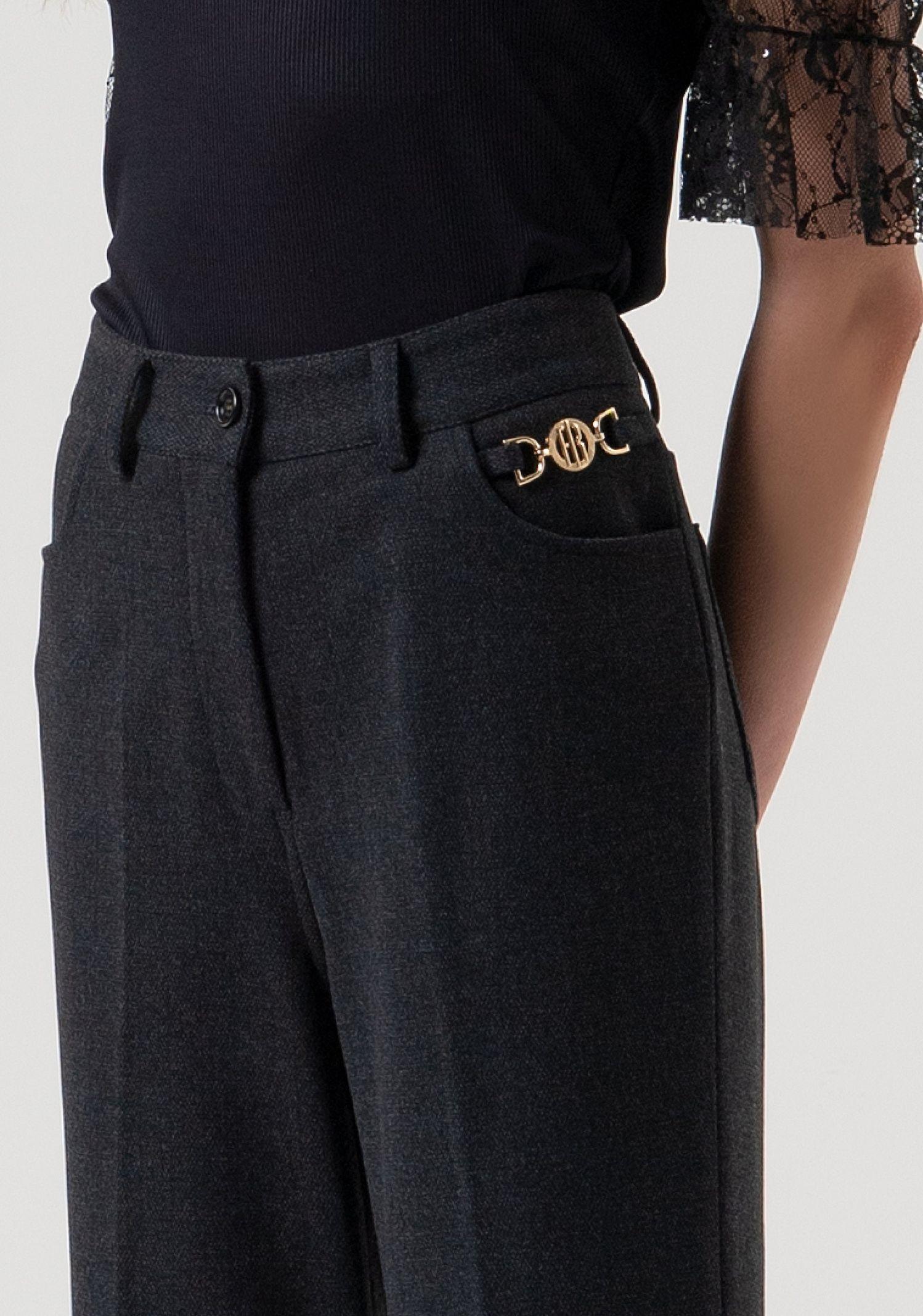 Pantalone bootcut con vita alta che valorizza la silhouette e assicura una vestibilità comoda e femminile, dotato di quattro tasche funzionali dal design essenziale, accessorio logo applicato come dettaglio distintivo e di carattere, fondo largo che conferisce movimento e uneleganza senza tempo al capo, perfetto per creare look sofisticati e moderni con un tocco di personalità.