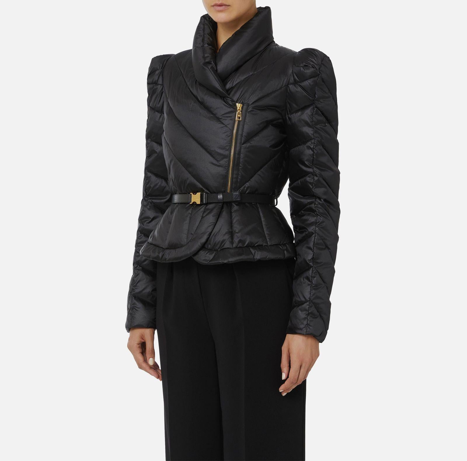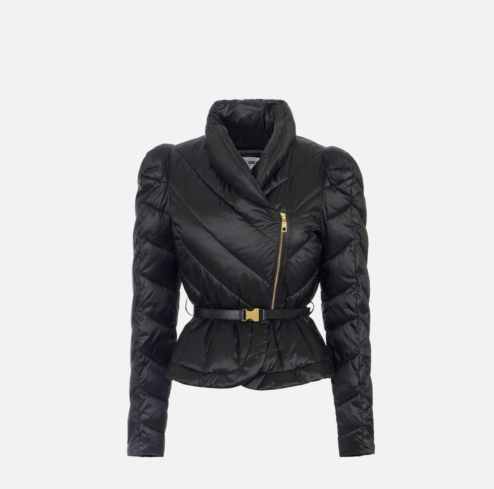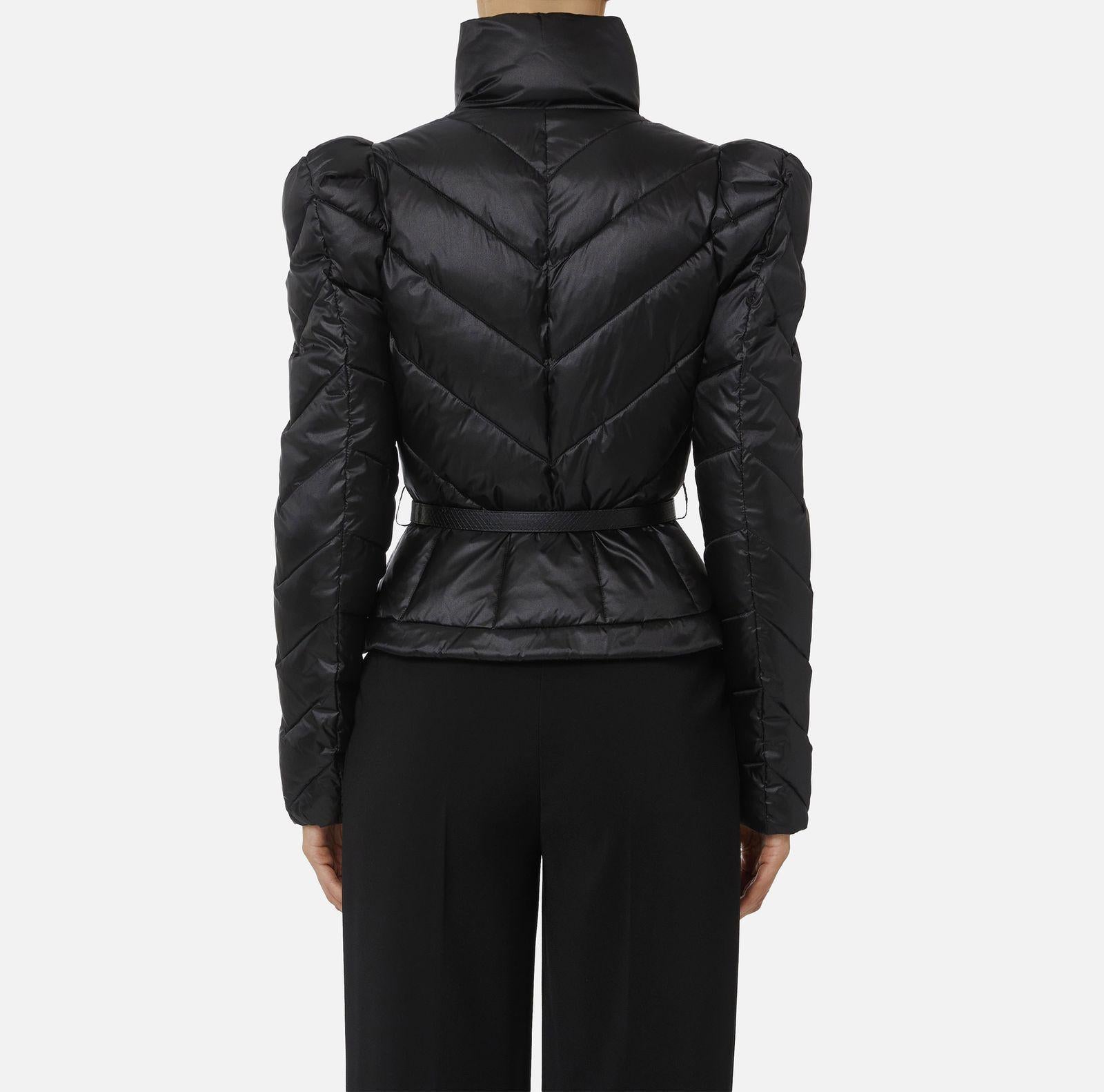 Piumino corto realizzato in tessuto vela dalla luminosa texture cangiante. Imbottito e trapuntato con motivi chevron, si distingue per il collo alto sovrapposto e per le maniche con spalle bombate dai leggeri motivi di arricciatura. La baschina definita dalla cintura con fibbia esalta la linea femminile del capo. Vestibilità slim e chiusura con zip e tirazip.