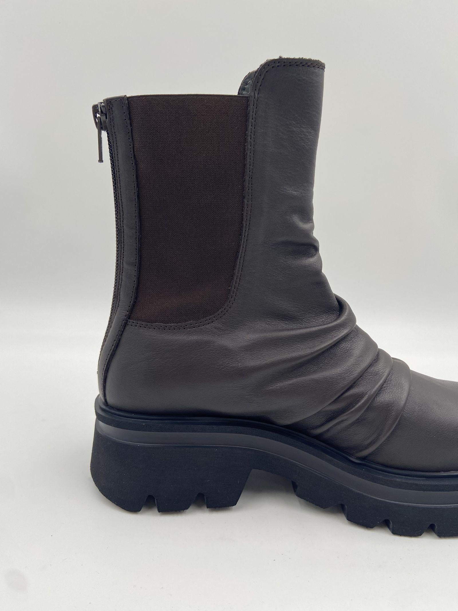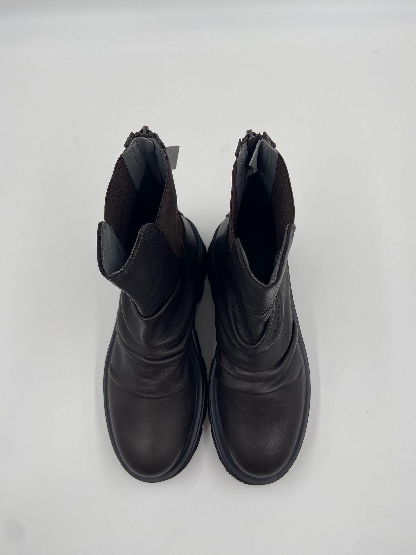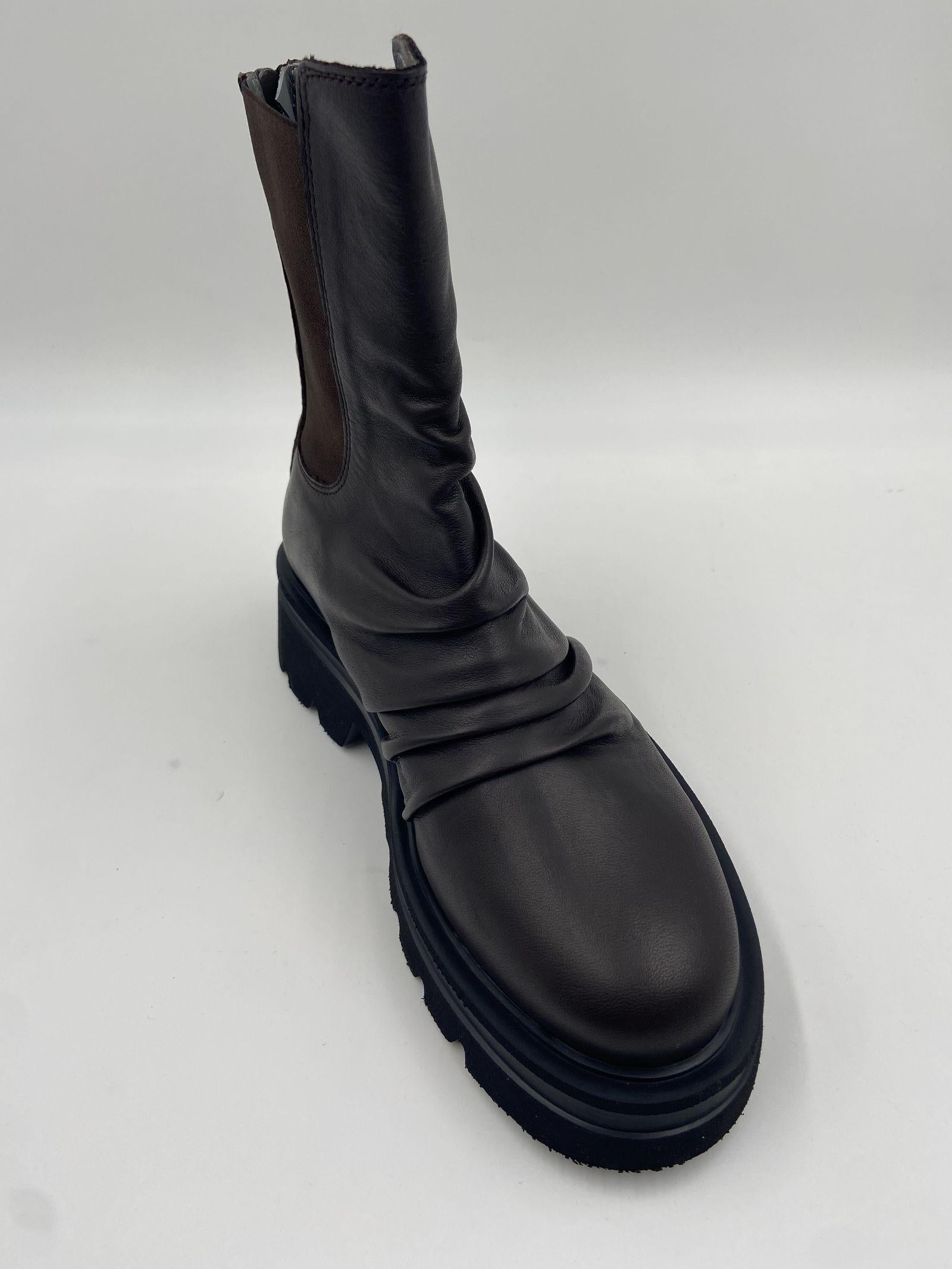 Scopri questi stivaletti in pelle, un perfetto equilibrio tra comfort e stile minimale. Realizzati in pregiata pelle marrone scura, questi tronchetti si distinguono per la loro linea pulita ed essenziale, arricchita da una pratica zip posteriore che garantisce una calzata semplice e sicura. La suola Noriko con tacco da 50 mm, platform da 30 mm e battuta da 15 mm offre un perfetto bilanciamento tra eleganza e comodità, mentre la punta rotonda conferisce un tocco armonioso al design. Linterno in pelle assicura morbidezza e una vestibilità confortevole, mentre la suola in gomma dentellata garantisce stabilità e aderenza su ogni superficie. Gli ankle boots Toki rappresentano il must-have della stagione, ideali per valorizzare ogni outfit con un tocco di eleganza discreta e praticità.