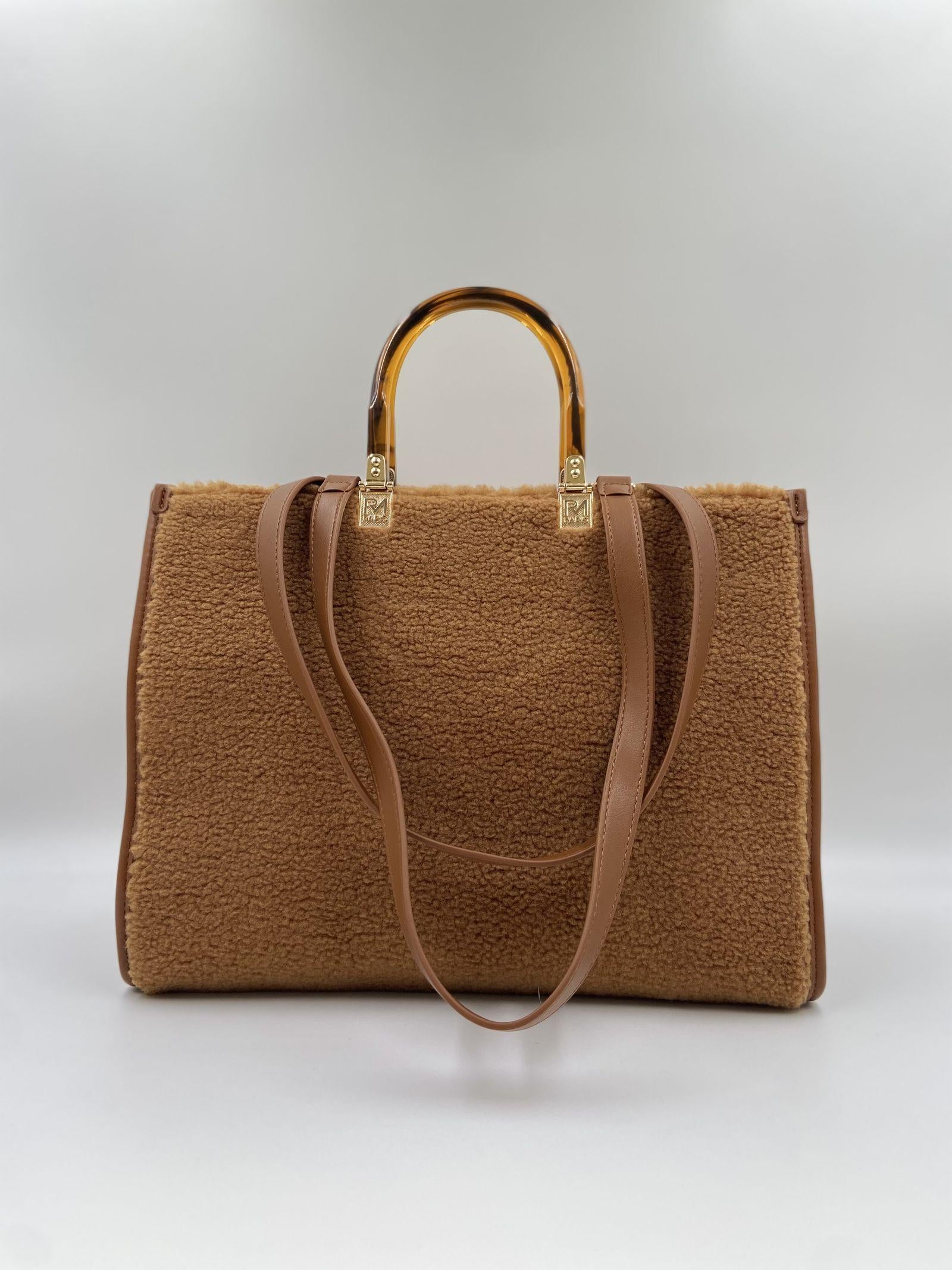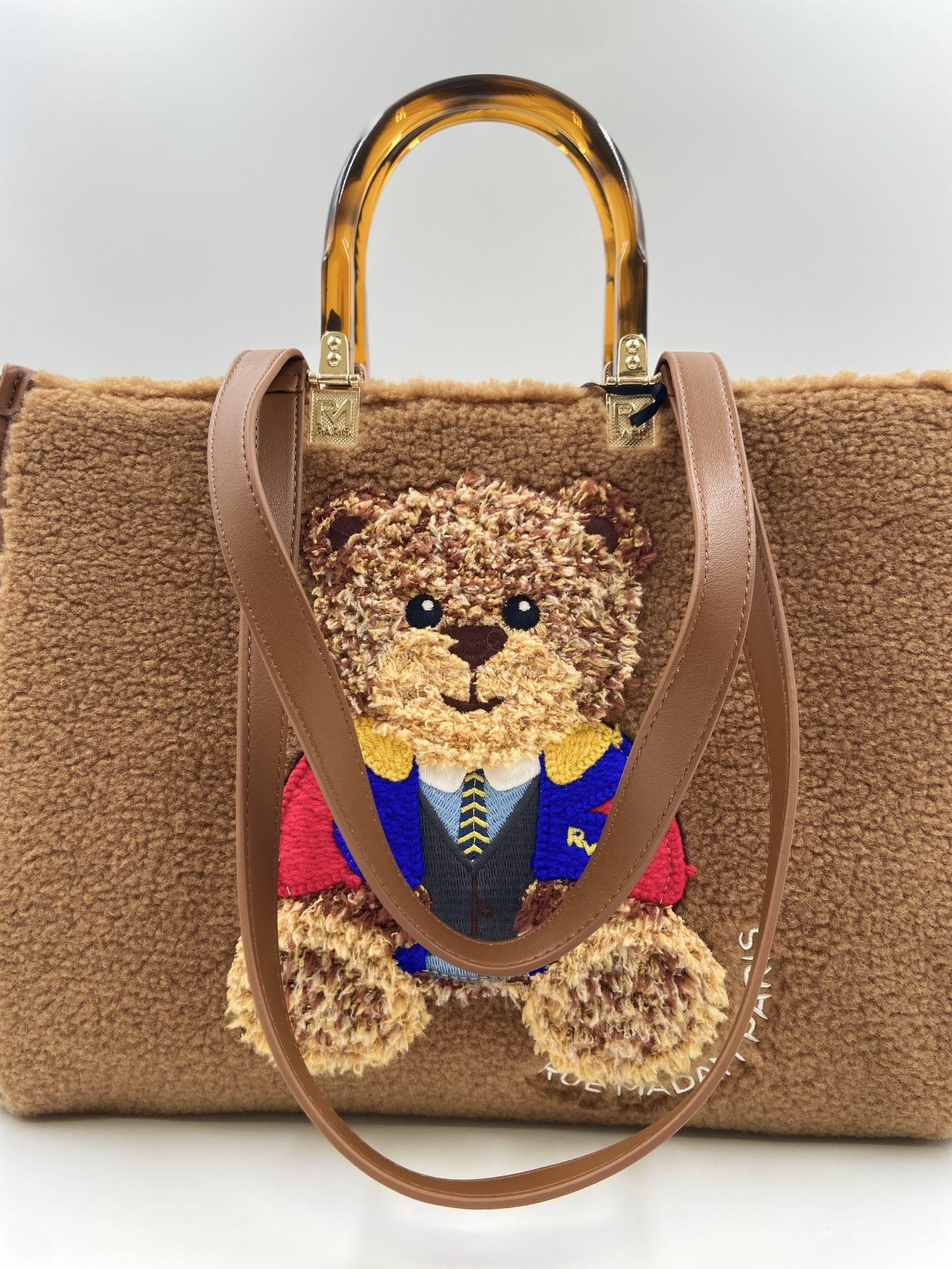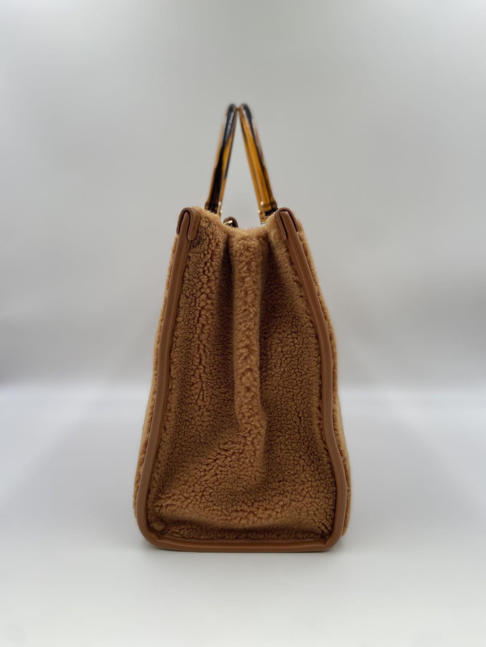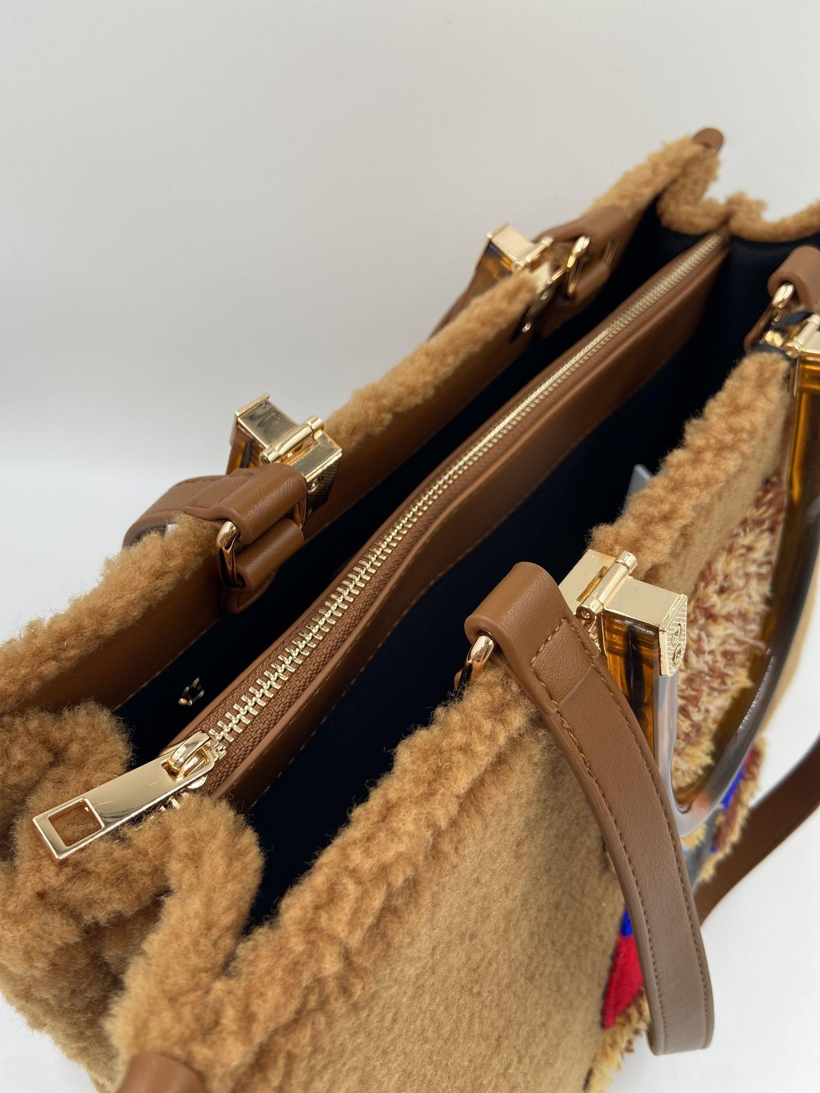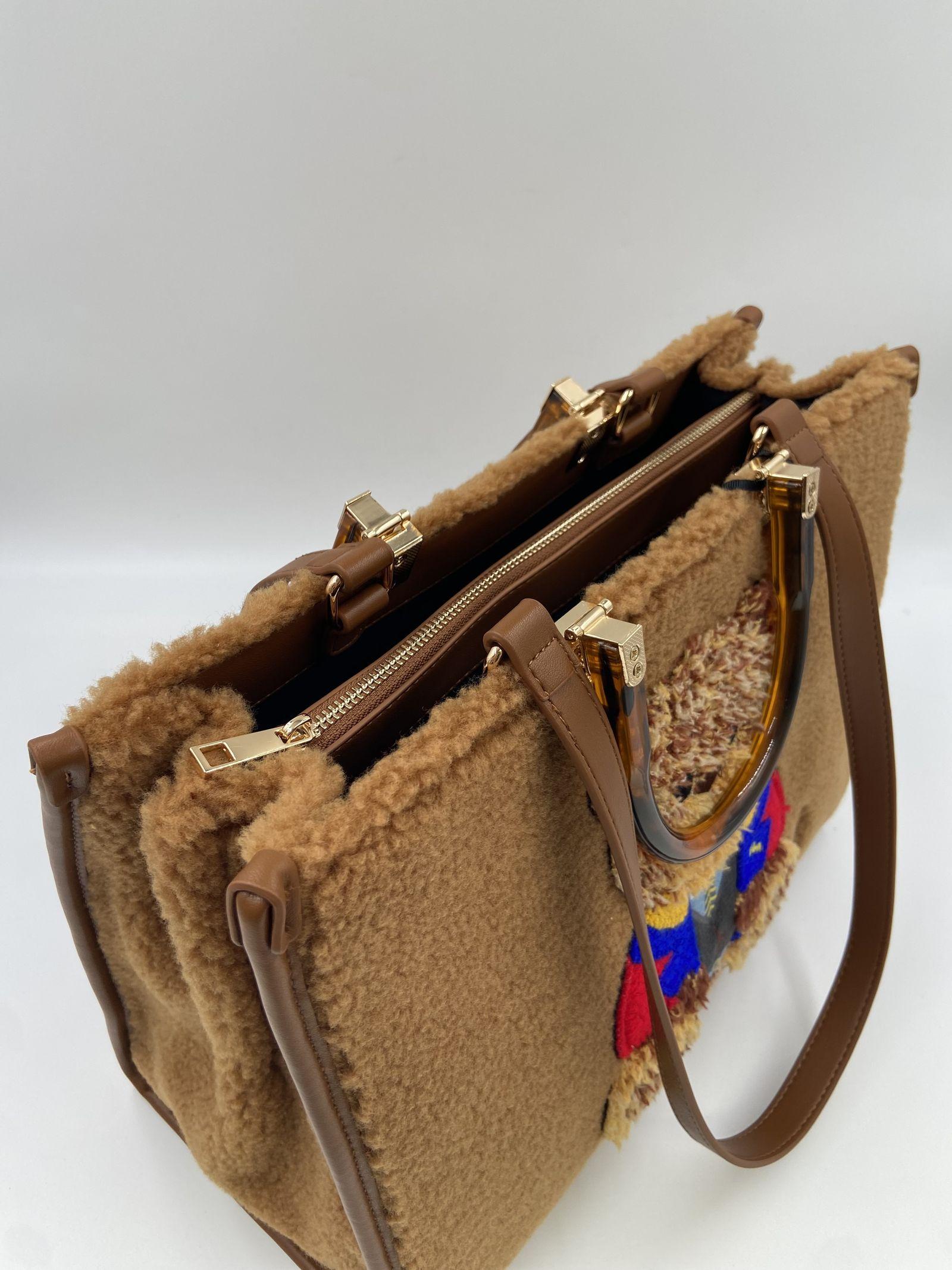 Borsa realizzata in fake-fur colore biscotto, caratterizzata da doppio manico, interno foderato con doppia tasca interna, una con zip e una aperta a parete, due scomparti aperti e uno chiuso con zip dorata, fondo con piedini, dettagli oro, logo davanti cucito. Si distingue per i manici, uno in materiale plastificato trasparente da portare a mano, con dettagli metallici oro logati, e uno in simipelle più lungo, e per il patch Orsetto multicolor davanti.Dimensioni: H 28cm x L 36cm x P 17cm