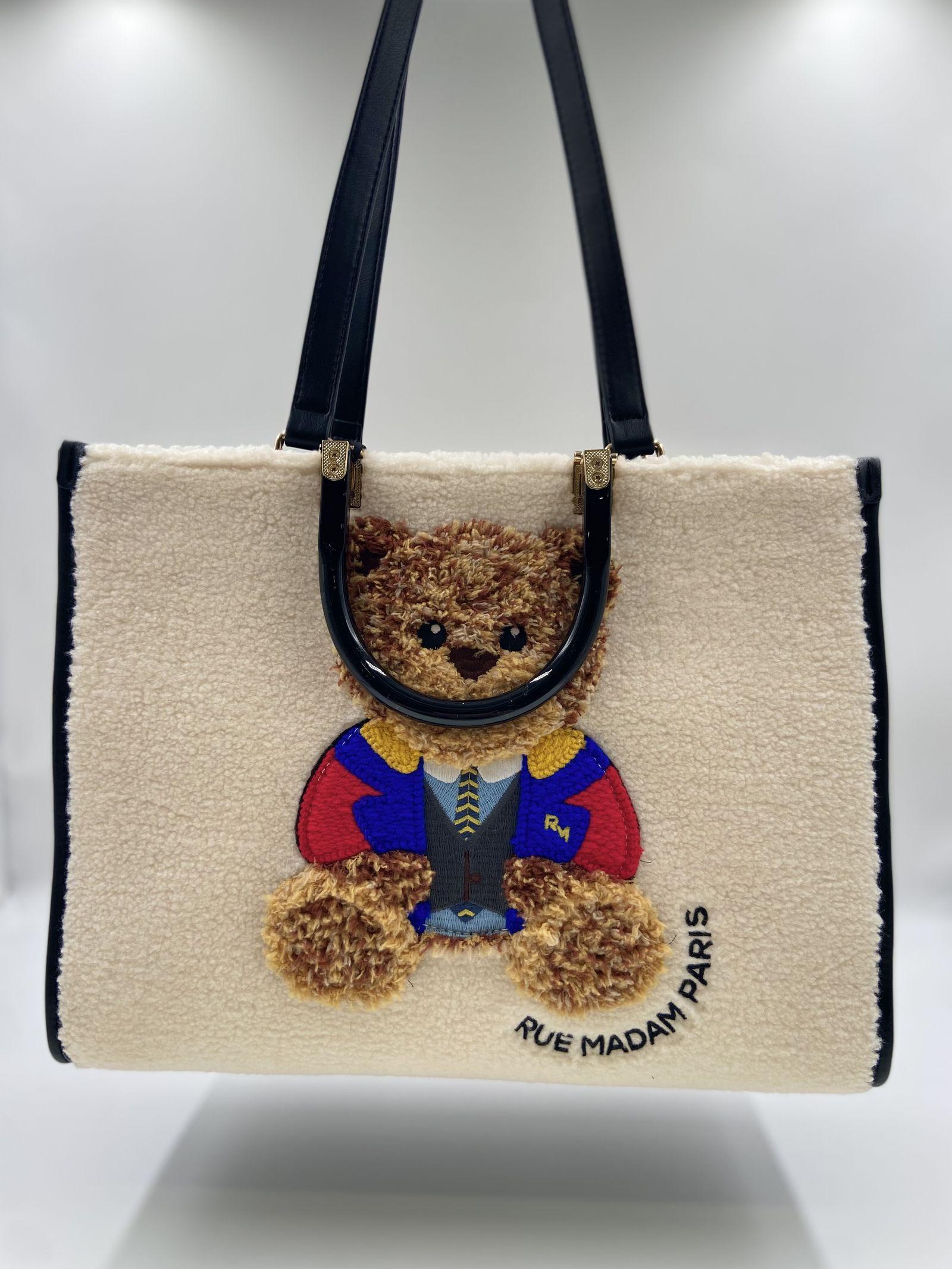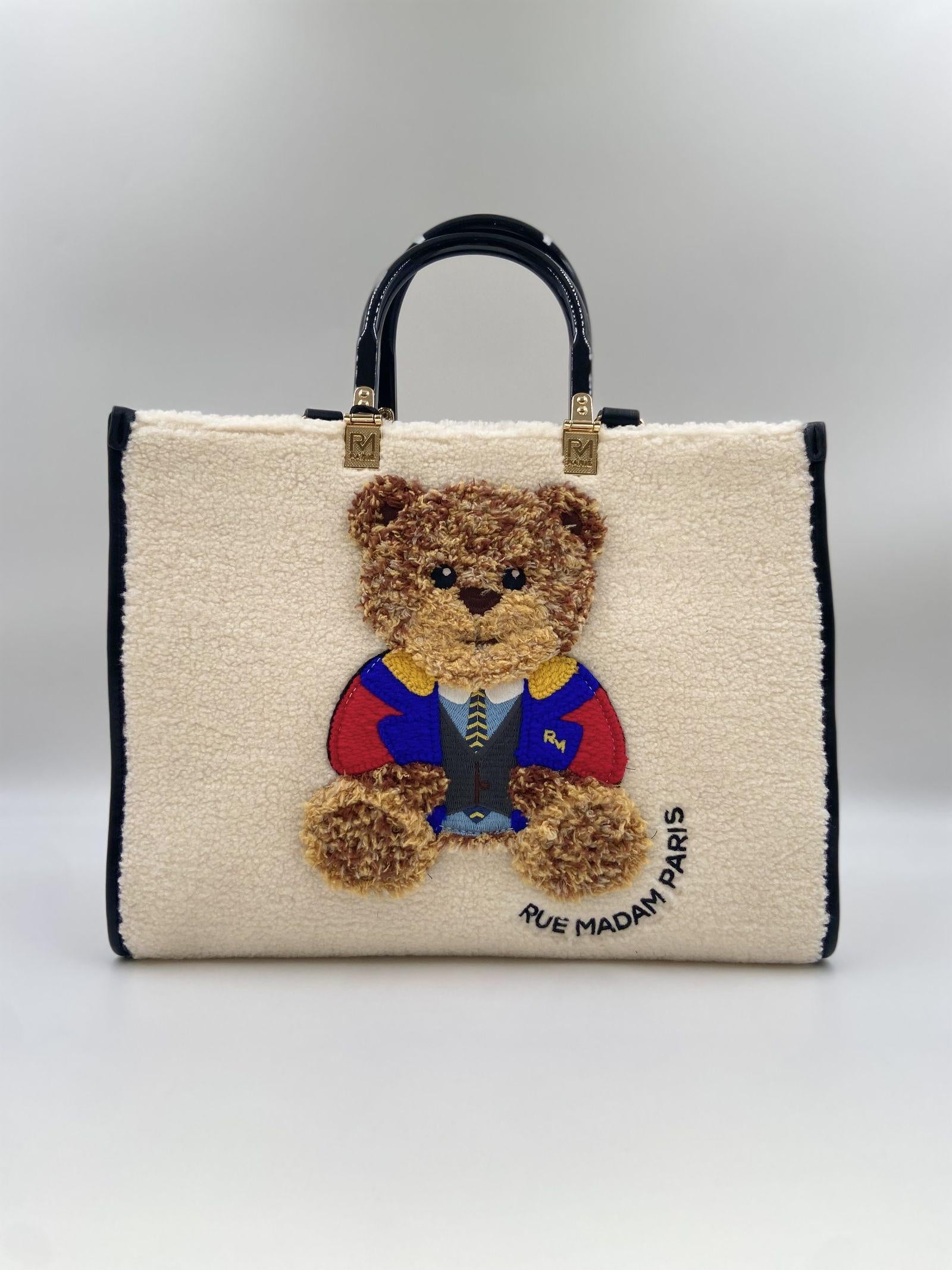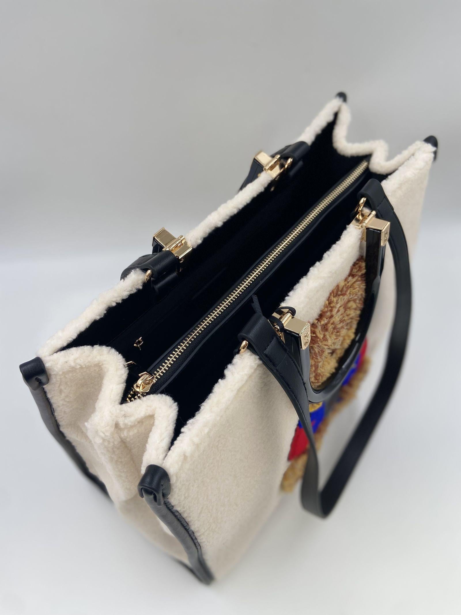 Borsa realizzata in fake-fur colore bianco, caratterizzata da doppio manico, interno foderato con doppia tasca interna, una con zip e una aperta a parete, due scomparti aperti e uno chiuso con zip dorata, fondo con piedini, dettagli oro, logo davanti cucito. Si distingue per i manici, uno in materiale plastificato colore nero da portare a mano, con dettagli metallici oro logati, e uno in simipelle più lungo, e per il patch Orsetto multicolor davanti.Dimensioni: H 28cm x L 36cm x P 17cm