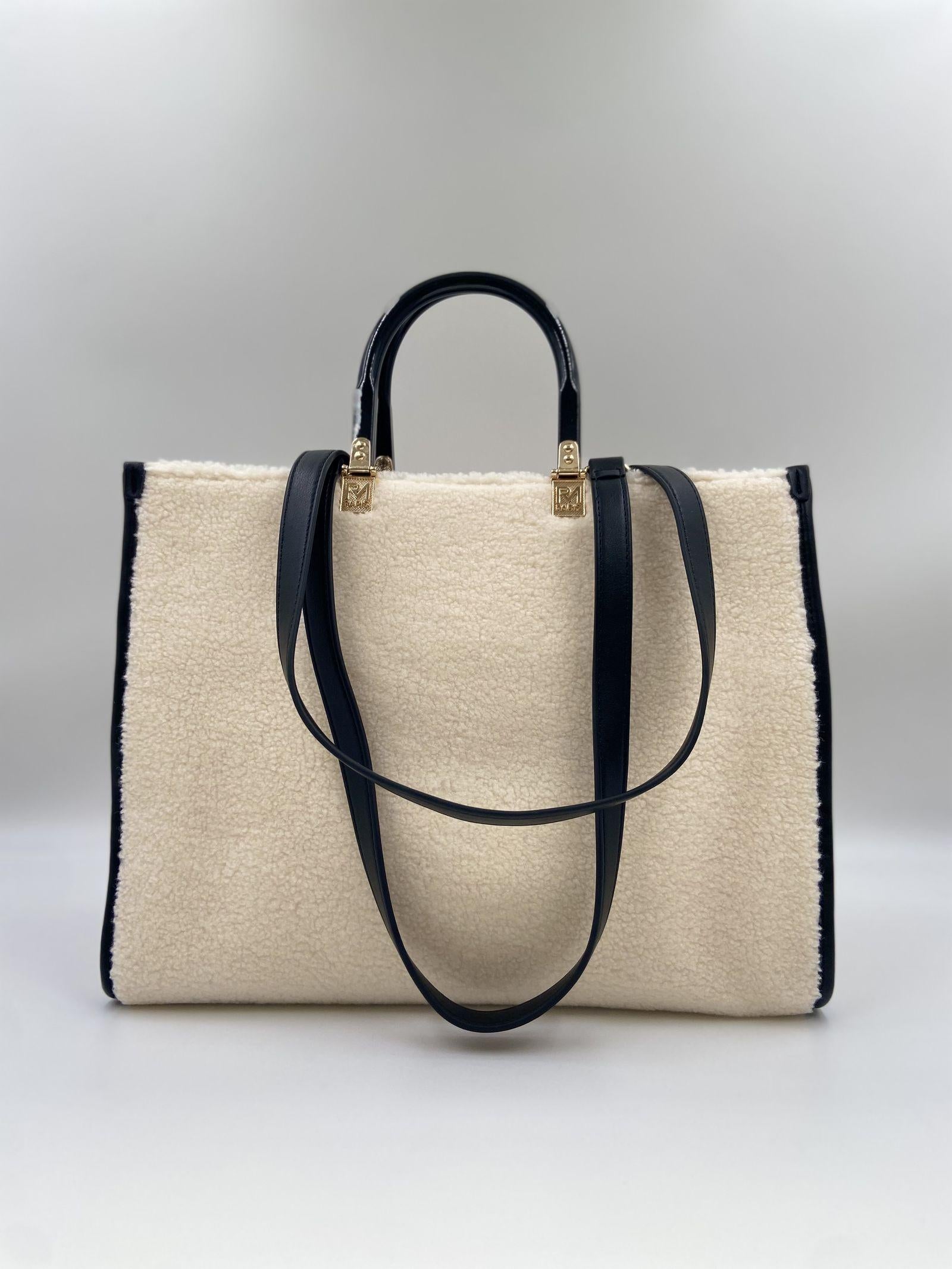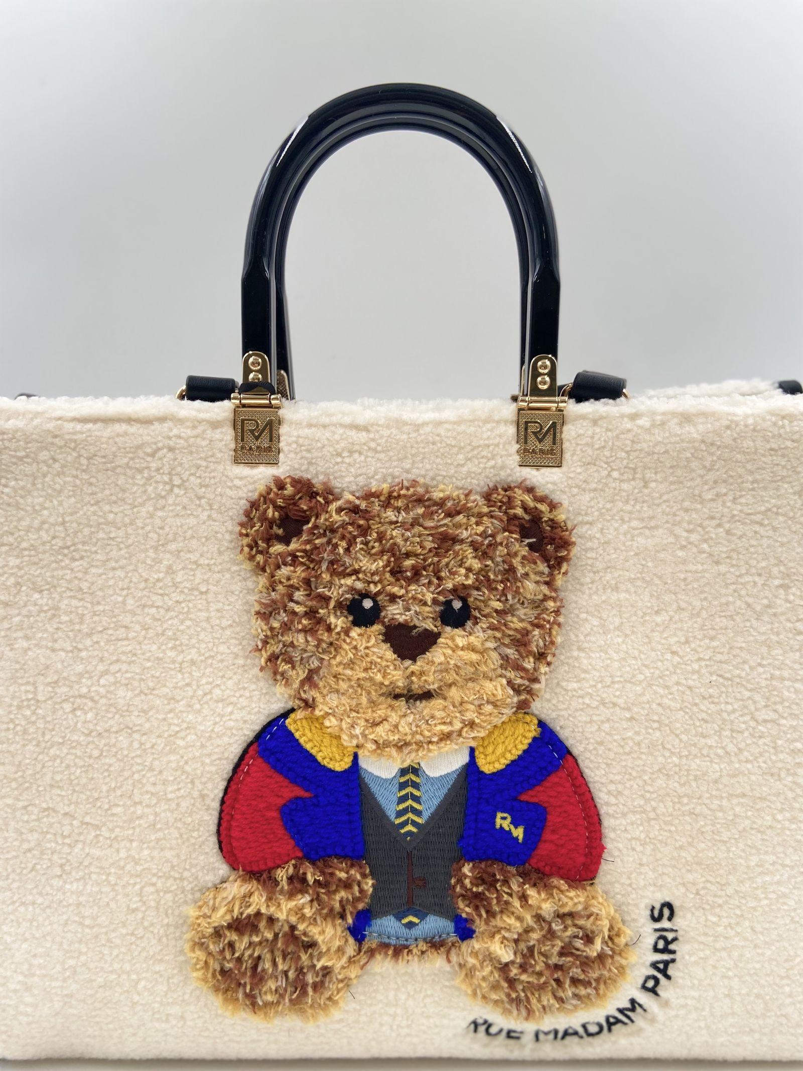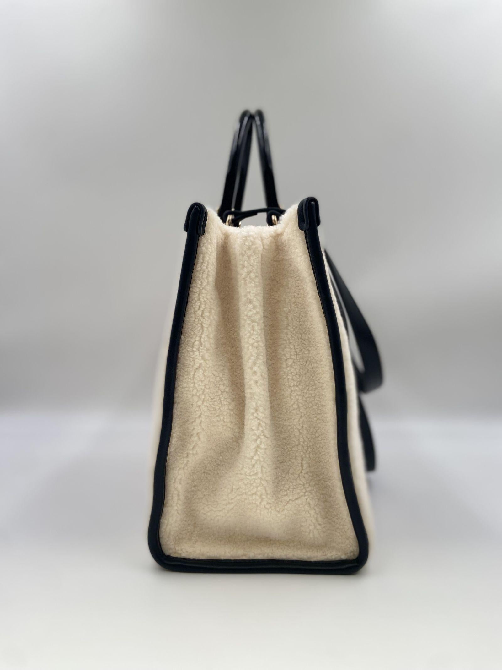 Borsa realizzata in fake-fur colore bianco, caratterizzata da doppio manico, interno foderato con doppia tasca interna, una con zip e una aperta a parete, due scomparti aperti e uno chiuso con zip dorata, fondo con piedini, dettagli oro, logo davanti cucito. Si distingue per i manici, uno in materiale plastificato colore nero da portare a mano, con dettagli metallici oro logati, e uno in simipelle più lungo, e per il patch Orsetto multicolor davanti.Dimensioni: H 28cm x L 36cm x P 17cm