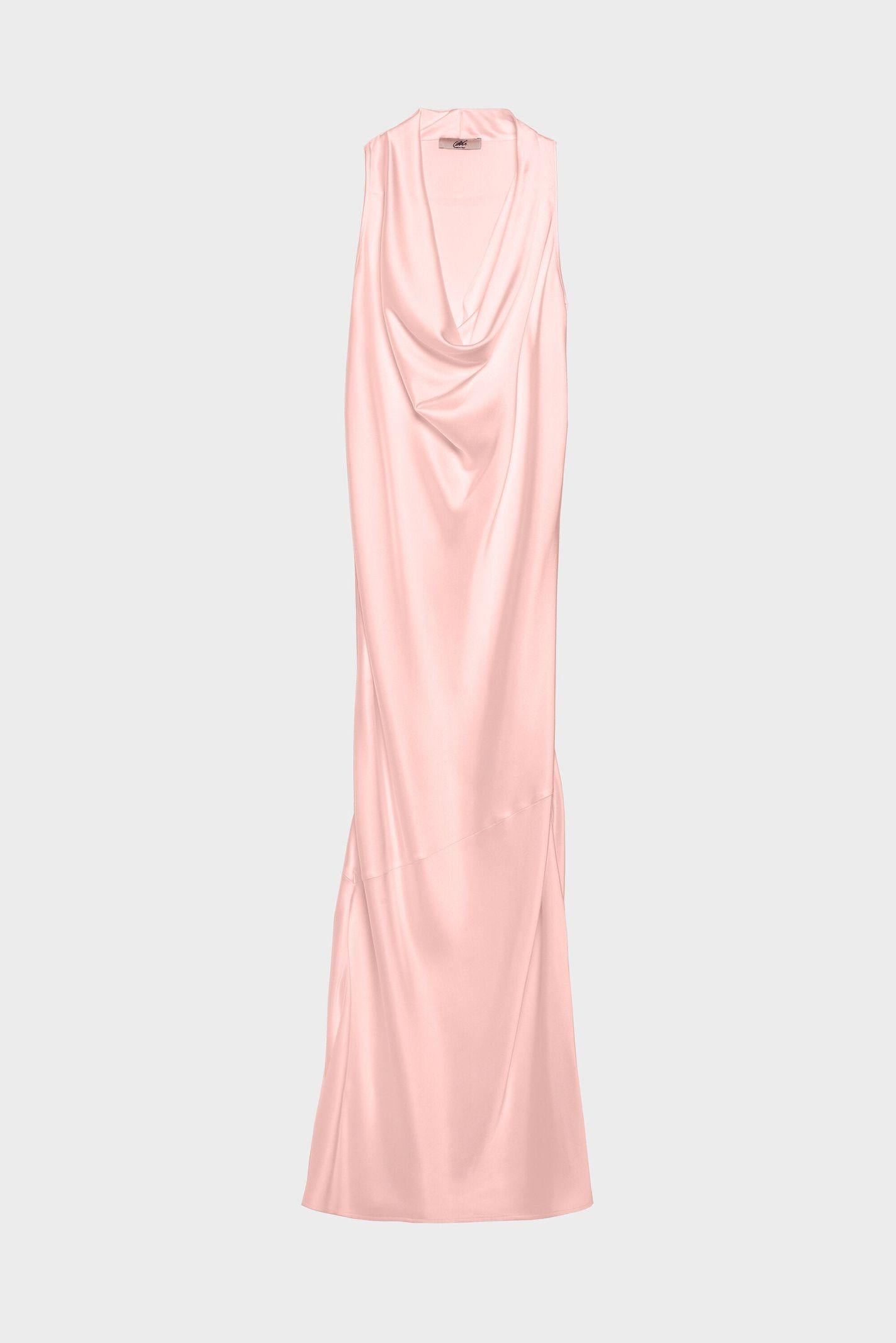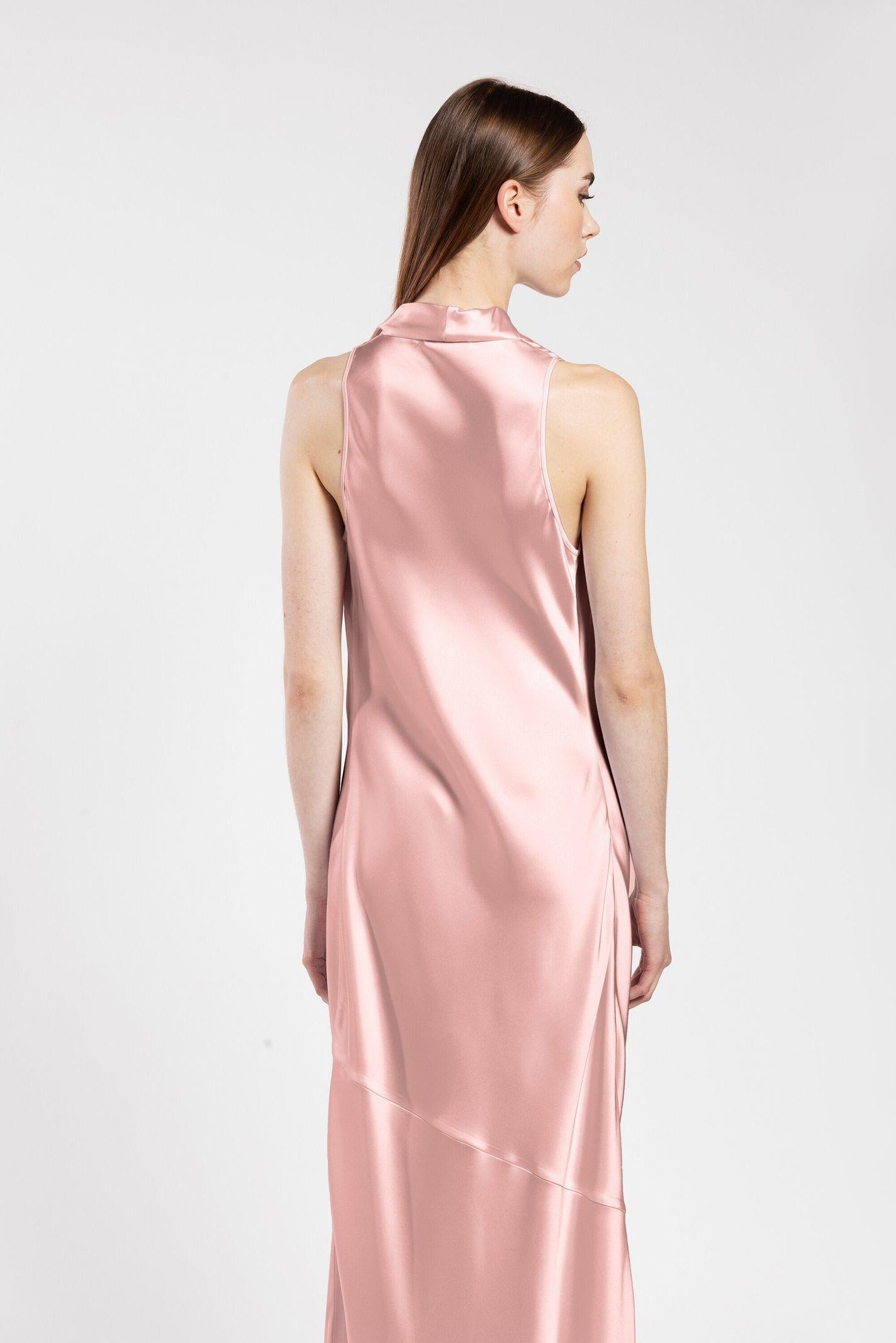 Abito lungo smanicato, realizzato in tessuto raso elasticizzato con scollatura a cappuccio, una linea a sirena, ed una lunghezza alla caviglia.