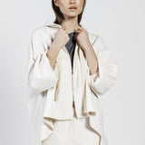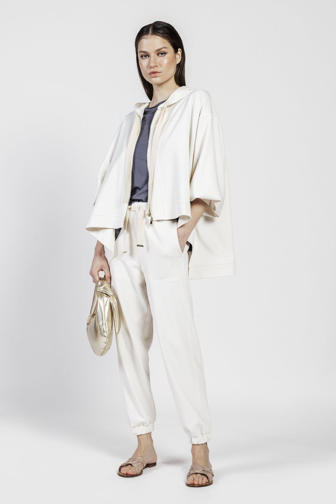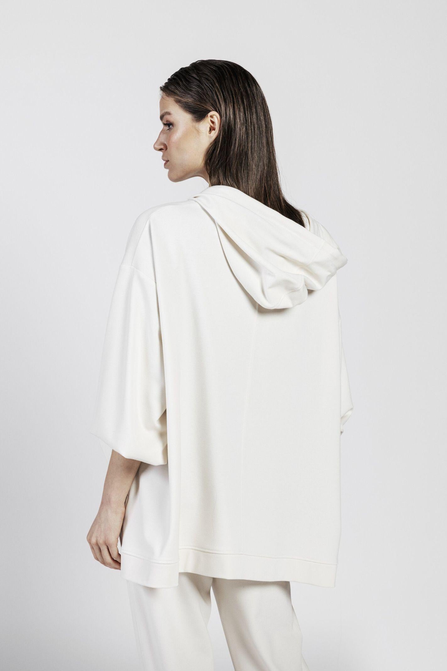 Maglia felpa con cappuccio, realizzata in tessuto maglia elasticizzata, un cappuccio con coulisse interna e fettuccia, una lampo centrale a vista in metallo dorato, maniche lunghe con polsini e pieghe, un fondo più corto davanti che crea drappeggio, dalla linea over, ed una lunghezza sopra ai fianchi.