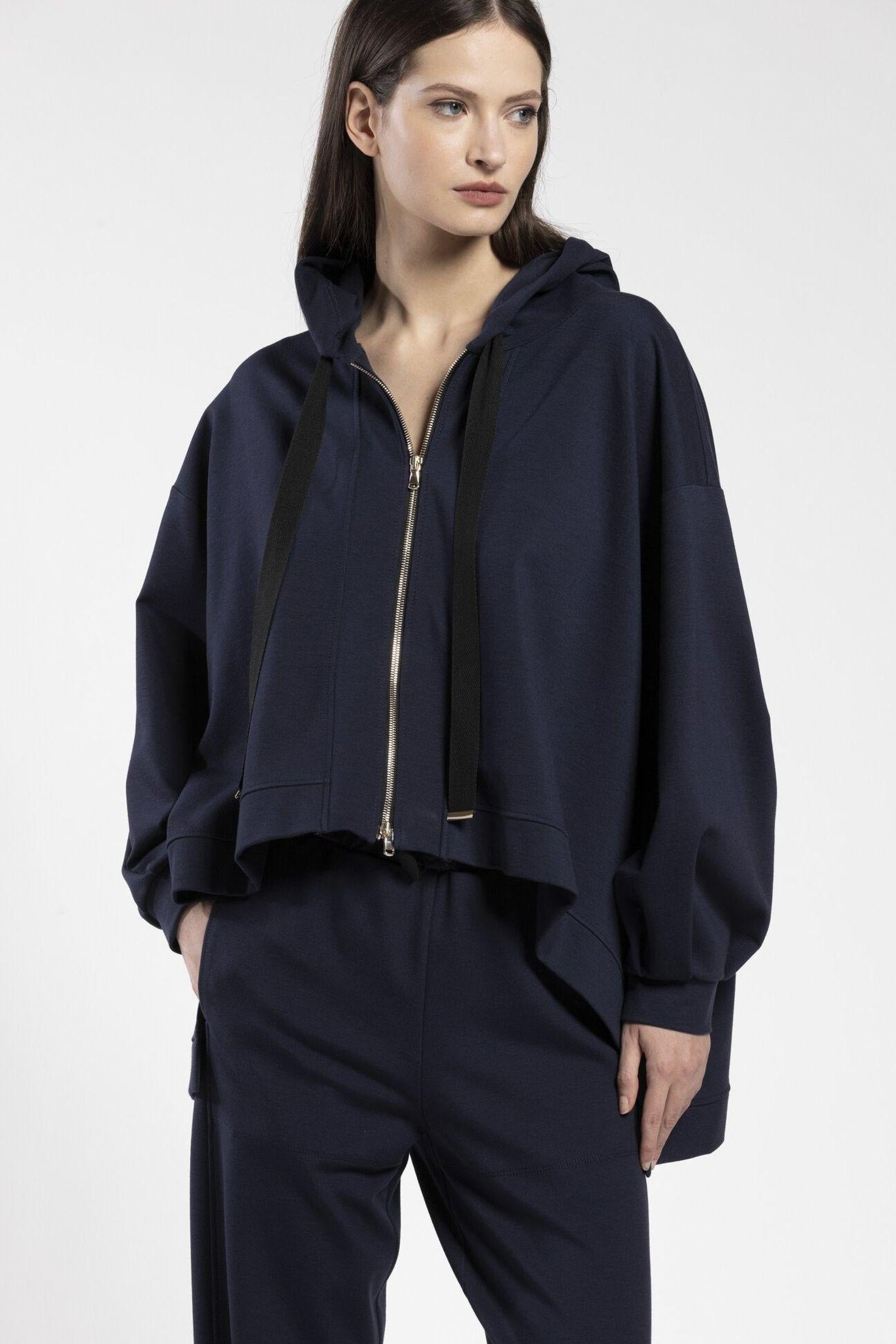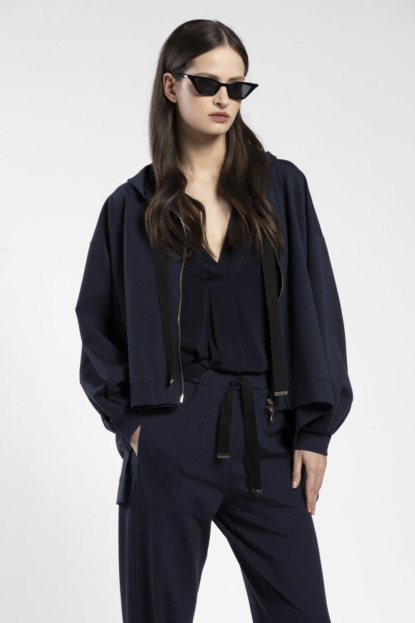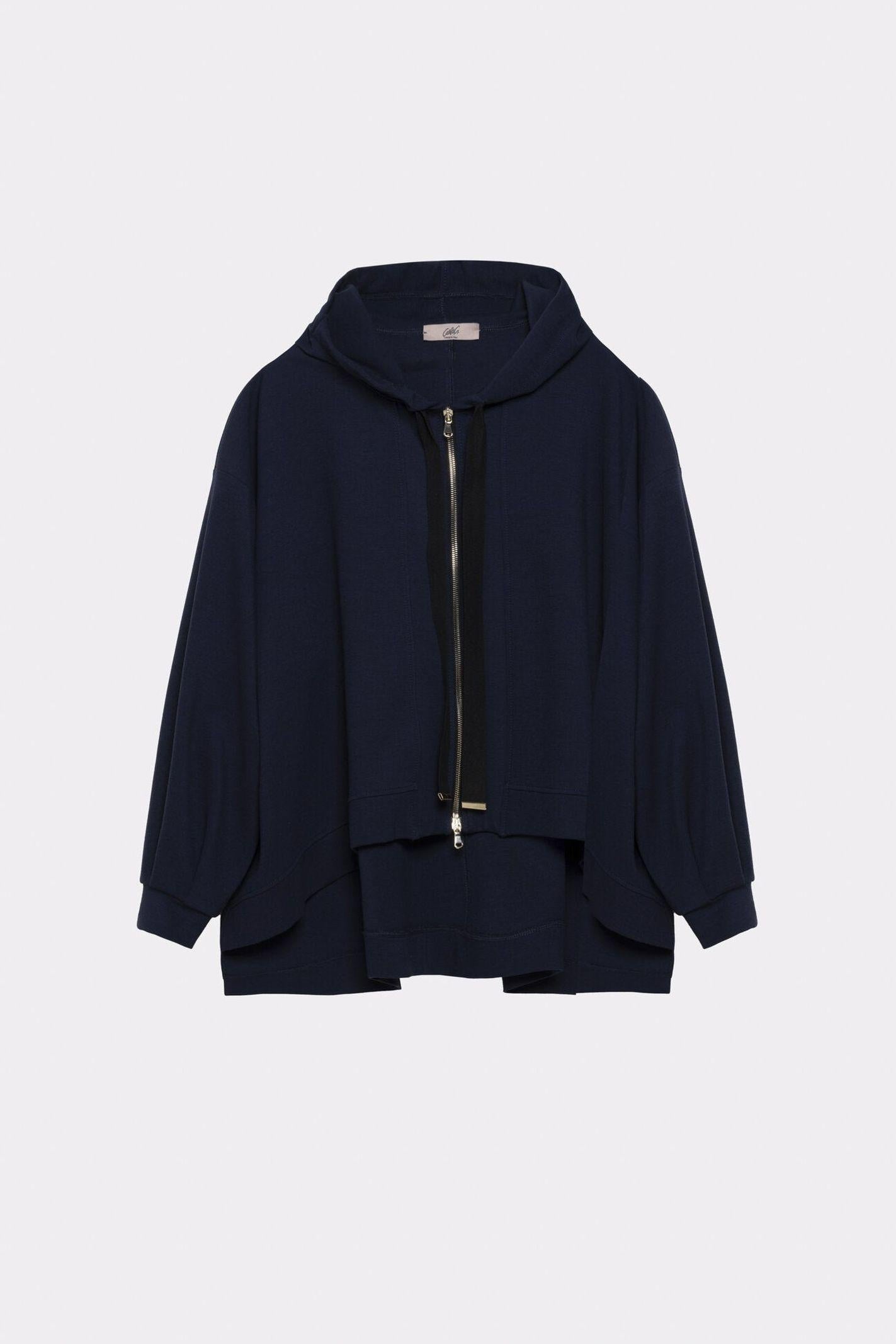 Maglia felpa con cappuccio, realizzata in tessuto maglia elasticizzata, un cappuccio con coulisse interna e fettuccia, una lampo centrale a vista in metallo dorato, maniche lunghe con polsini e pieghe, un fondo più corto davanti che crea drappeggio, dalla linea over, ed una lunghezza sopra ai fianchi.