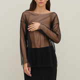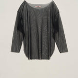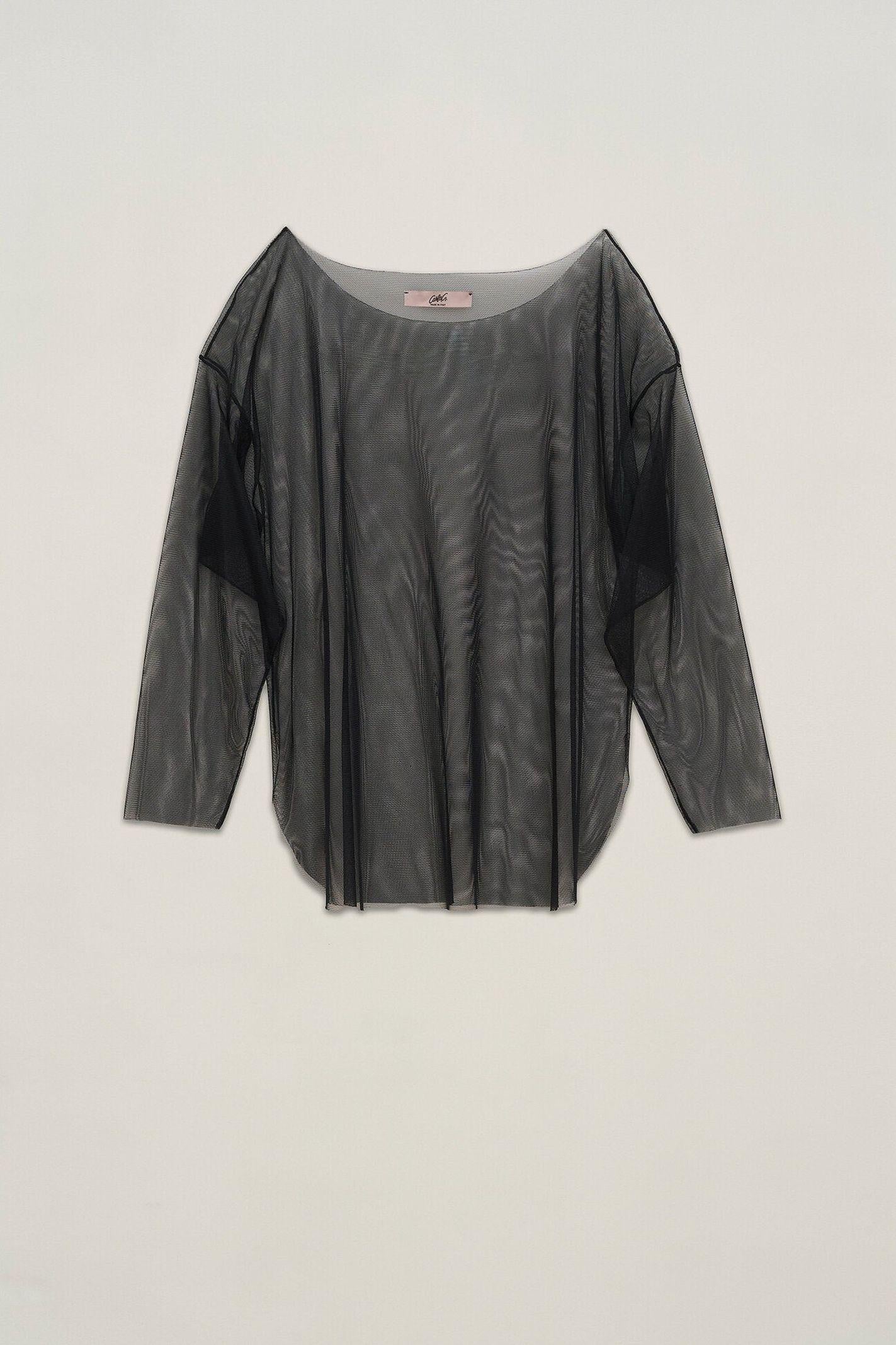 Maglia in tulle, dall'effetto trasparente, con scollatura rotonda, un giromanica sceso, un fondo leggermente stondato e spacchetti laterali. Ha una lunghezza sotto ai fianchi.