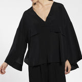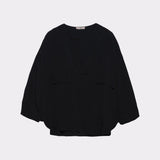 Maglia oversize realizzata in tessuto crepe de chine con scollo a V davanti e rotondo dietro, patte effetto tasche sul petto, fondo stondato, spacchi laterali e la parte anteriore leggermente più corta e una lunghezza sotto ai fianchi.