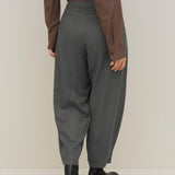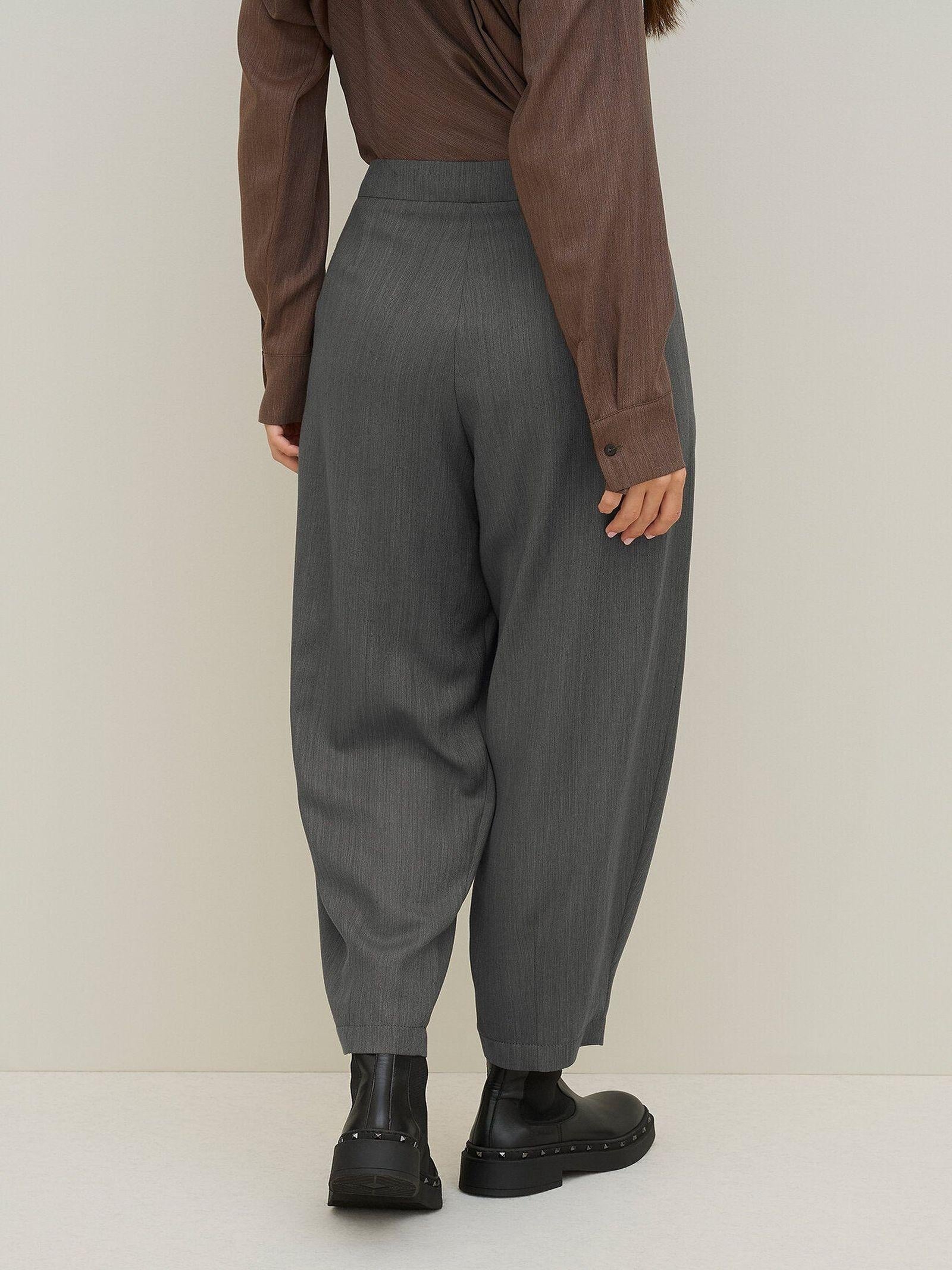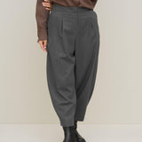 Pantalone morbido in garza di lana, con vita e cavallo basso, tasche alla francese riprese sul fondo, e una chiusura con gancetto frontale e una lampo nascosta, ed pinces davanti.