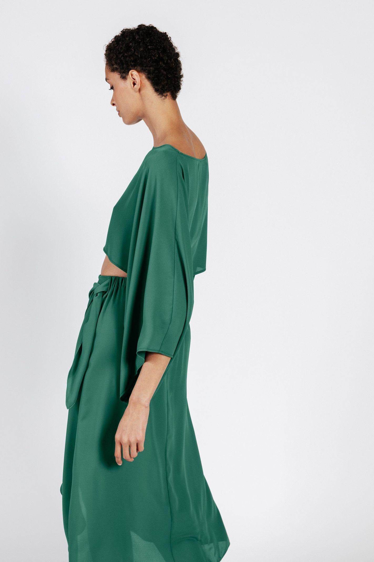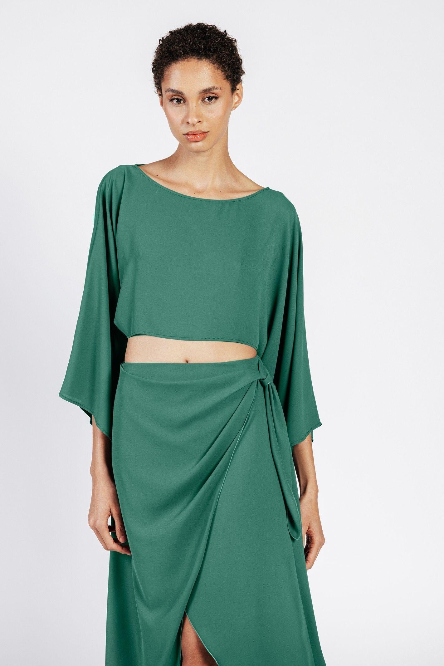 Maglia realizzata in crepe, con scollo a barchetta e caratterizzata da maniche ampie a pipistrello, una linea morbida e una lunghezza sopra ai fianchi.
