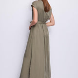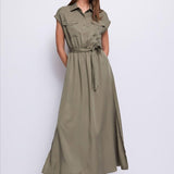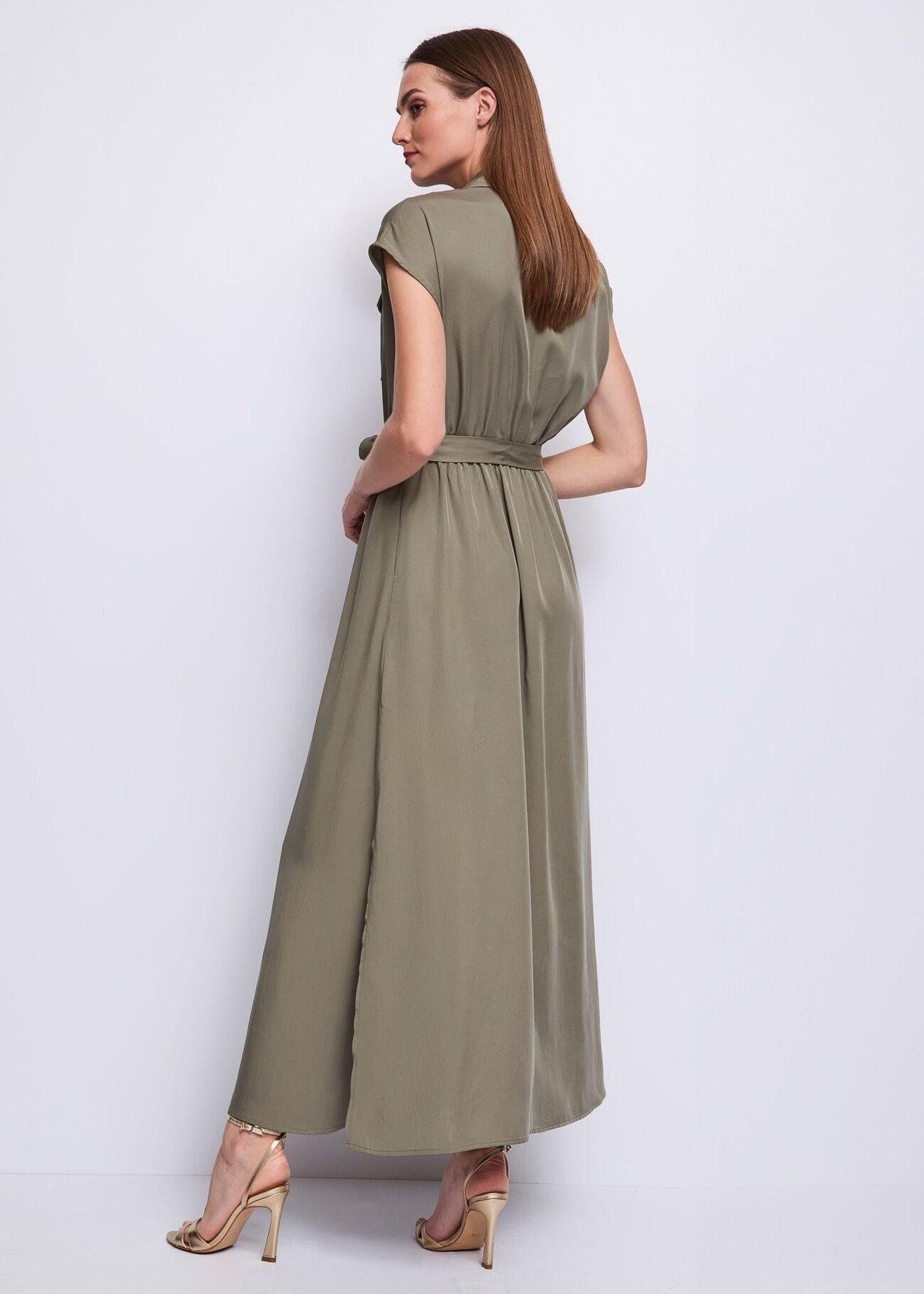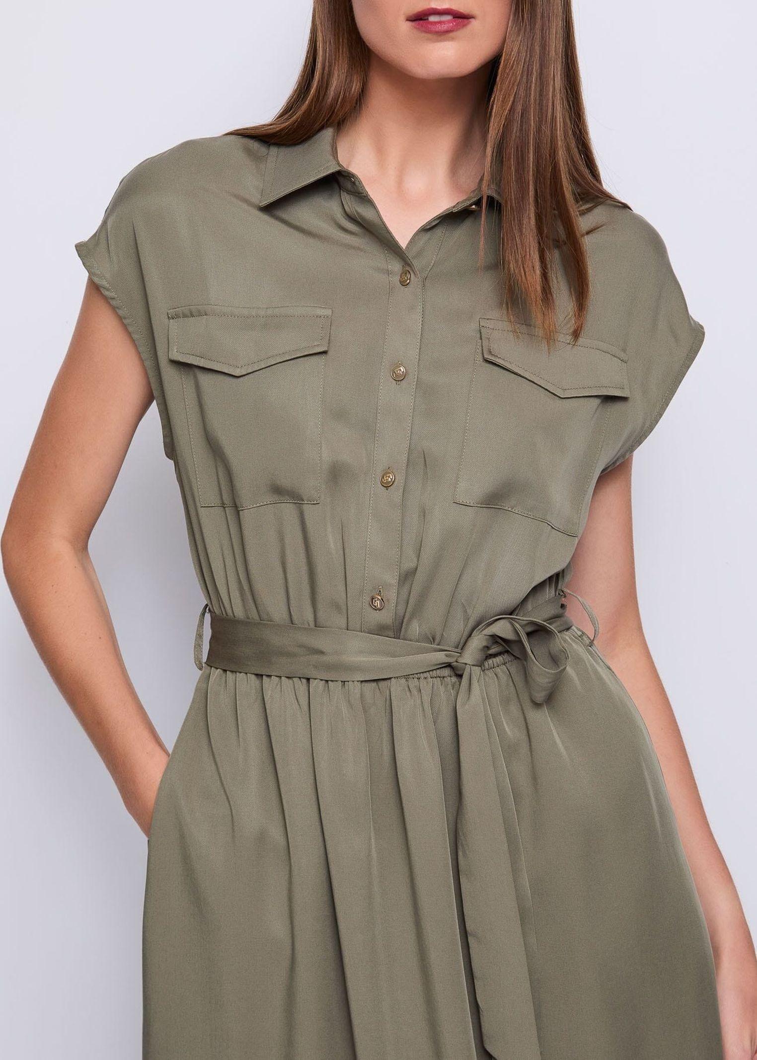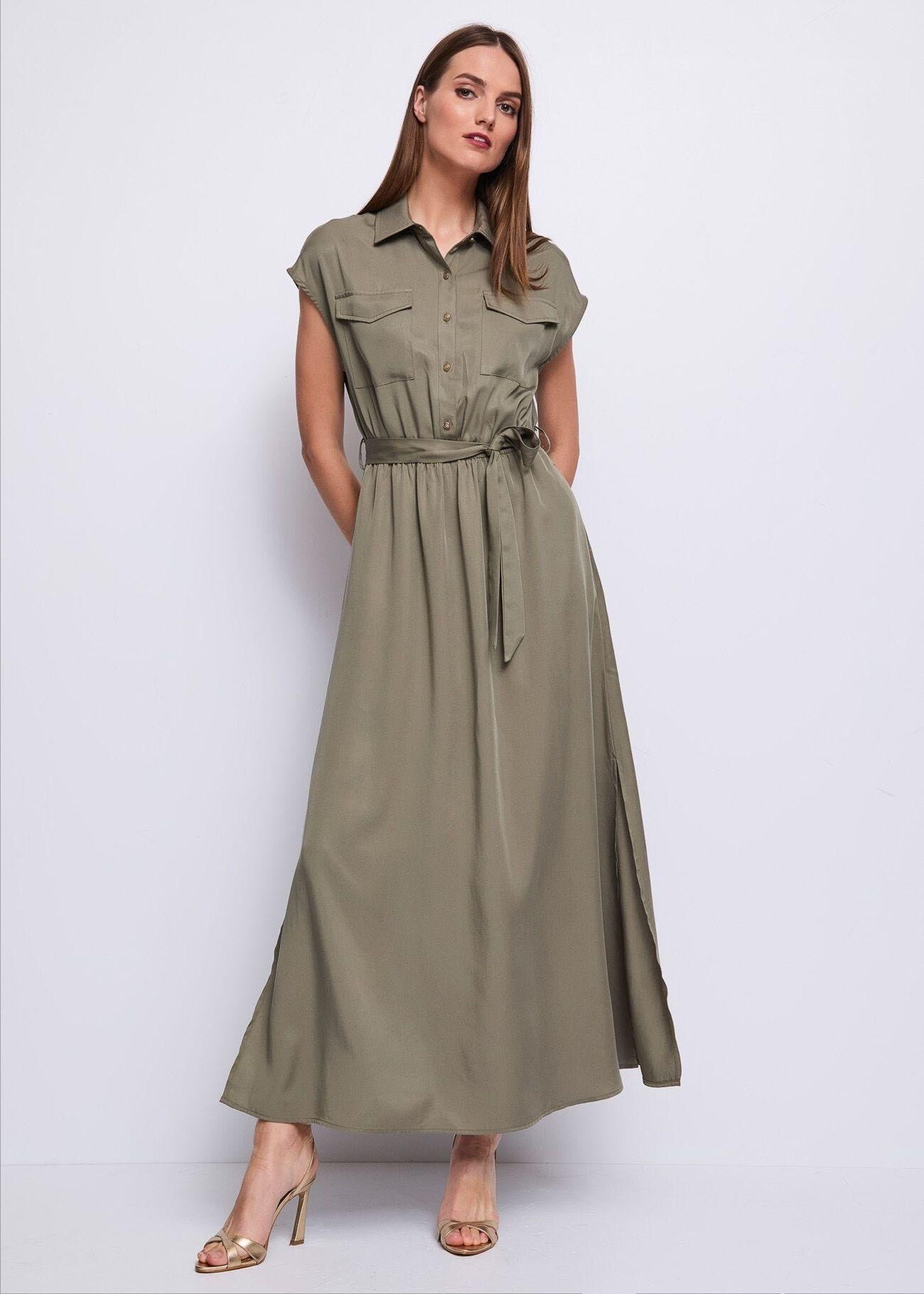 Abito lungo chemisier realizzato in lyocell caratterizzato da una fusciacca in tinta annodata in vita, removibile con passanti in vita, tasche con patta applicate sul petto, colletto a camicia e maniche corte, spacco laterale, lunghezza alla caviglia.