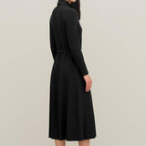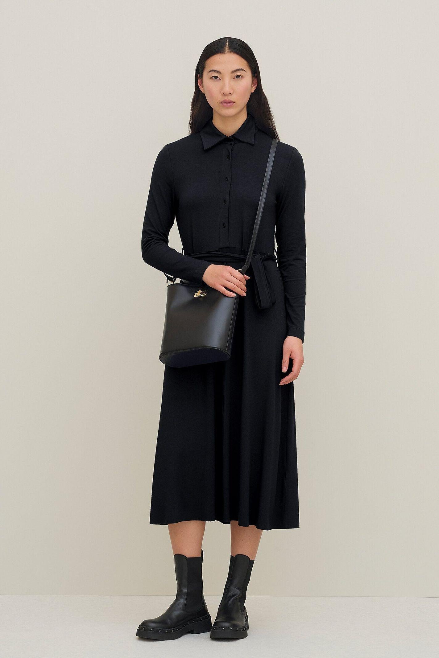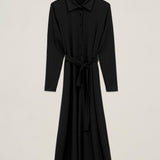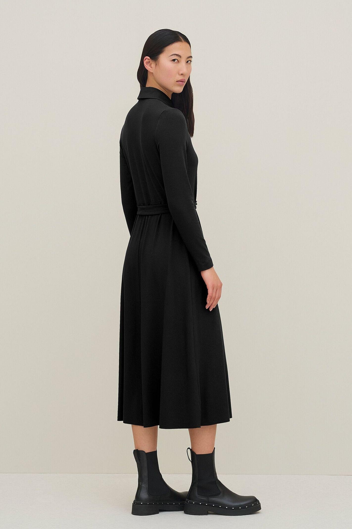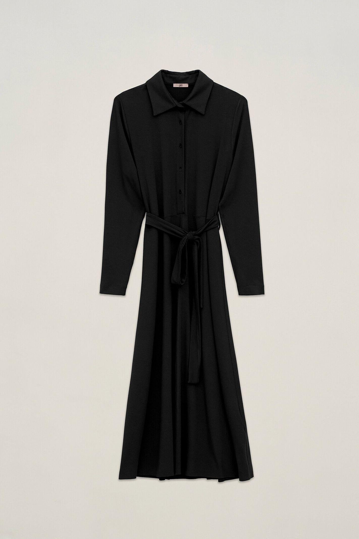 Abito midi chemisier svasato, in tessuto jersey elasticizzato, con colletto classico e allacciatura frontale con bottoni in madreperla, passanti in vita e una cintura a nastro. Ha una linea svasata e lunghezza sotto al ginocchio.