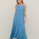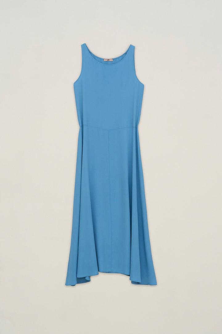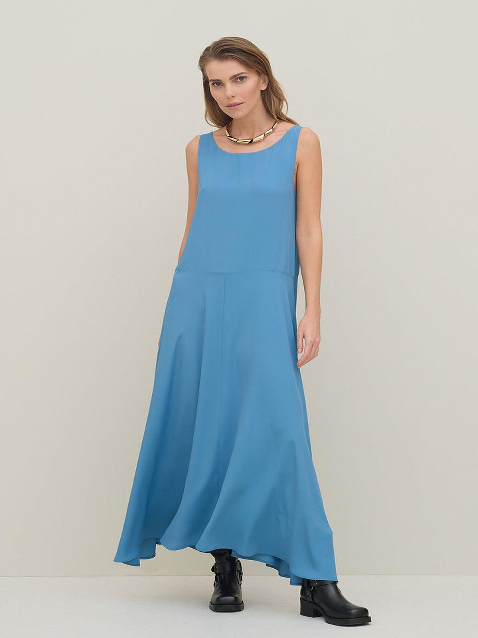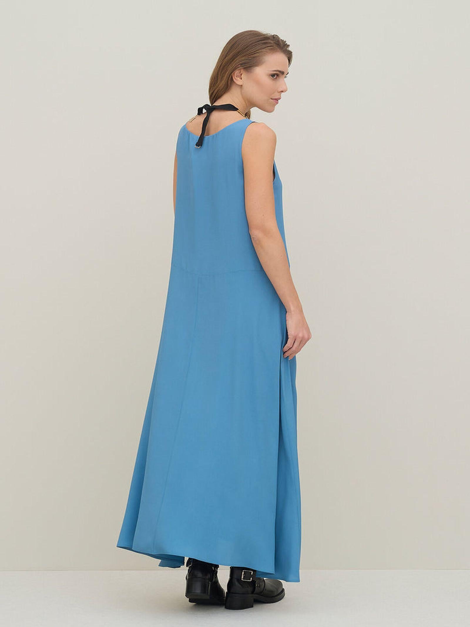Abito lungo smanicato realizzato in tessuto crepe de chine, dalla vestibiltà svasata, con una scollatura rotonda e lunghezza alle caviglie.