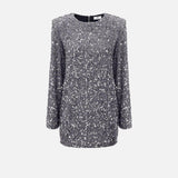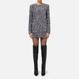 Abito corto boxy realizzato in ciniglia ricamata con paillettes, a maniche lunghe con scollo a giro, caratterizzato da spalle strutturate e design che chiude leggermente al fondo, spalline imbottite, zip invisibile sul retro.