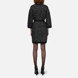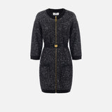 Abito corto realizzato in tessuto misto lana con filo paillettes a maniche tre quarti ampie con profili in contrasto colore, caratterizzato da chiusura con zip nel centro davanti e da una cintura removibile in elastico logata lucida con fibbia logata in metallo dorato.