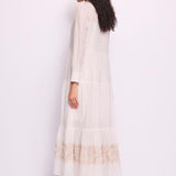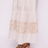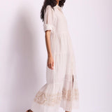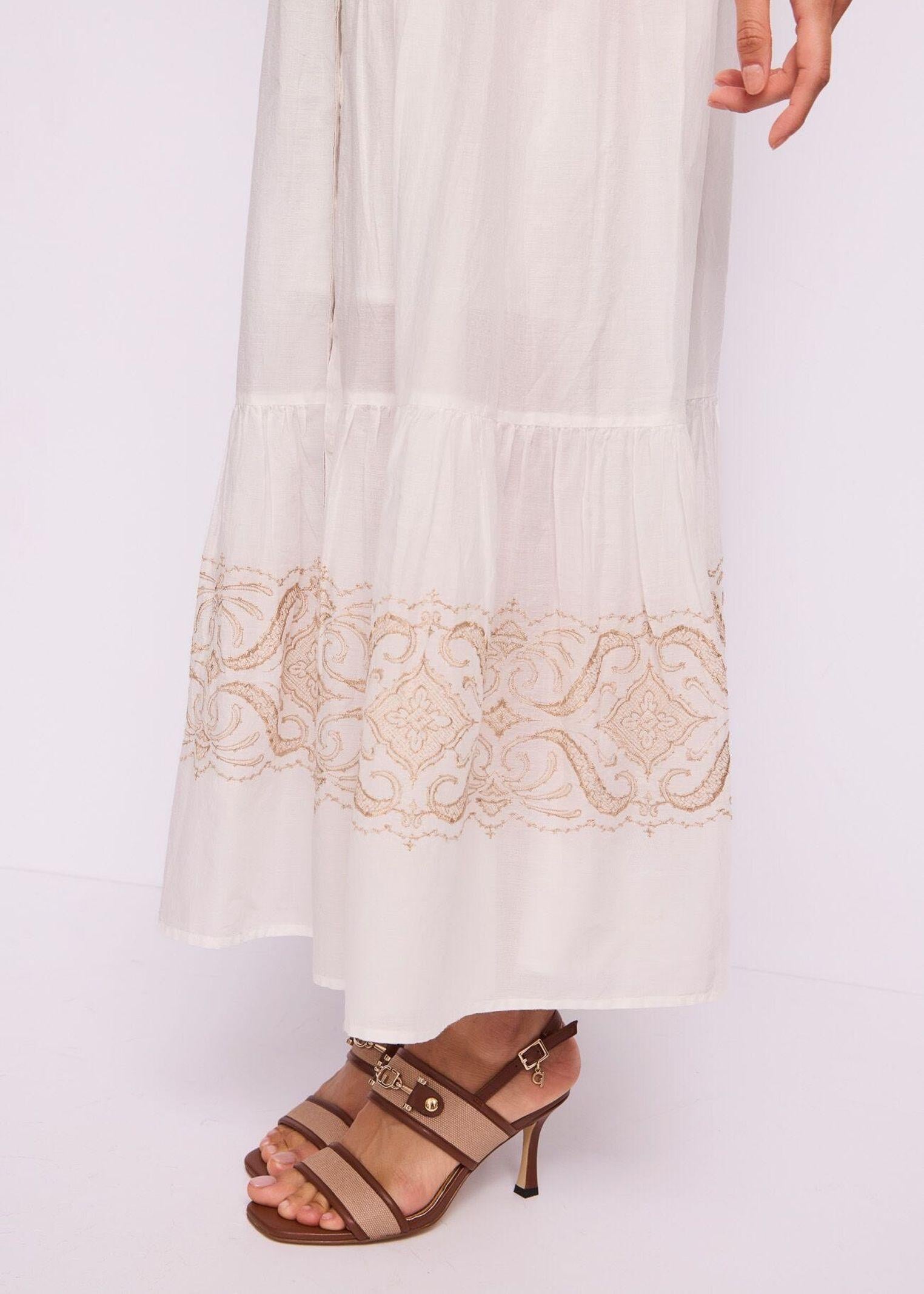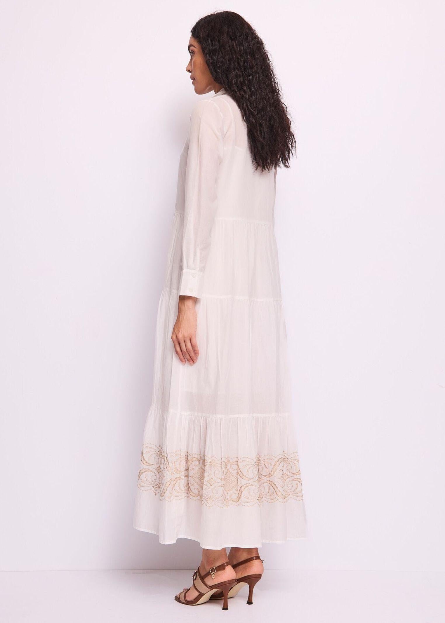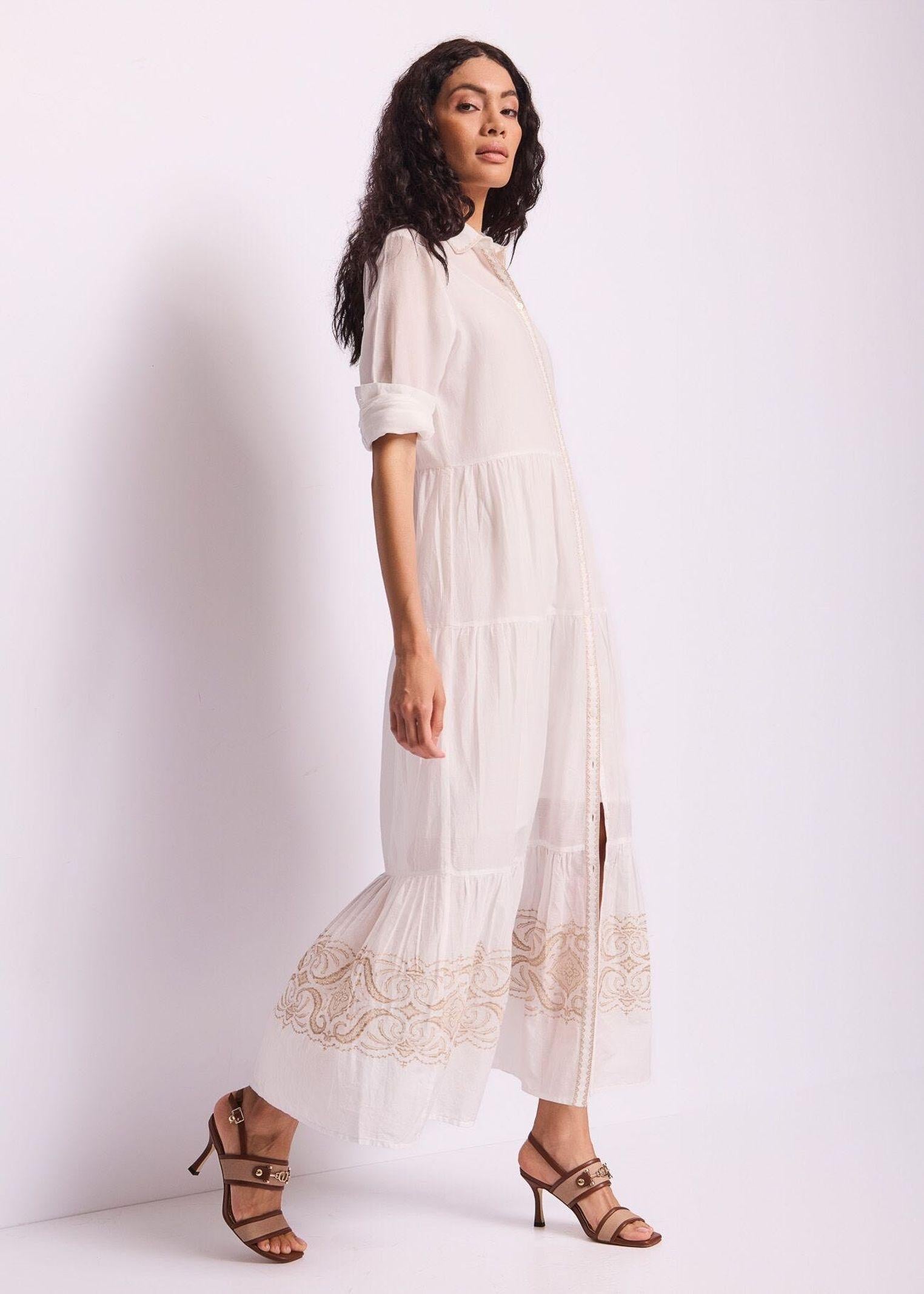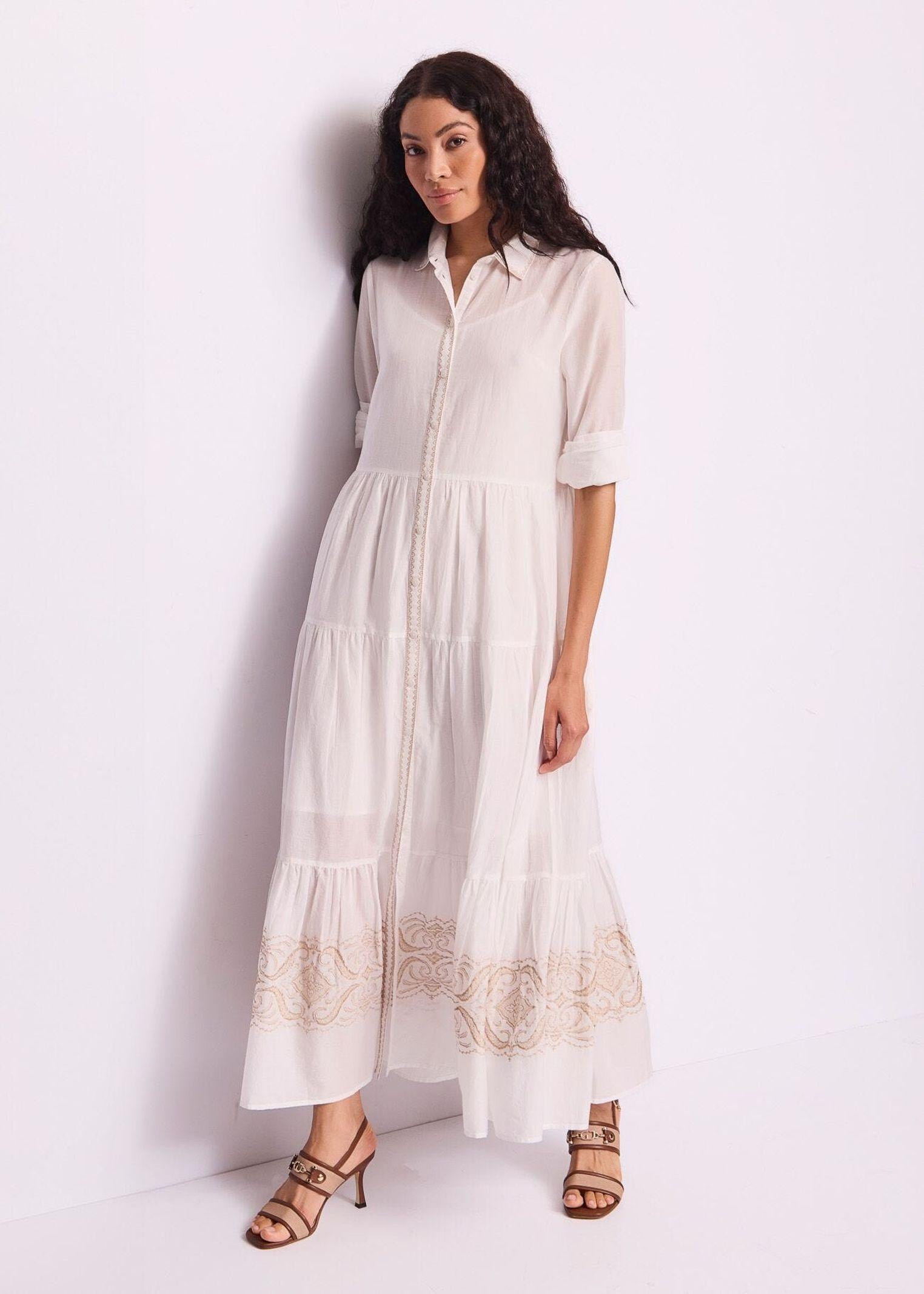 Abito chemisier lungo a maniche lunghe, colletto a camicia, con una gonna a balze con ricamo al fondo e fodera interna in cotone. Ideale per un look fresco, estivo e versatile.