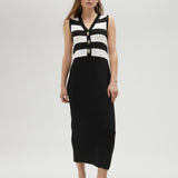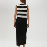 Abito lungo smanicato in maglia bicolore bianco e nero con spalline larghe e scollatura a V e chiusura centrale sul petto con bottoni dorati.