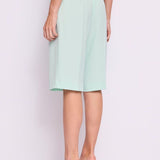 Bermuda con pinces in vita e cerniera nascosta laterale, tasche a filetto, lunghezza al ginocchio. La sua vestibilità ampia lo rende molto moderno e armonioso.