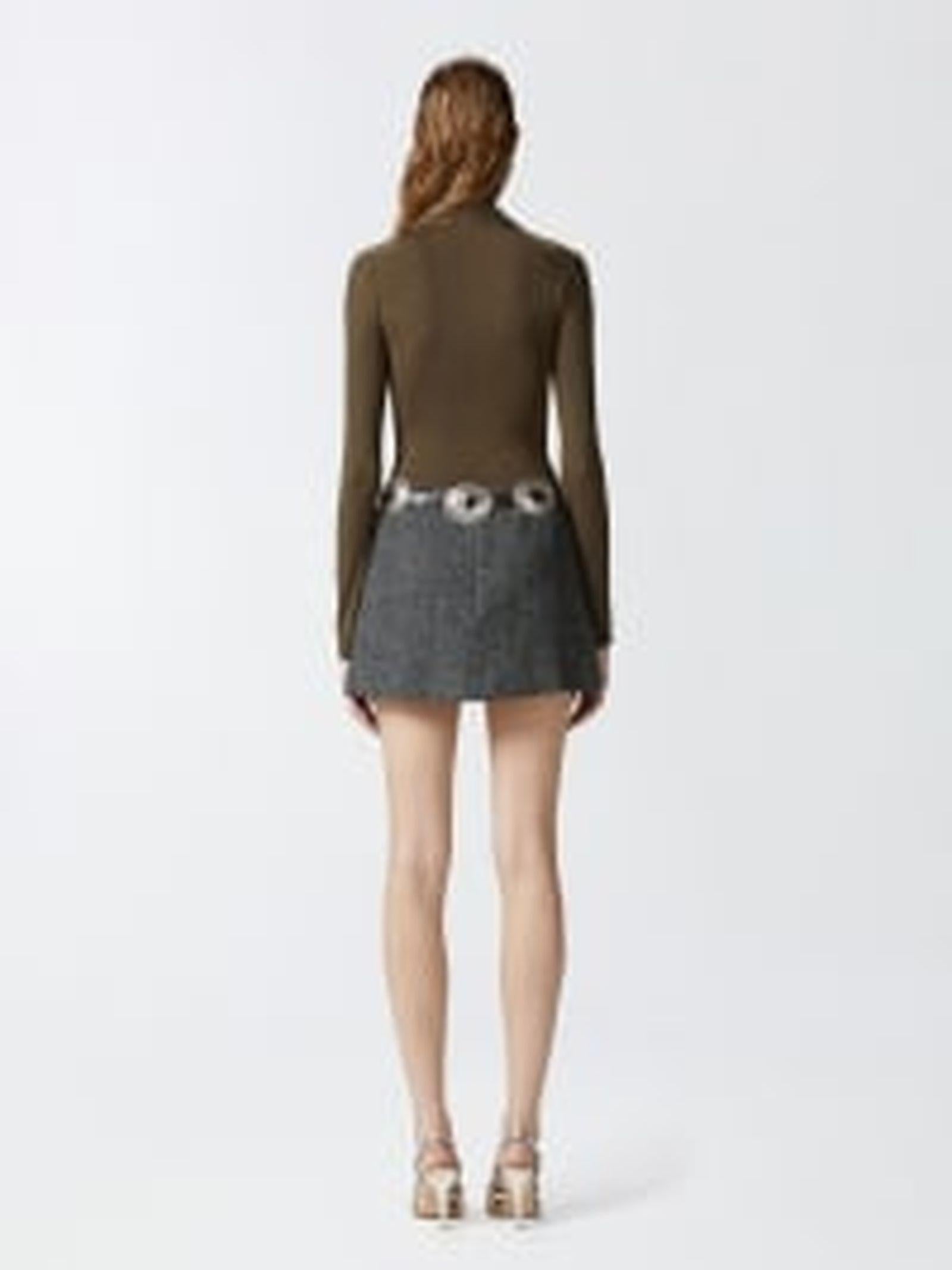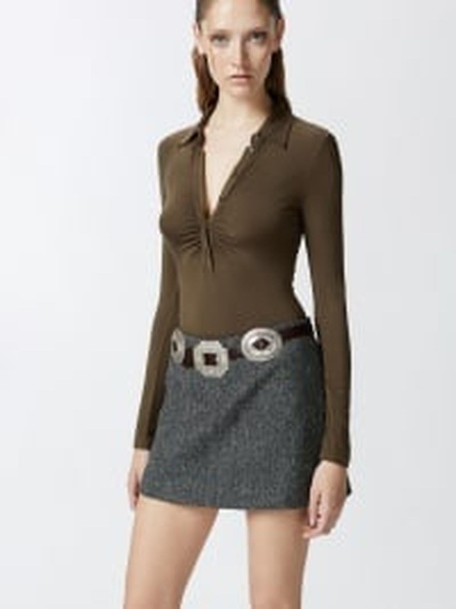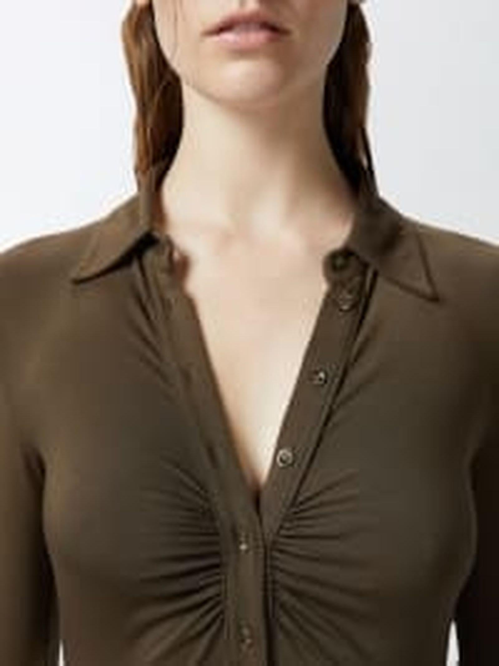 Body dalla vestibilità aderente, a maniche lunghe, realizzato in tessuto jersey modal stretch dalla particolare mano calda, che lascia una piacevole sensazione sulla pelle. La linea a polo è caratterizzata da colletto e abbottonatura davanti, con un legero motivo arriccio.