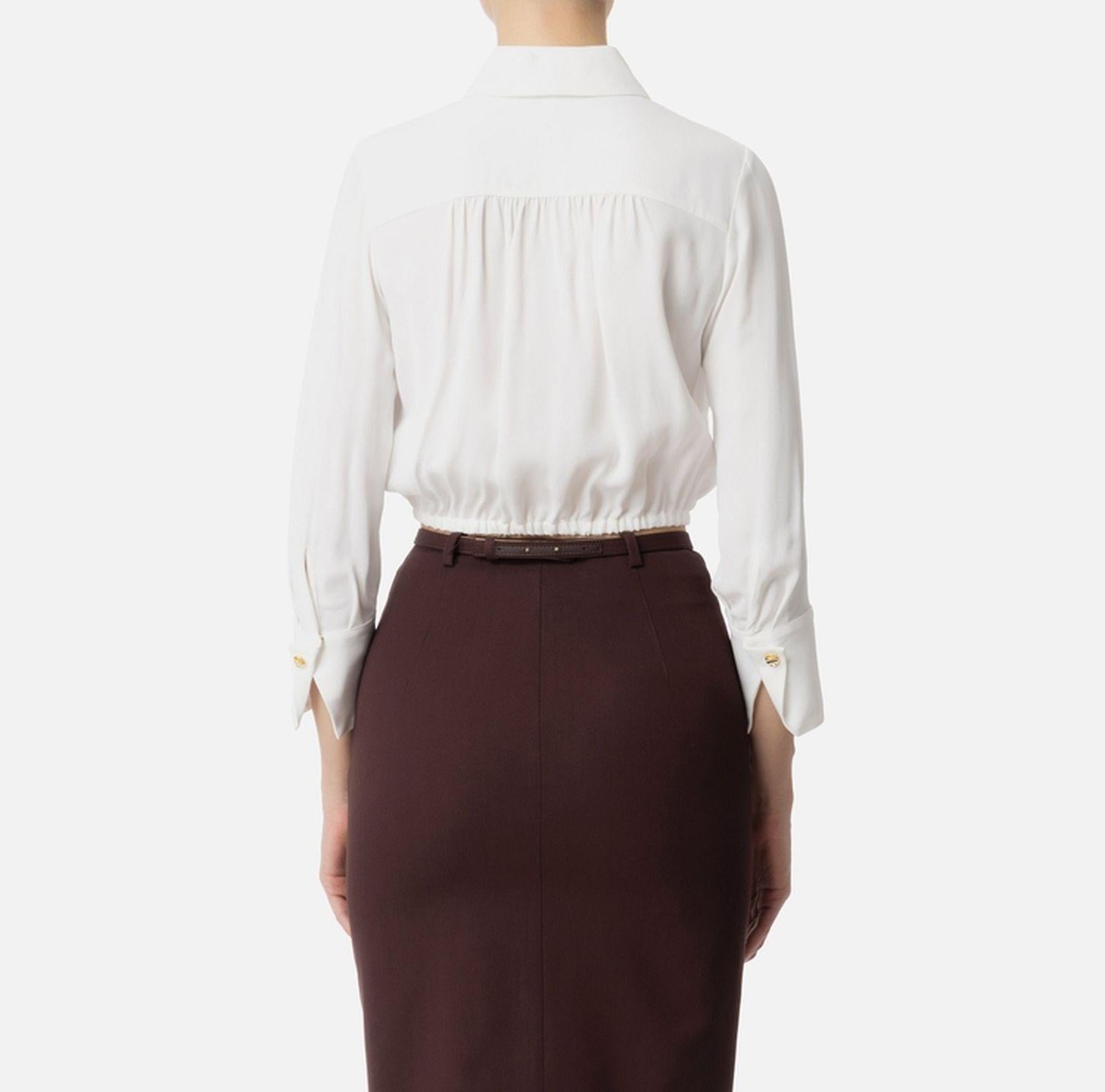 Camicia in georgette di viscosa con vestibiltà slim cropped e un elastico al fondo. Questa camicia ha le maniche tre quarti e il focus sul taschino applicato e impreziosito dall'etichetta traforata con logo ricamato in filo. Ha bottoni in metallo dorato con logo e una chiusura nascosta.