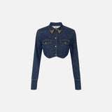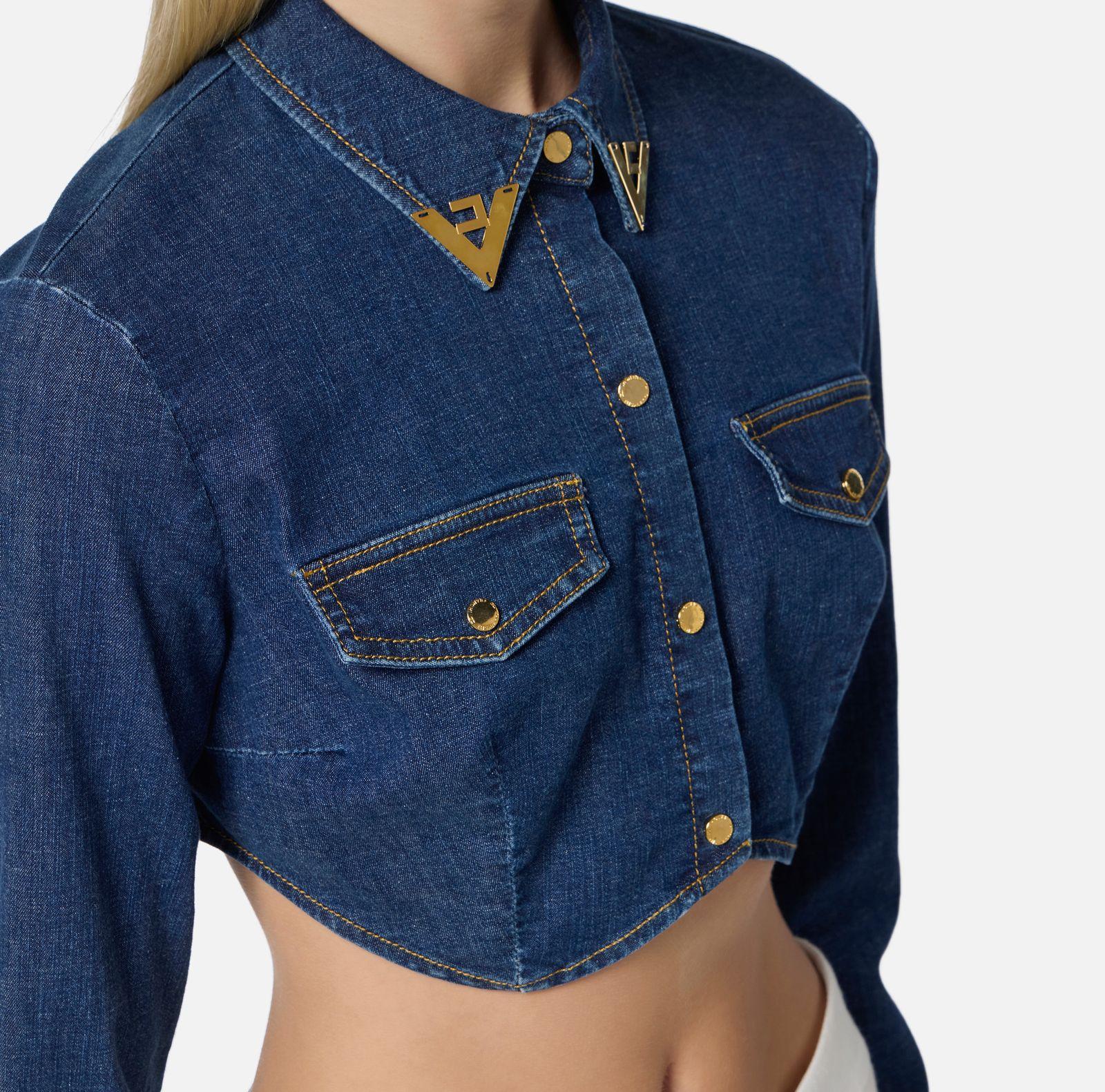 Camicia cropped in denim con colletto impreziosito da dettagli gioiello logati in metallo dorato e maniche lunghe. Un fondo ispirato alla linea dei bustier con patte applicate e chiusura frontale con bottoni a pressione coordinati.