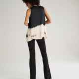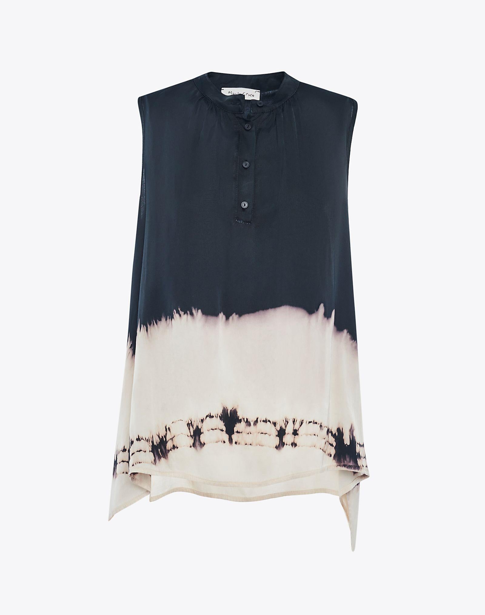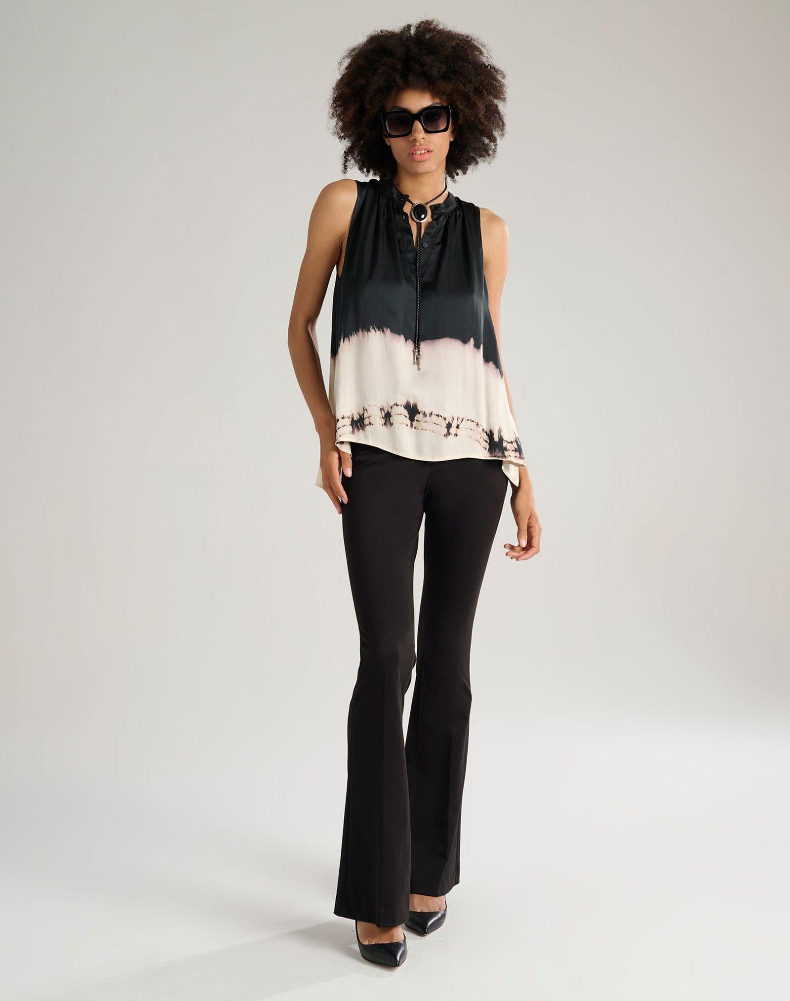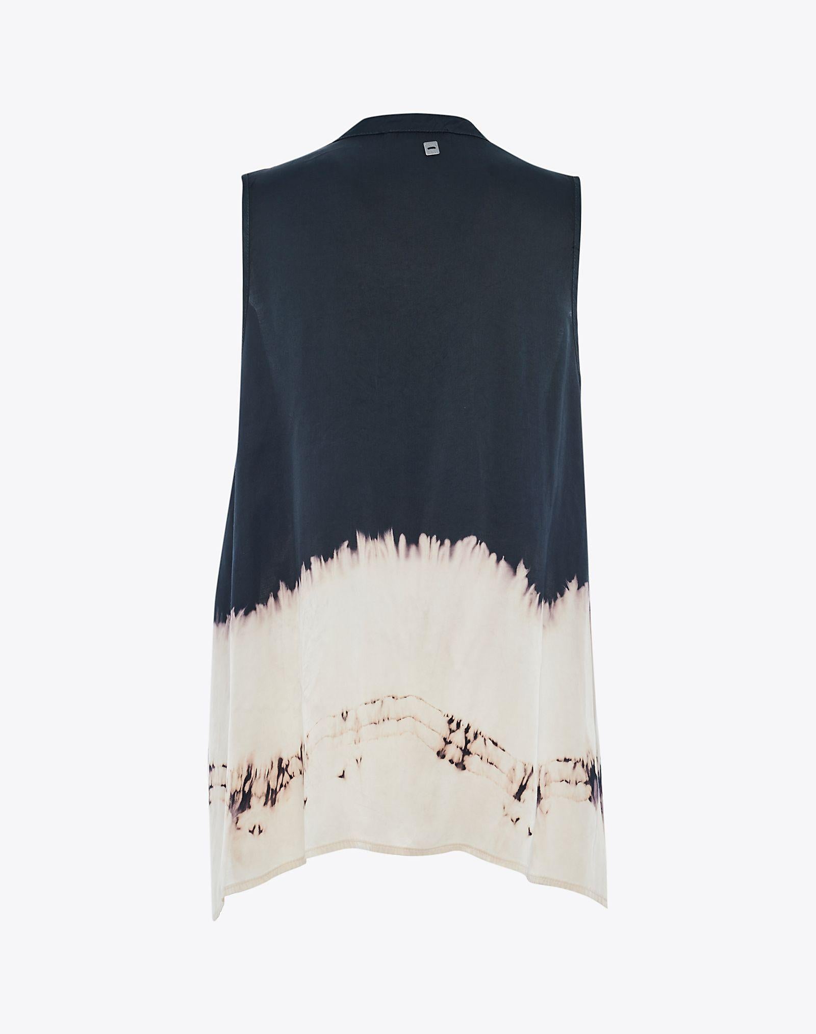 Blusa senza maniche, realizzata in raso, caratterizzata da un vivace motivo tie-dye, una vestibilità svasata, colletto in stile polo e abbottonatura frontale che donano un'eleganza casual e sofisticata.