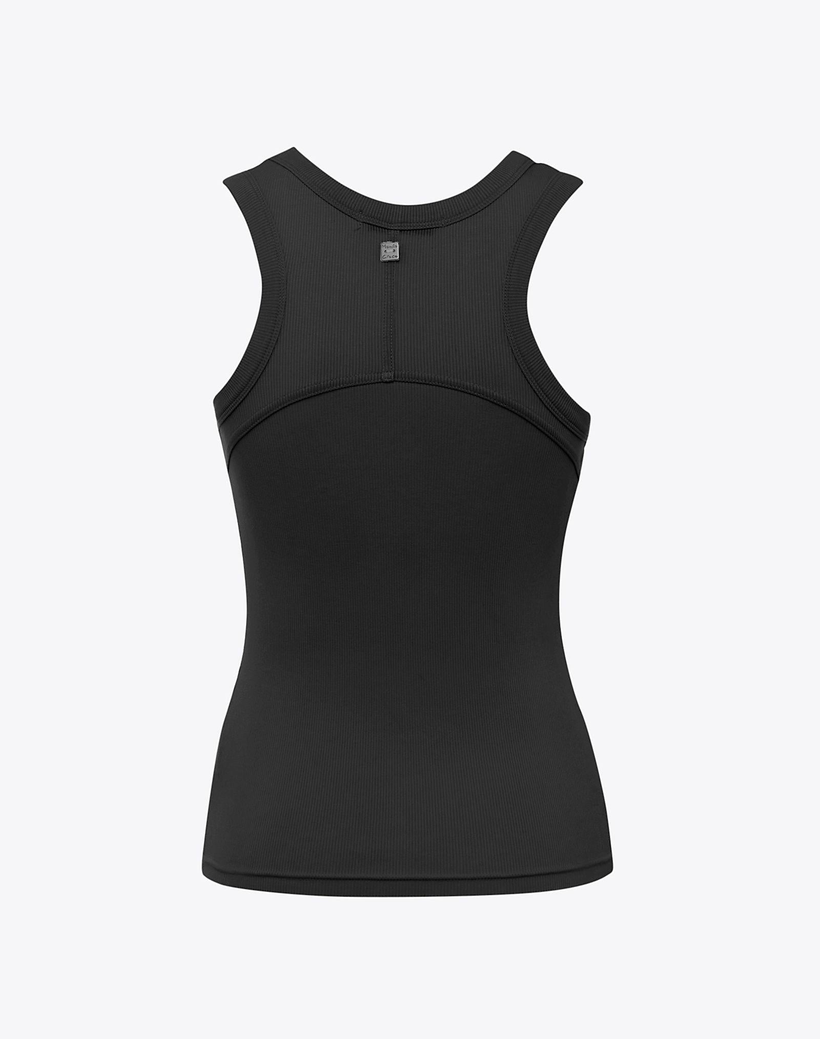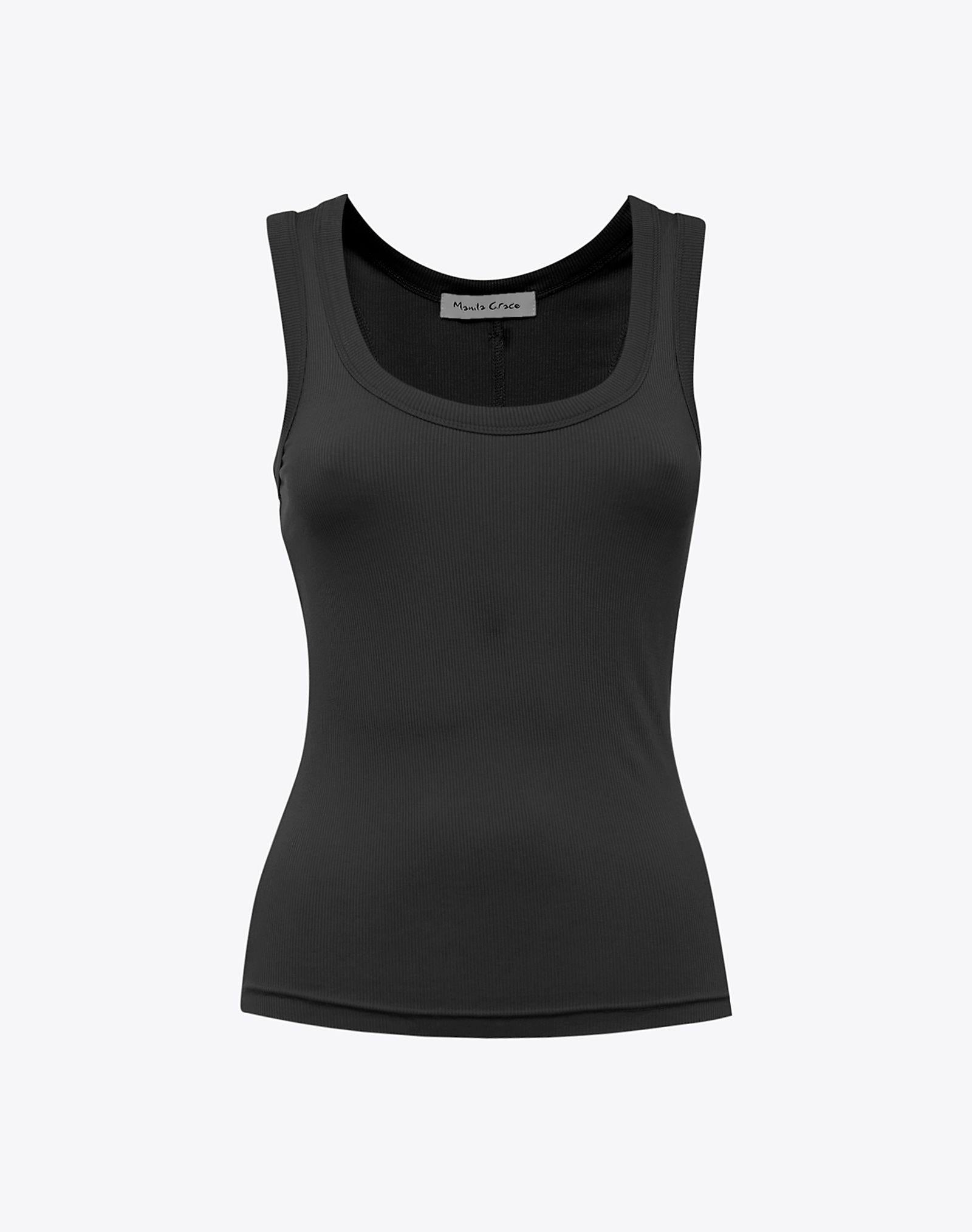 Canotta realizzata in costina di viscosa con scollo olimpico posteriore, e rifiniture a costine strette, ideale indossata ad un paio di jeans per un ottenere un look casual.