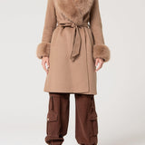 Cappotto regular in lana, caratterizzato da un collo sciallato, fusciacca in vita per chiusura, due tasche laterali a filetto, e con maniche lunghe con pelliccia al fondo, vestibilità regular ed una lunghezza al ginocchio.