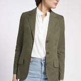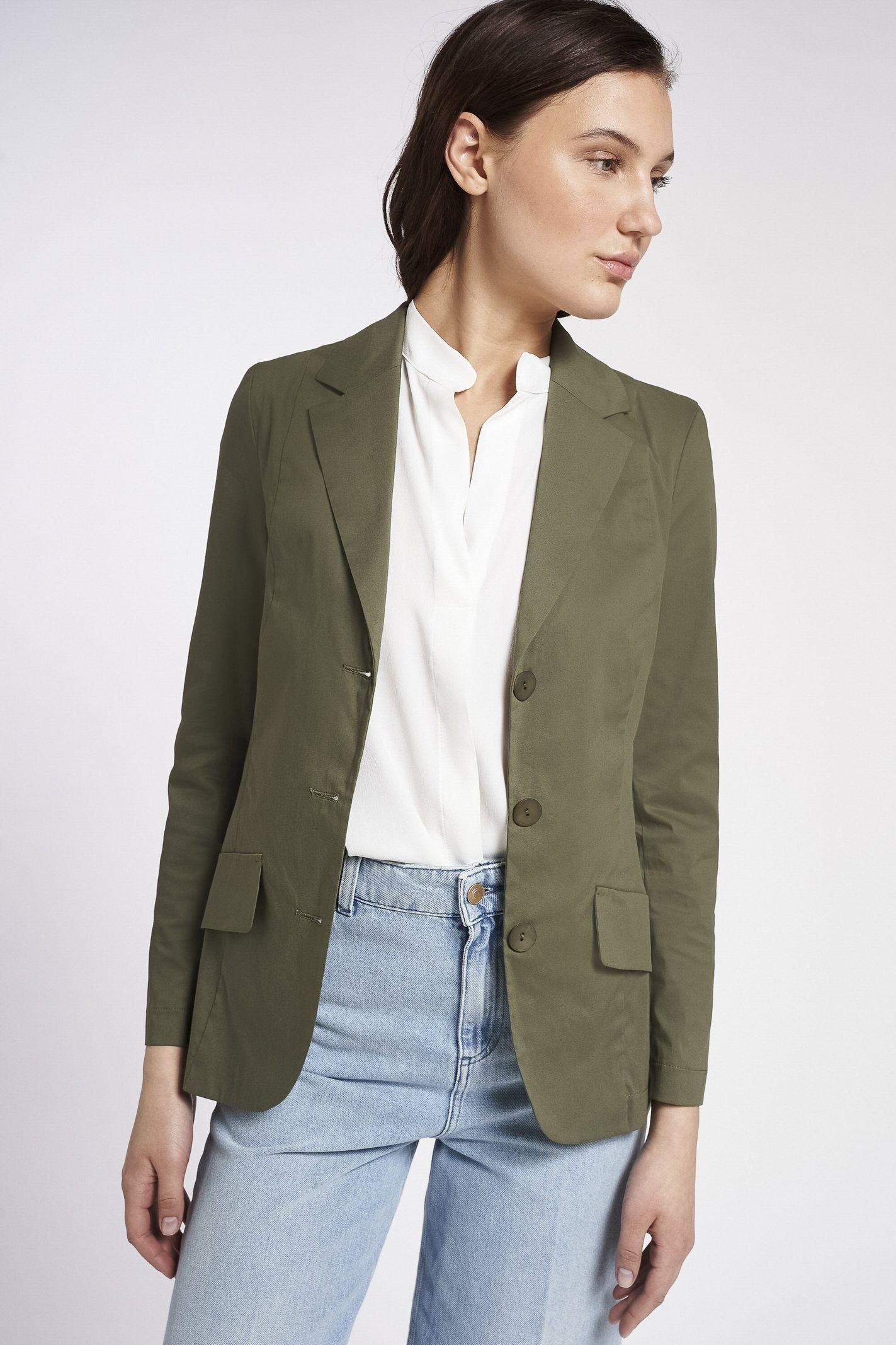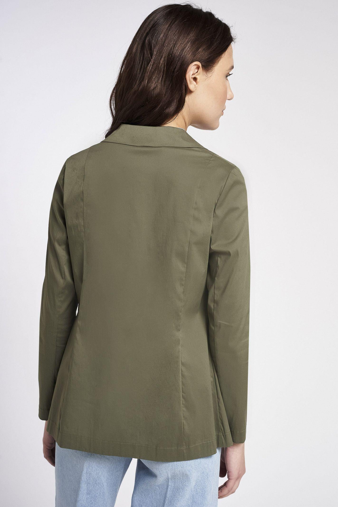 Giacca sfoderata realizzata in popeline elasticizzato, caratterizzata da collo a rever e allacciatura monopetto a tre bottoni madreperla, tasche con patte applicate, lunghezza sotto ai fianchi.