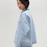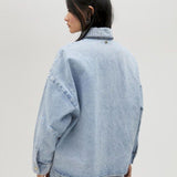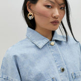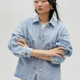Giacca camicia in denim lavaggio chiaro con tasche grandi applicate sul petto e impreziosito con strass e bottoni dorati con logo. Questa giacca dalla vestibilità ampia è perfetta per un look street urban.