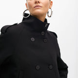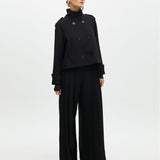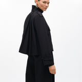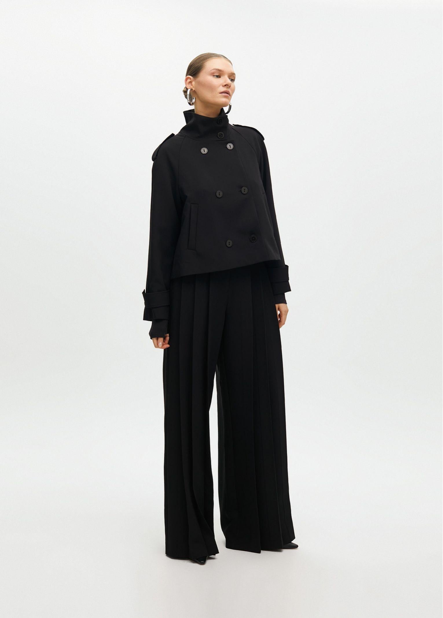 Giacca corta realizzata in tessuto premium con dettaglio plissettato sul retro. Design doppiopetto con spalline e tasche a filetto, collo alto. Perfetta da abbinare a pantaloni larghi.