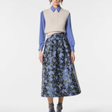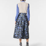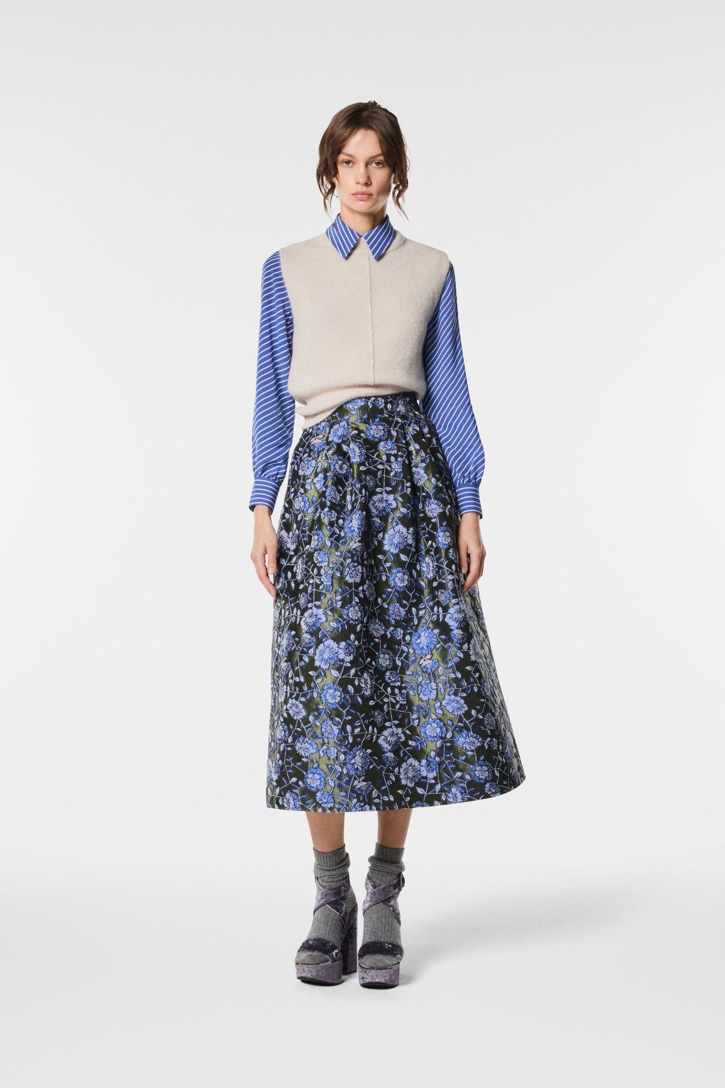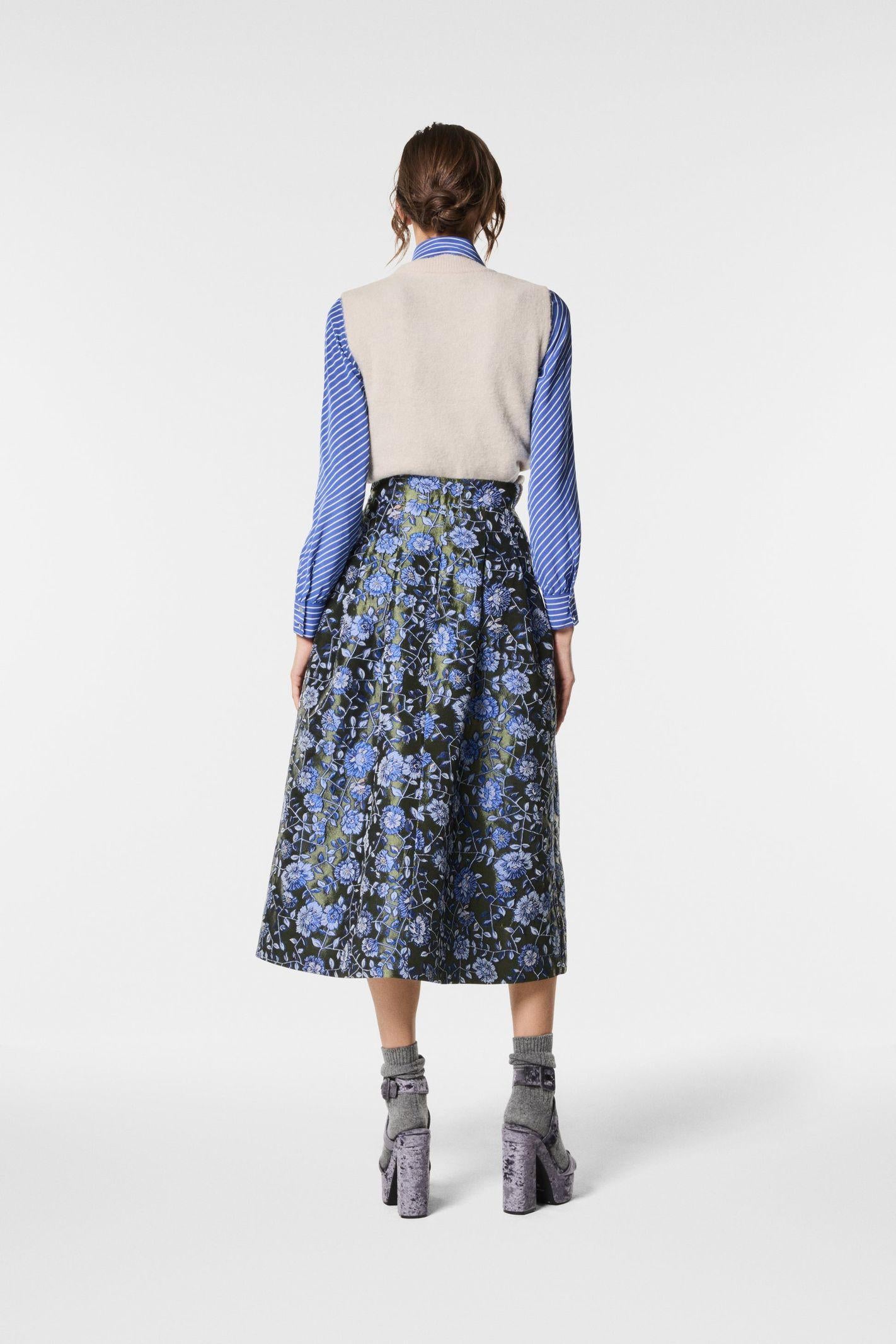 Gonna midi con pieghe in jacquard, dalla linea strutturata e femminile. Il tessuto ricco di texture valorizza il design, donando movimento ed eleganza. Un capo raffinato e versatile, perfetto per look curati e contemporanei con un tocco di classe senza tempo.