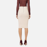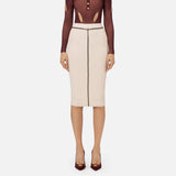 Gonna midi realizzata in misto viscosa punto resca, caratterizzata da una catena in metallo silver con bottone logato che enfatizza il punto vita e scende lungo il centro davanti, e una zip posteriore.