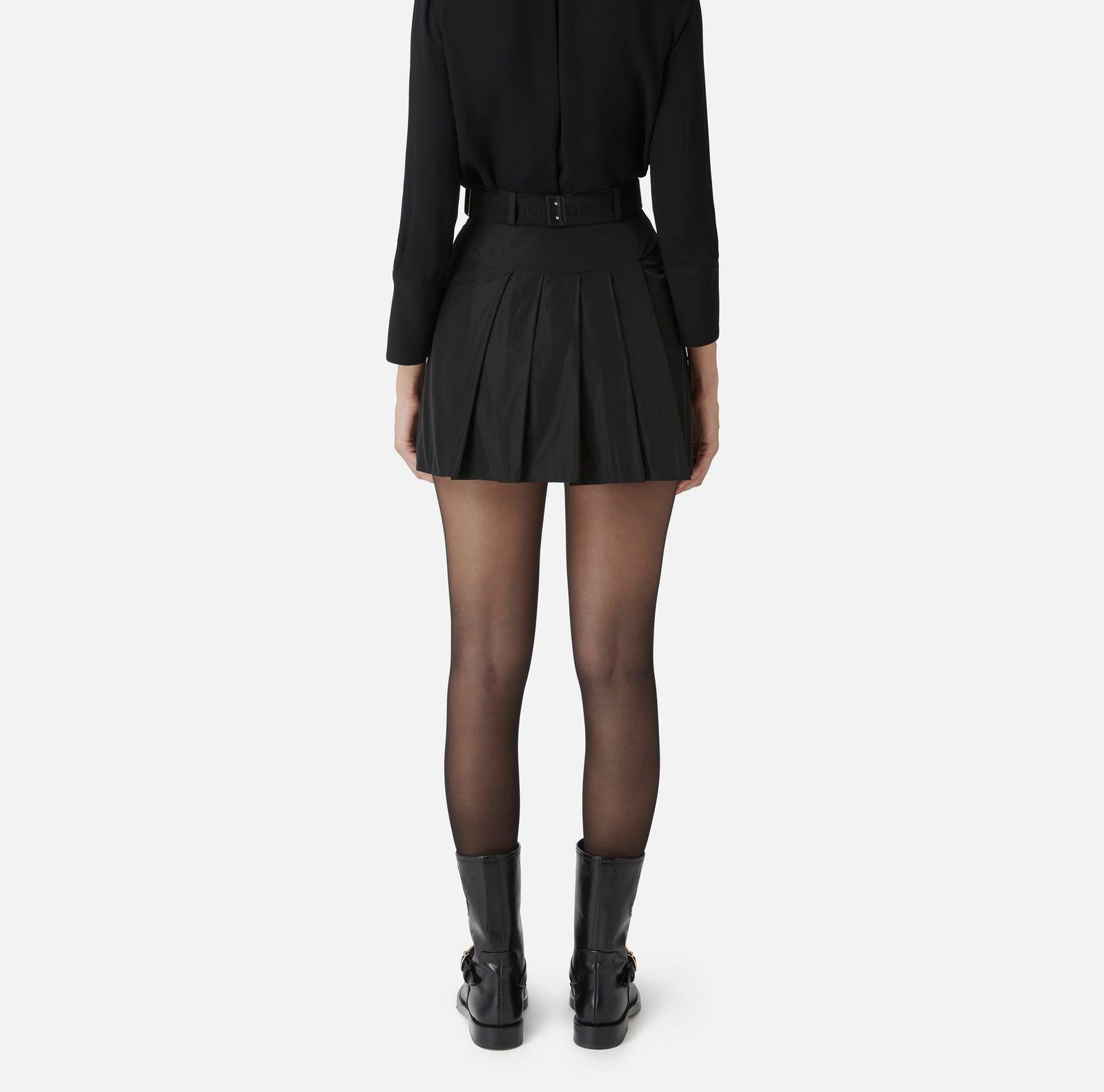 Minigonna a pieghe larghe con baschina realizzata in tessuto naylon leggero. Il punto vita è enfatizzato da una cintura removibile in nastro con fibbia in metallo silver, e una zip invisibile sul fianco.