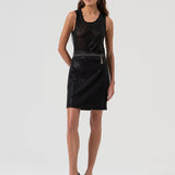 Gonna mini dalla linea slim, pensata per valorizzare la silhouette con eleganza e brillantezza. Il design essenziale è impreziosito da una cascata di strass che dona luce e carattere al capo, rendendolo perfetto per serate speciali o occasioni in cui non vuoi passare inosservata. La vita regolare assicura una vestibilità comoda e bilanciata, mentre la lunghezza mini aggiunge un tocco grintoso e femminile. Un capo statement da abbinare a top essenziali o blazer strutturati per un look da vero effetto wow.