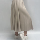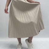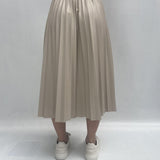 Gonna plissè effetto pelle, con elastico in vita, lunghezza midi, legermente svasata sui lati. Ideale con un paio di sneakers per ottenere un look casual, oppure abbinata ad una blusa per un outfit più raffinato.