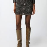 Minigonna dalla linea aderente, realizzata in tessuto maglia bouclè stretch di misto lana e mohair, personalizata dall'inserimento di filato lurex e paillettes per un effetto scintillante. La linea è completata da un'abbottonatura davanti ed un elastico in vita che garantisce un indosso facile e confortevole.