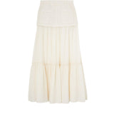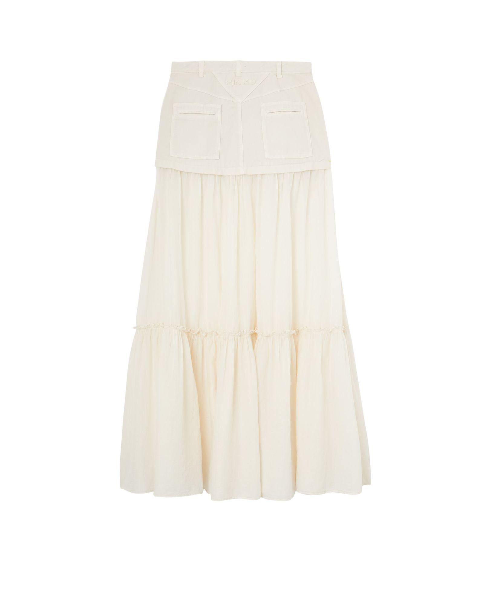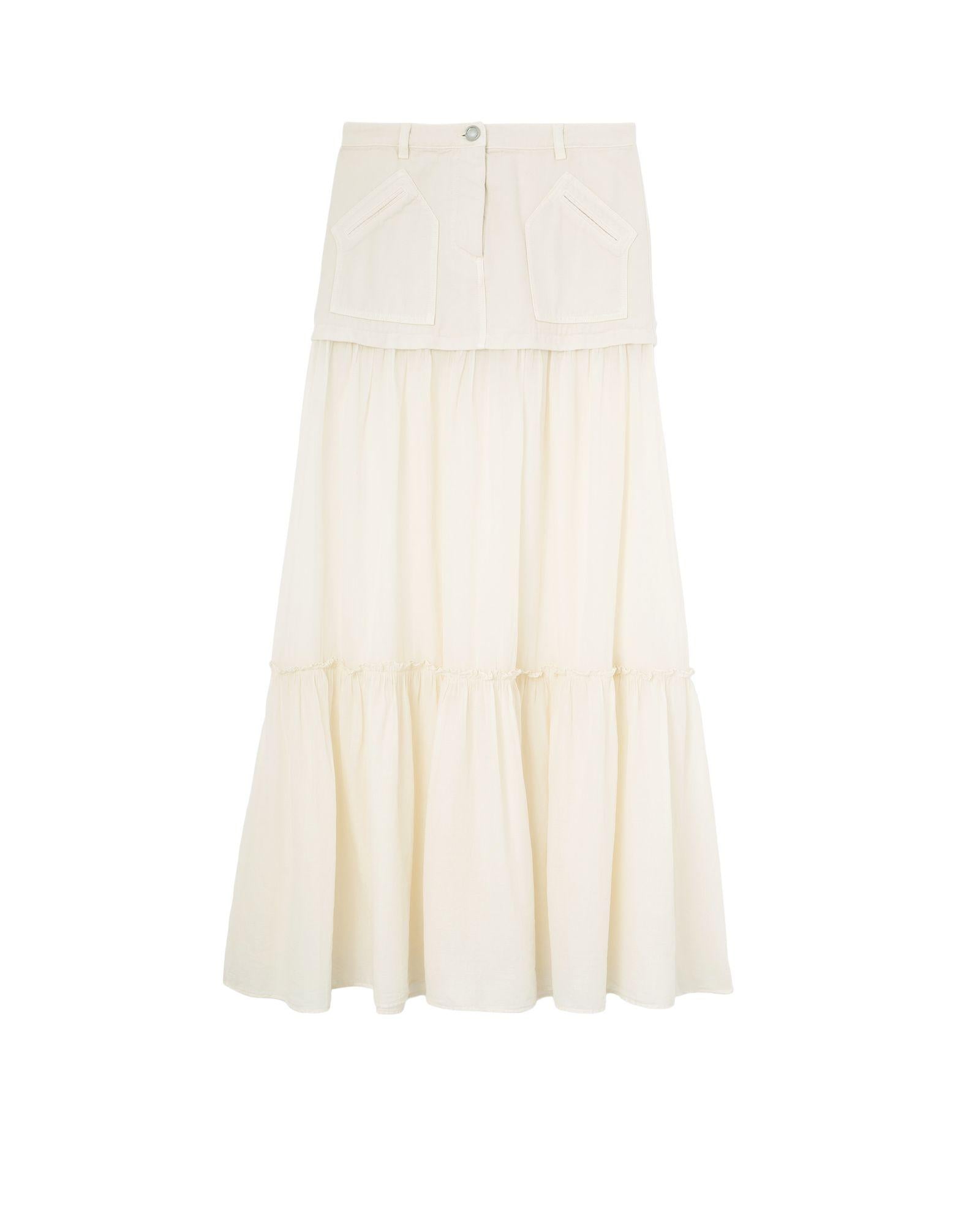 Realizzata con una combinazione inedita di materiali, questa gonna lunga unisce la struttura del denim in cotone nella parte superiore con la leggerezza del voile semi trasparente nella parte inferiore, creando un effetto visivo sorprendente e sofisticato. Il design parte con una costruzione in jeans a vita media, caratterizzata da una linea pulita e femminile, arricchita da tasche funzionali sia sul fronte che sul retro, una zip coperta e un bottone metallico che richiama lo stile classico del denim. Sotto i fianchi, la gonna si apre in un morbido volant in cotone voile, che accompagna il movimento con leggerezza e aggiunge un tocco romantico al capo. La vestibilità è regolare, pensata per valorizzare la figura senza costringere, mentre la lunghezza maxi la rende adatta sia a look casual con sneaker che a outfit più raffinati con sandali o stivaletti. Il contrasto tra i materiali dona carattere e versatilità, rendendo questa gonna un capo statement ideale per la mezza stagione e lestate.