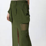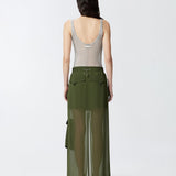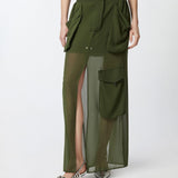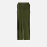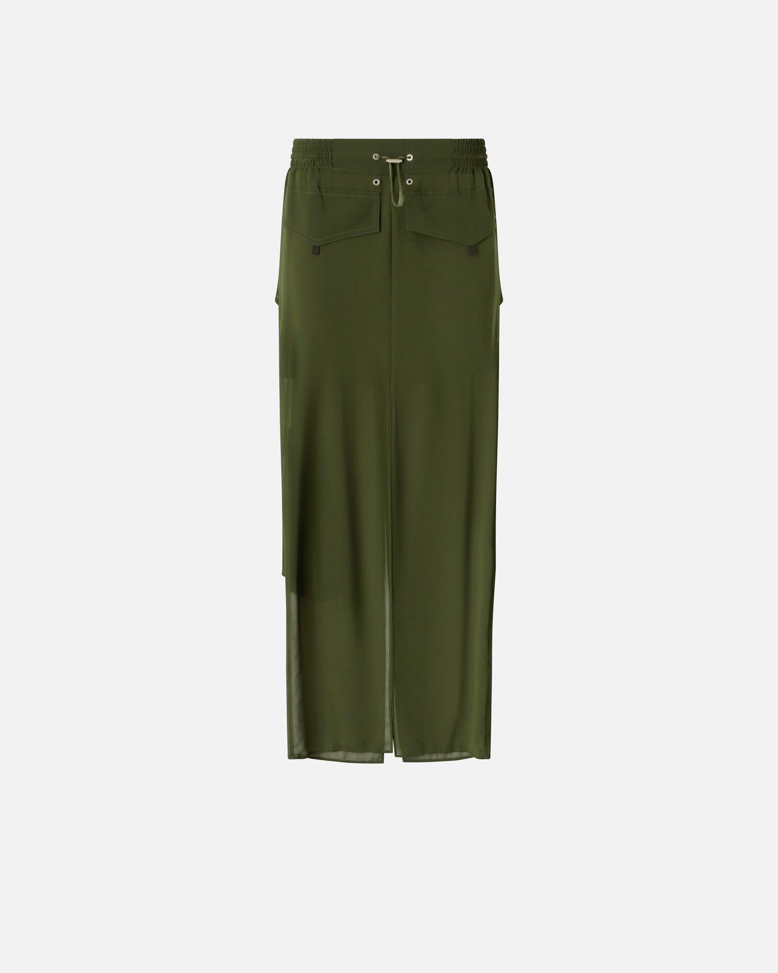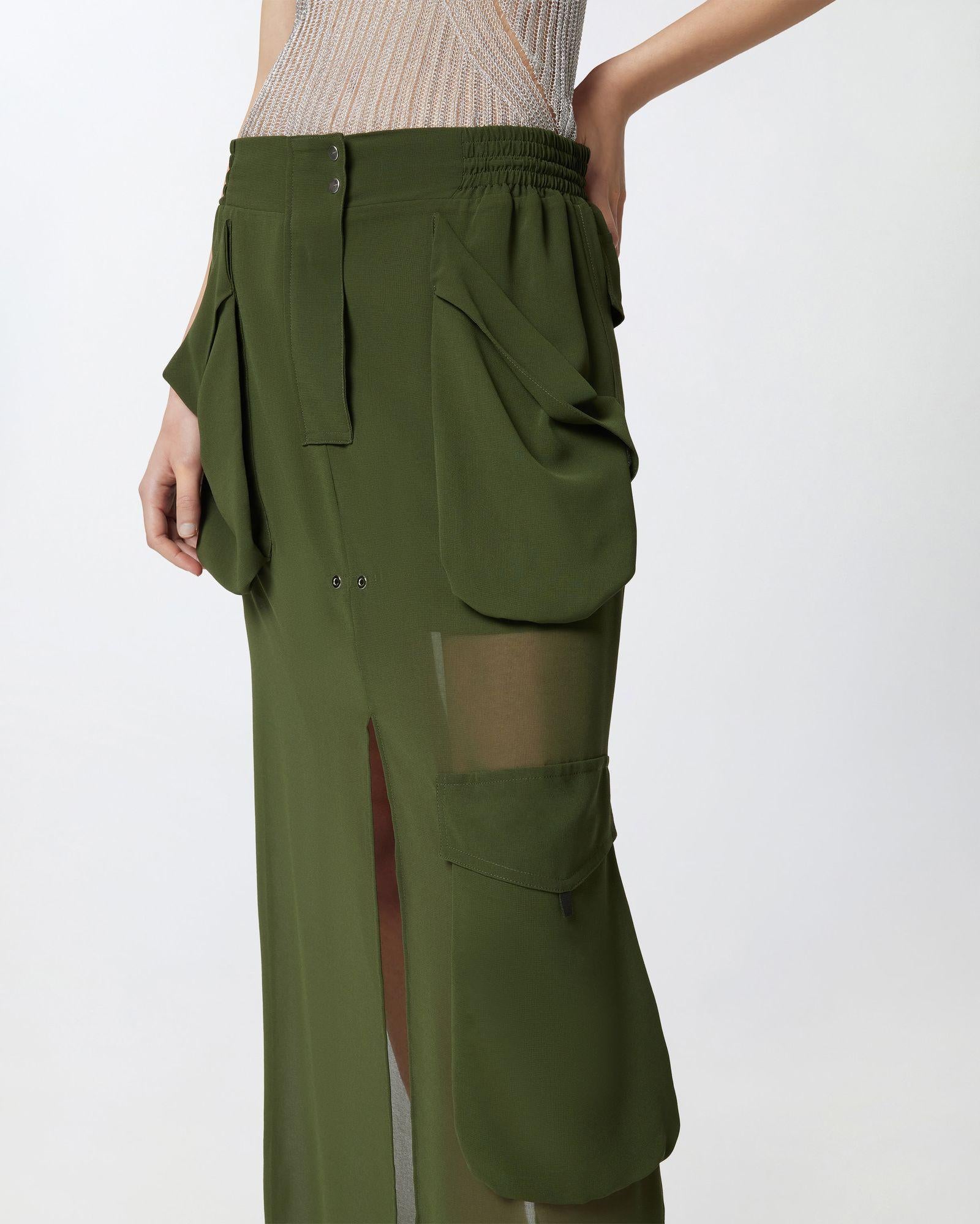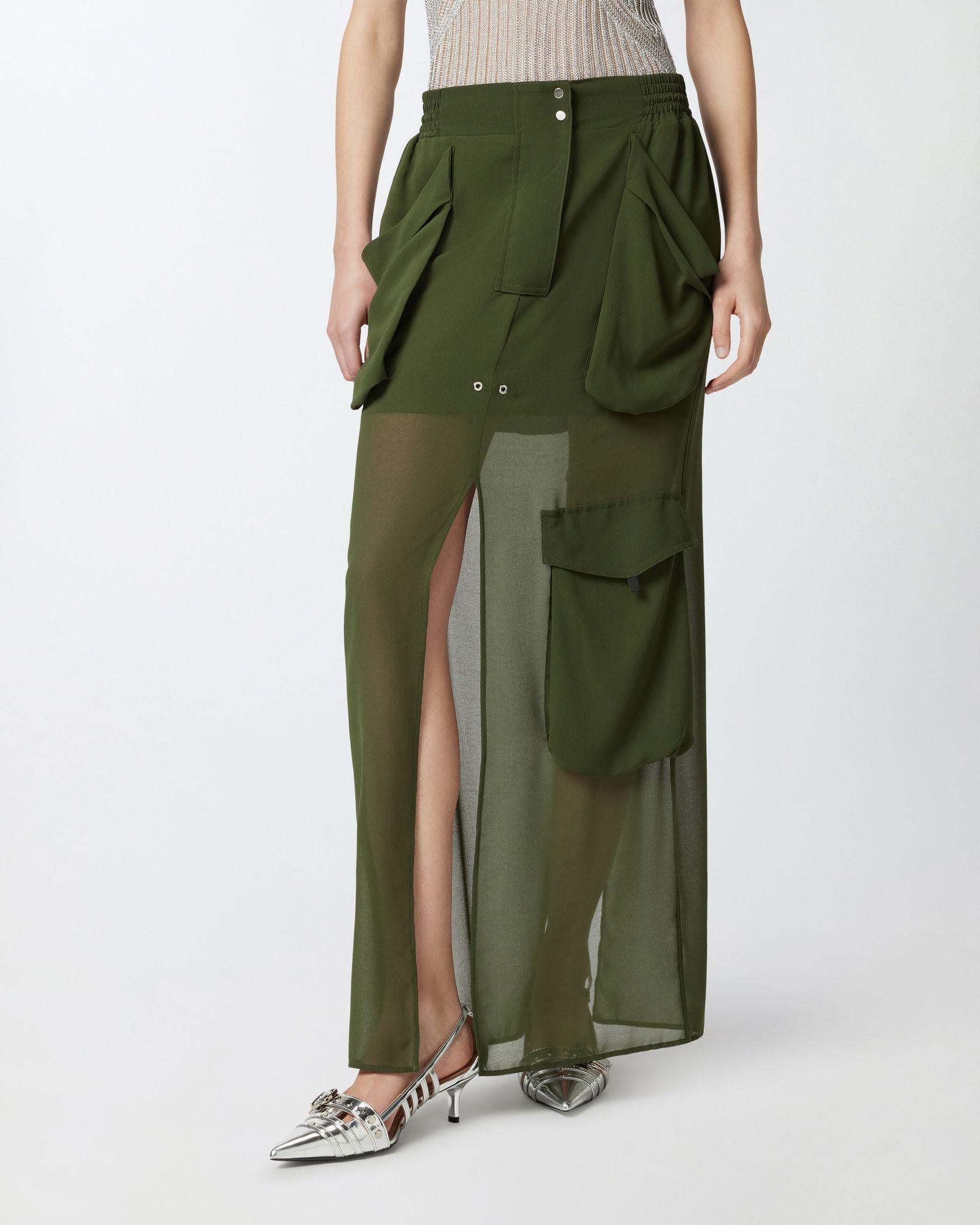 Gonna lunga in georgette caratterizzata da una silhouette cargo con maxi tasche applicate che richiamano lo stile utility. Ha una linea dritta e definita con doppio spacco centrale al fondo, sia davanti che sul retro, che aggiunge un dettaglio femminile e personalizza il movimento. Completata da elastico e coulisse inserita in vita, regolabile con finalino sul retro, chiusura con zip nascosta da patta e doppio bottoncino metallico in vita.