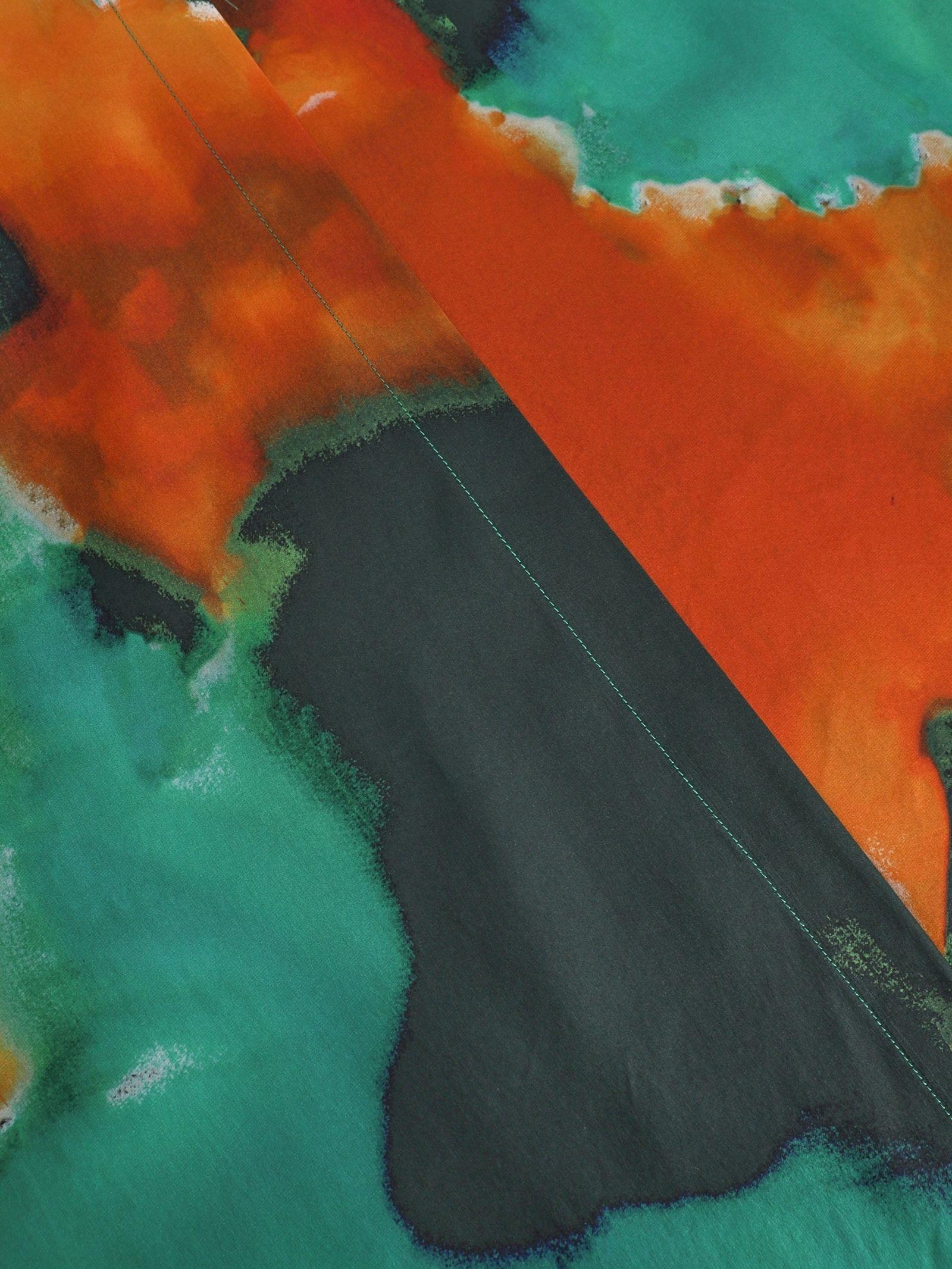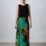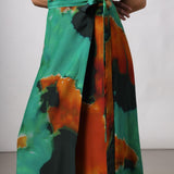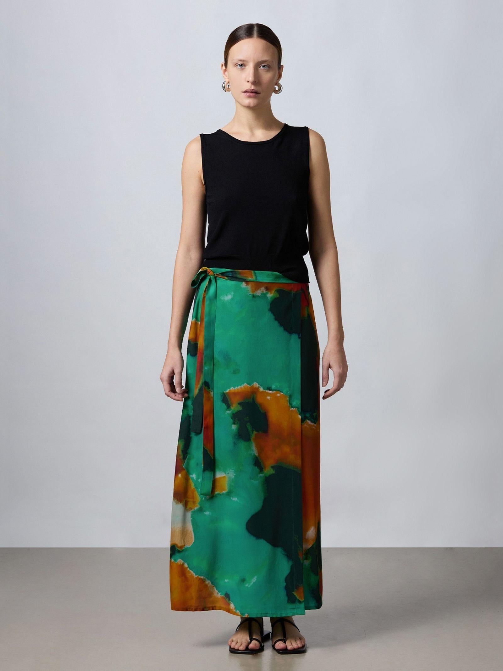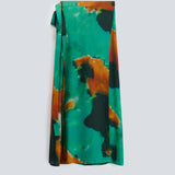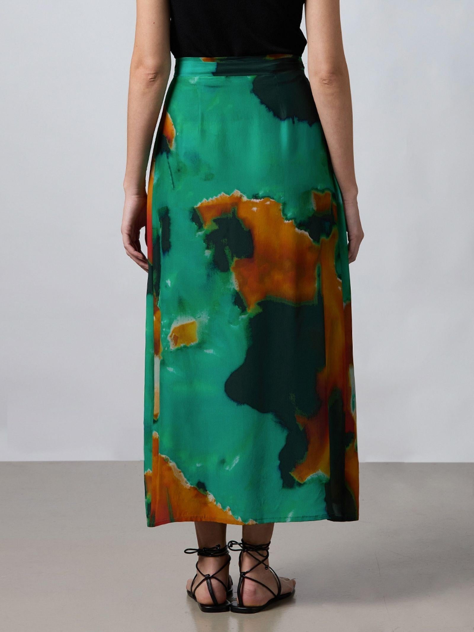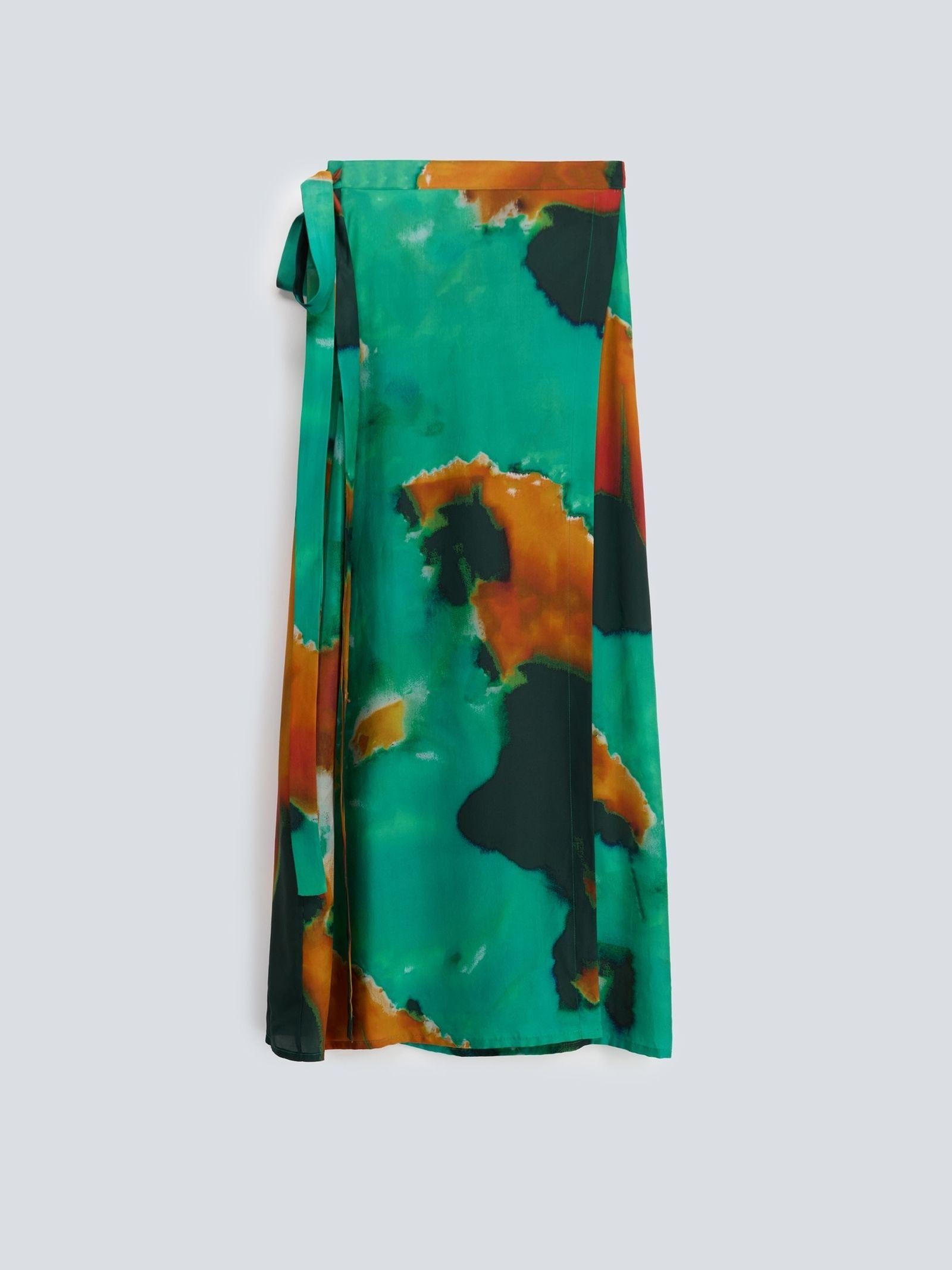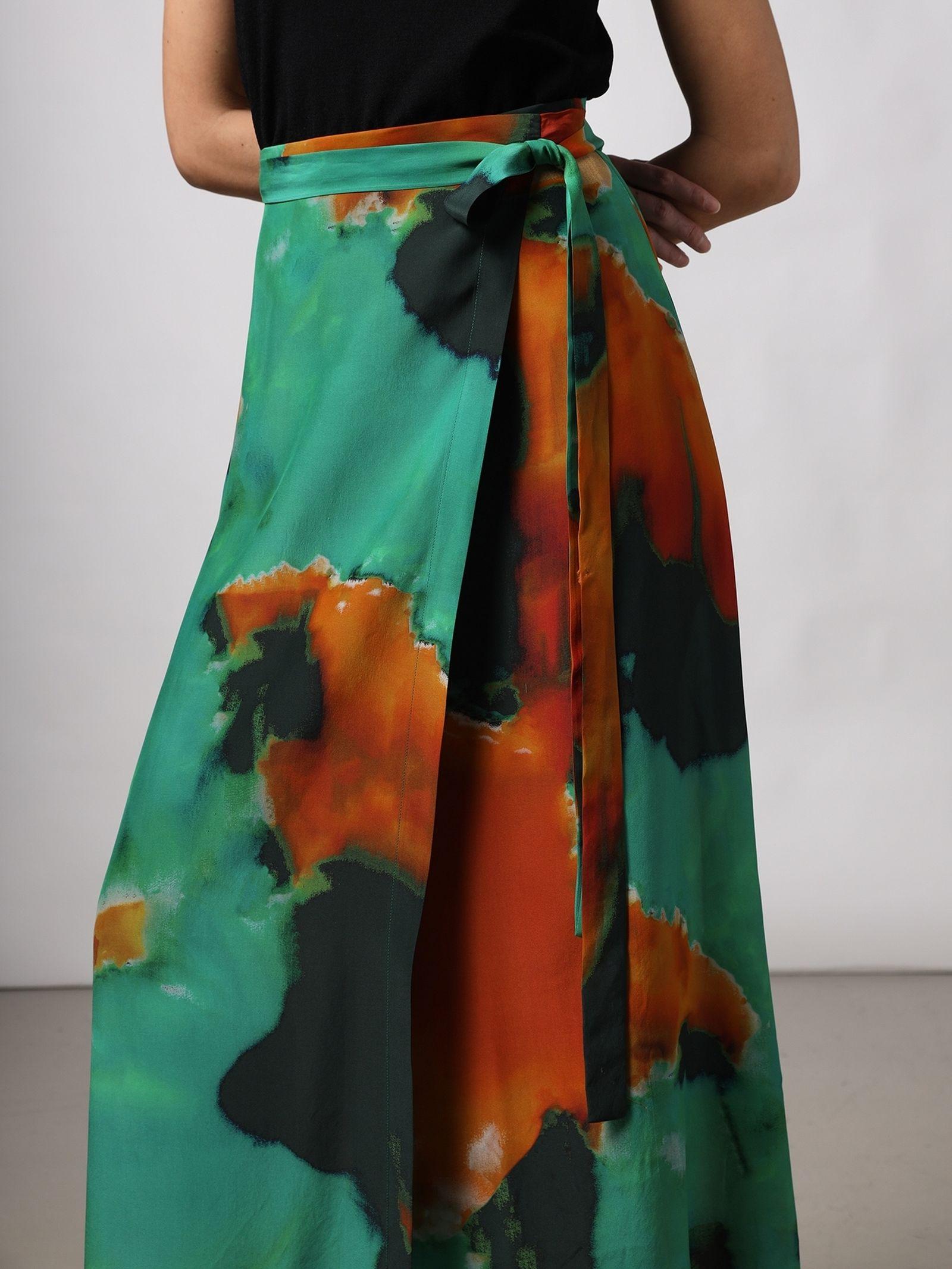 Gonna lunga con chiusura a portafoglio realizzata in seta con una stampa astratta originale, dalla vestibilità regolare. Caratterizzata da una chiusura con laccio da annodare in vita.