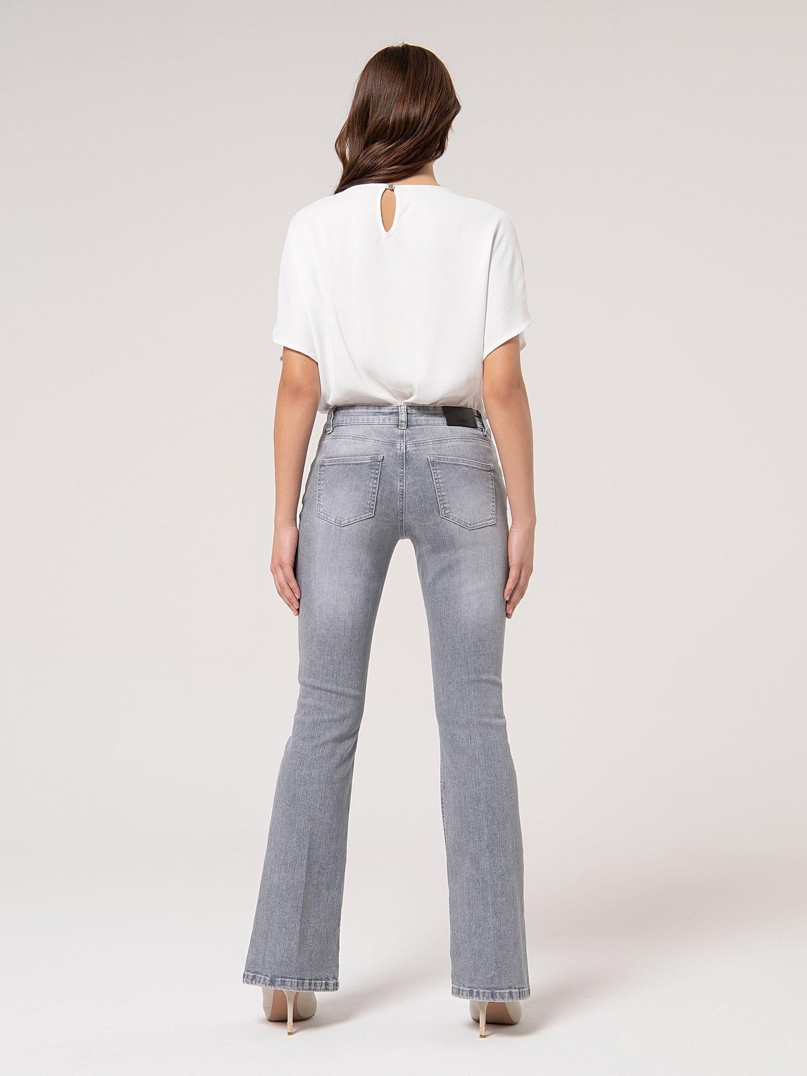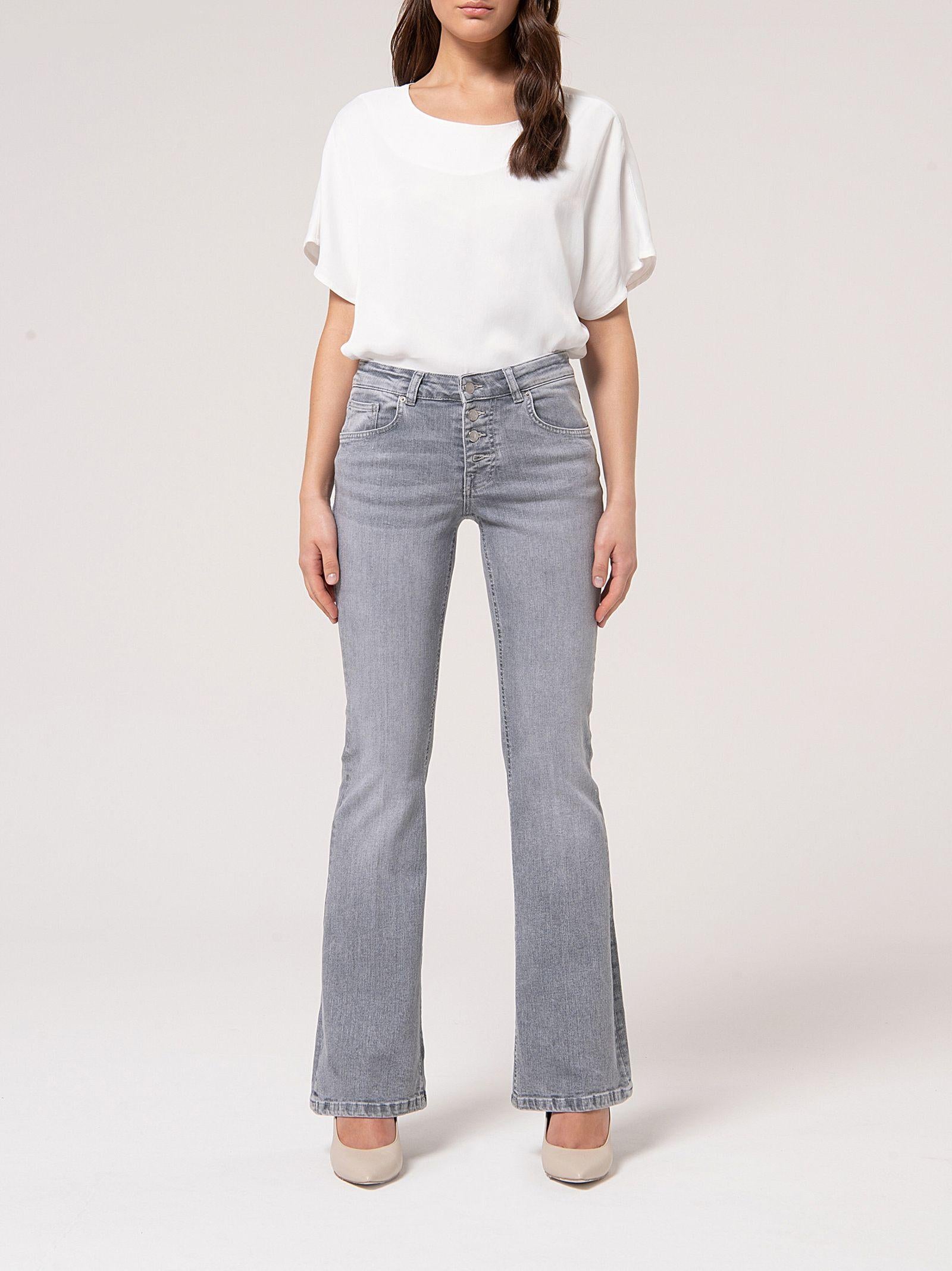 Jeans bootcut in denim stretch grigiocon lavaggio medio, vita alta, e bottoni metallici a vista, modello cinque tasche e con gamba a fondo largo.