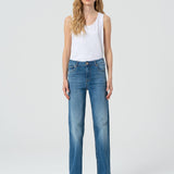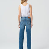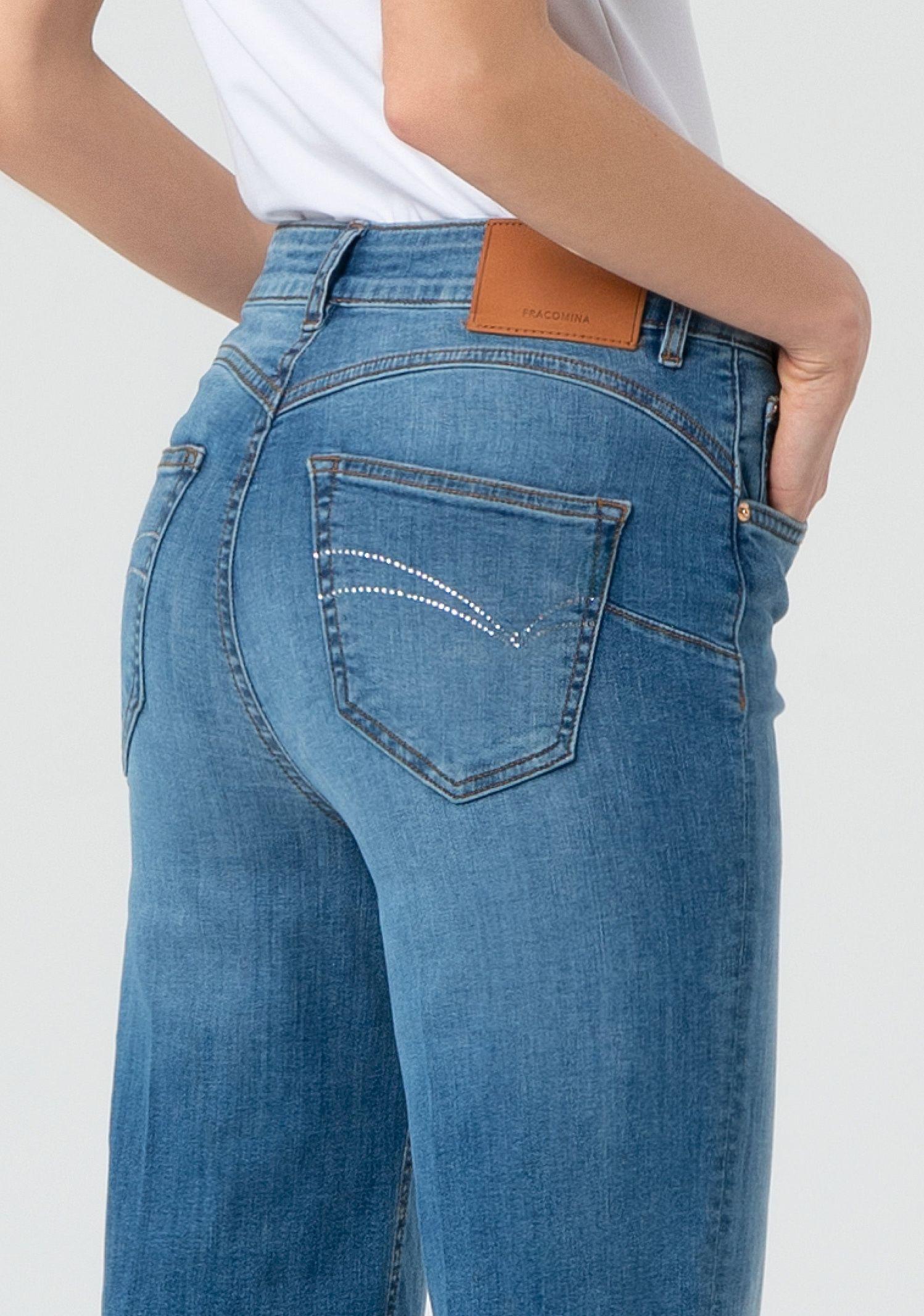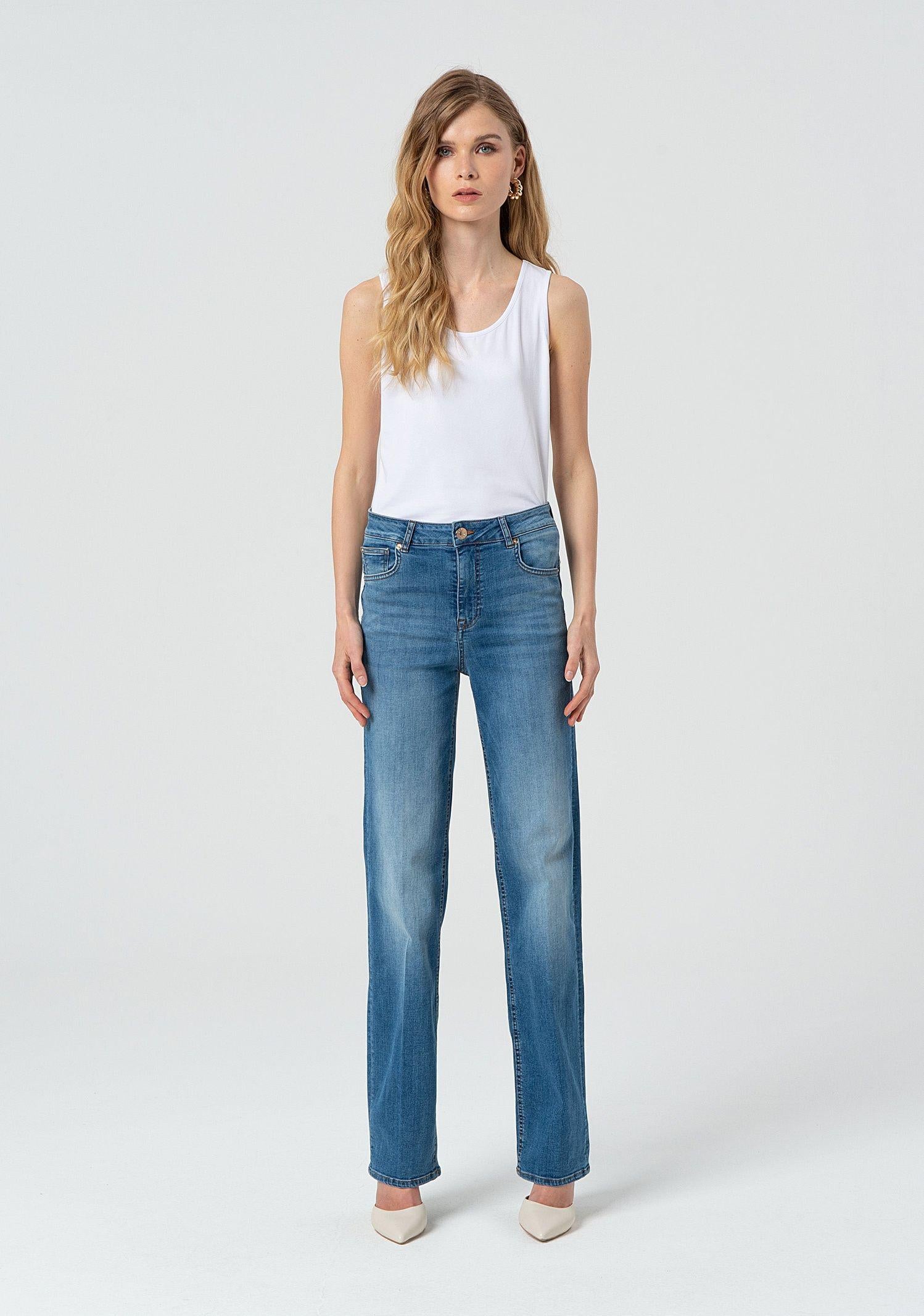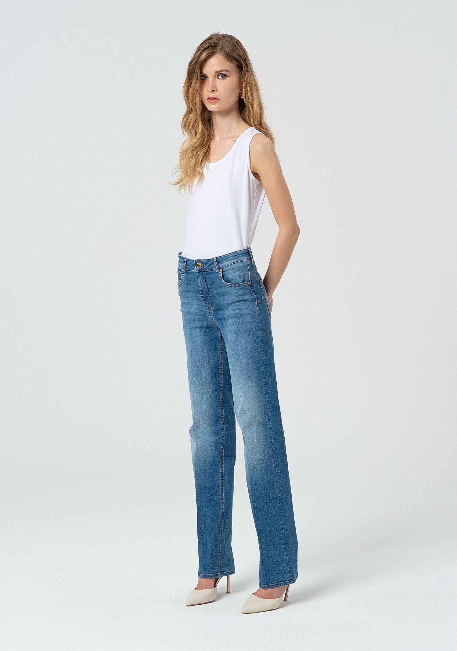 Jeans straight effetto push up realizzato in denim con lavaggio medio, caratterizzato da vita regolare, modello cinque tasche, e con gamba e fondo dritto, chiusura con zip coperta e bottone in metallo.