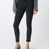 Jeans cinque tasche dalla silhouette skinny, caratterizzata da un fit molto aderente, in denim black stretch, con vita mid-rise e passanti per cintura, gamba aderente con fondo capo tagliato al vivo e trattato a riserva, per un effetto di colore a contrasto. Chiusura con zip e bottone a chiodo in metallo.
