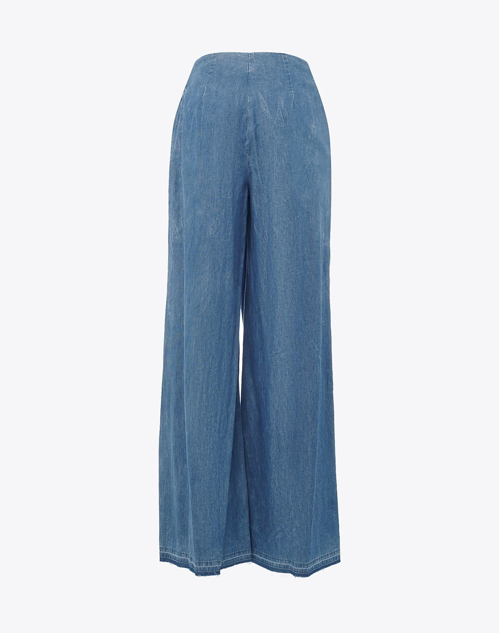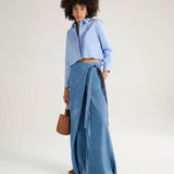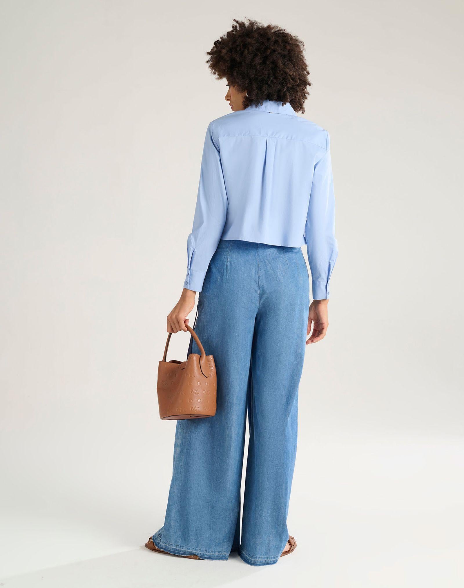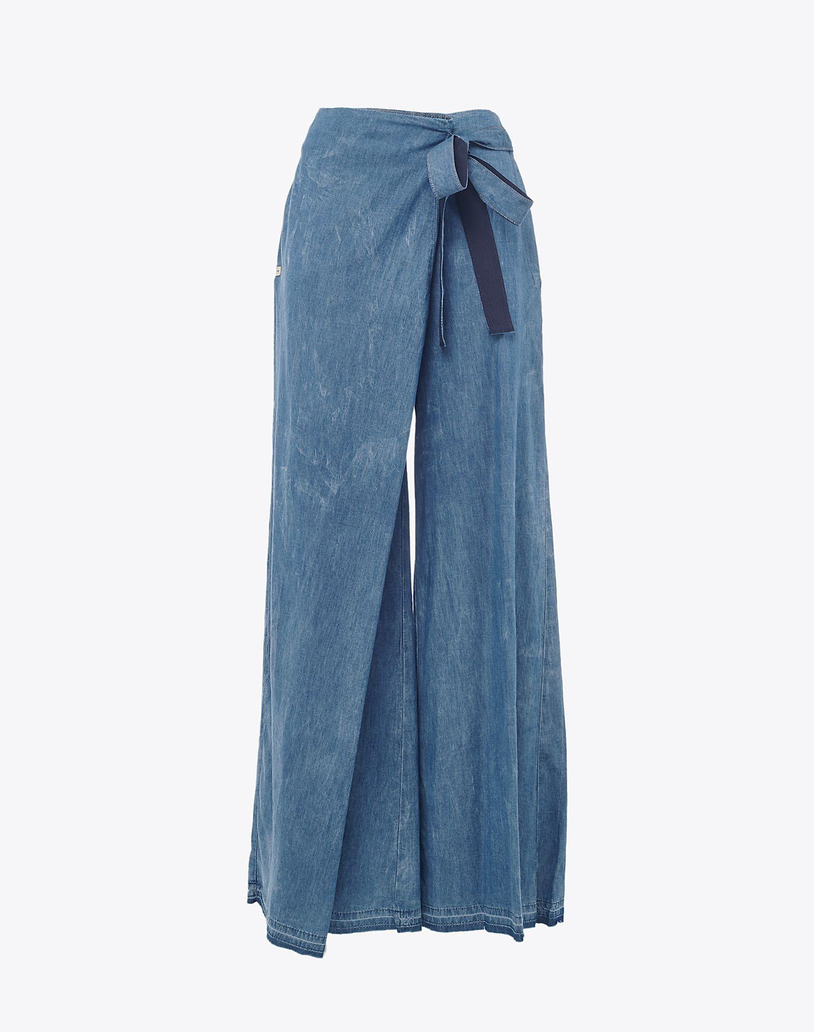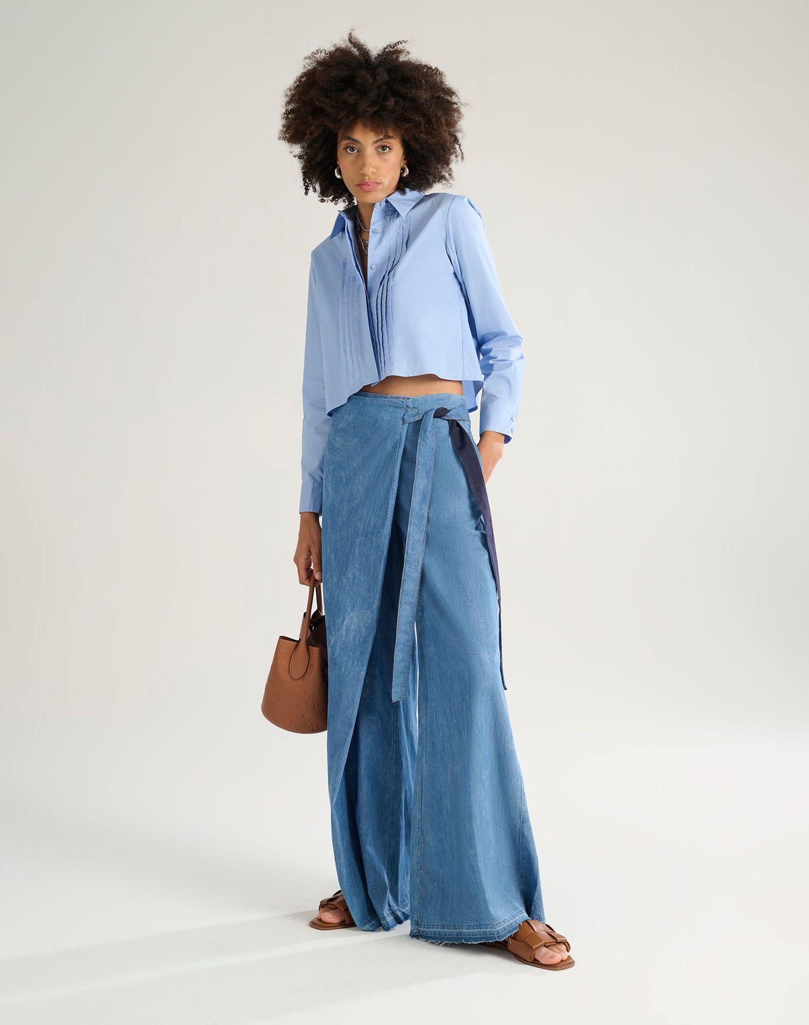 Pantalone realizzato in tessuto chambrì, un tessuto leggero e traspirante, caratterizzato da chiusura a portafoglio che offre una vestibilità regolabile e confortevole, e una linea morbida e ampia.