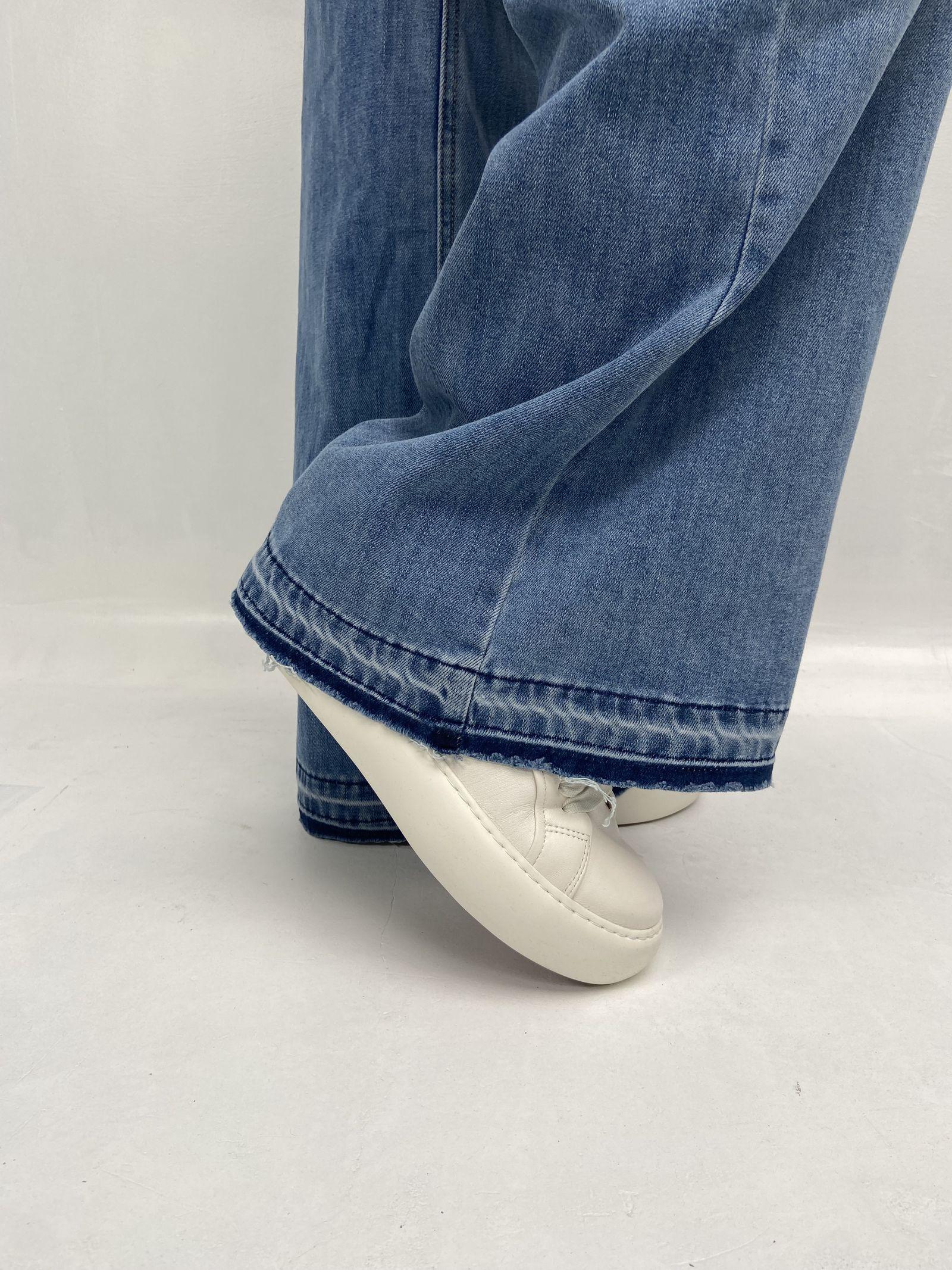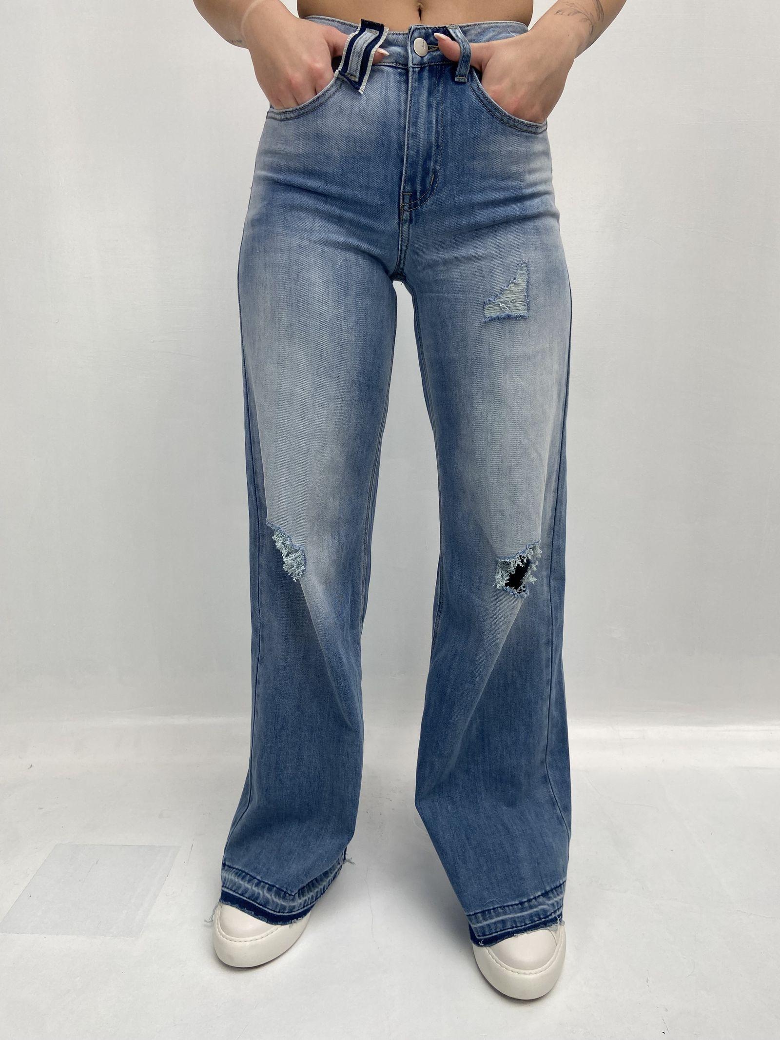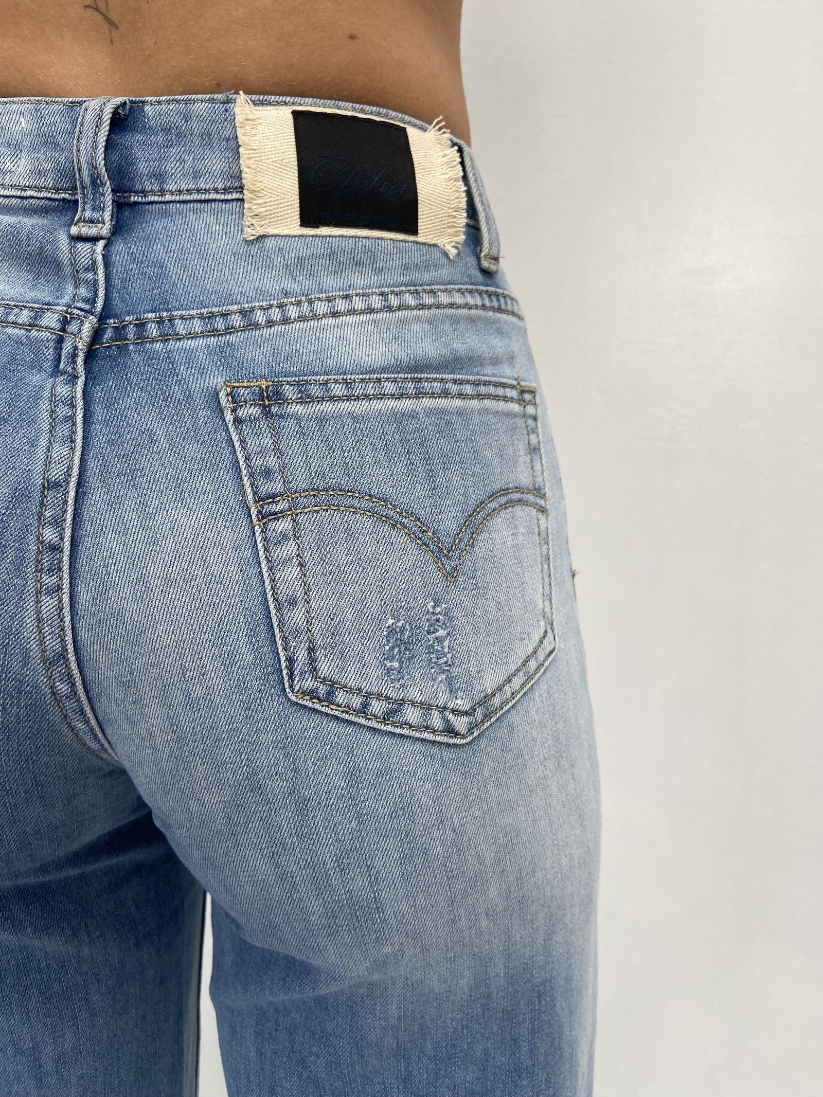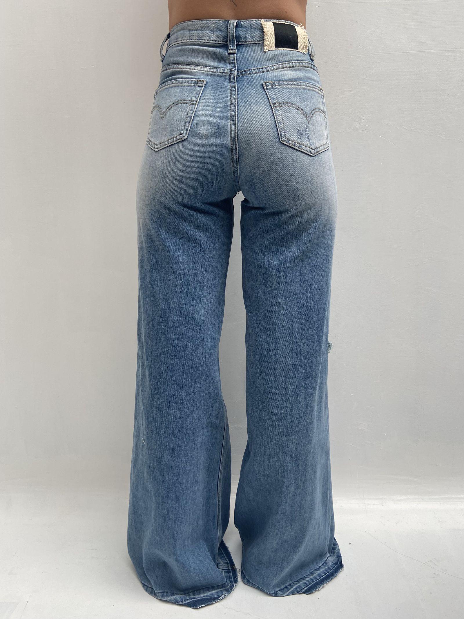 Jeans modello cinque tasche realizzato in cotone elasticizzato, con lavaggio medio chiaro, chiusura con bottone metallico e zip coperta, gamba larga e fondo taglio vivo, salpa logata dietro.