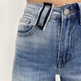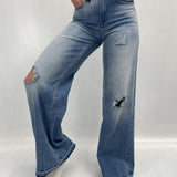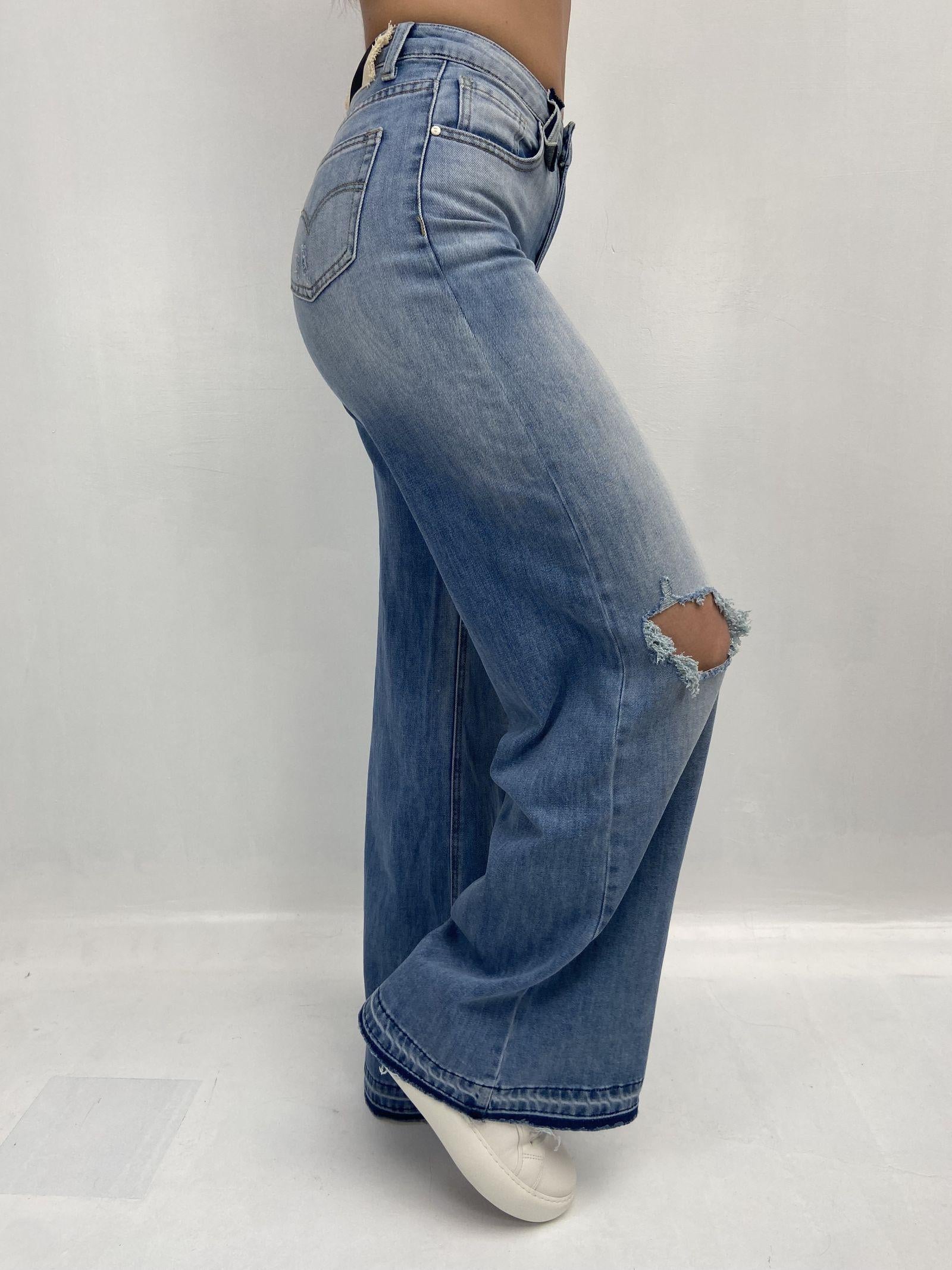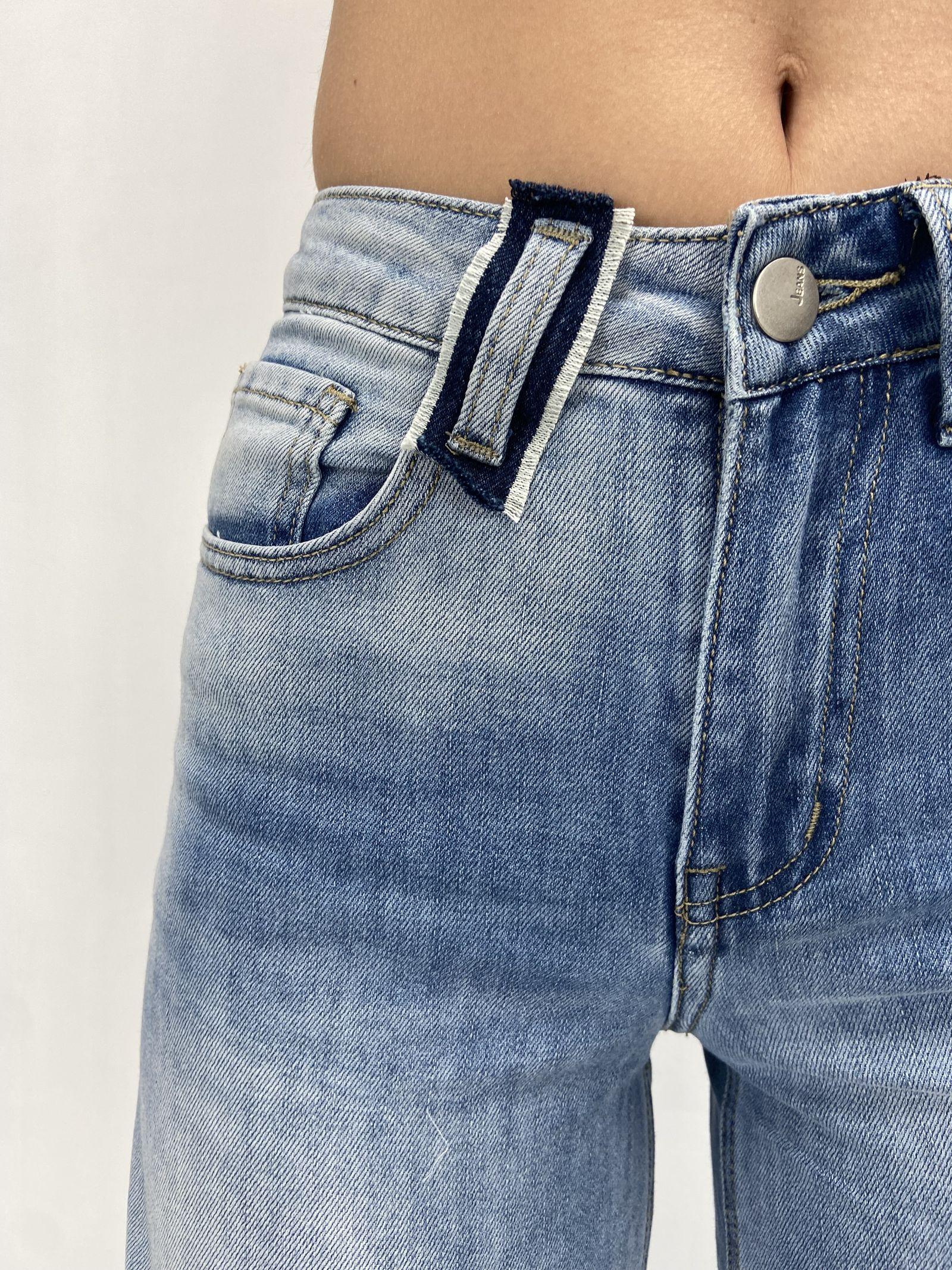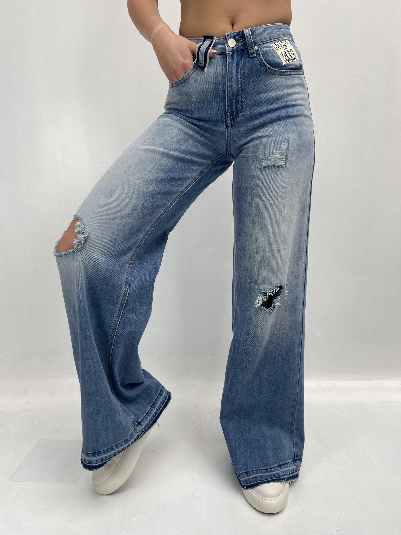 Jeans modello cinque tasche realizzato in cotone elasticizzato, con lavaggio medio chiaro, chiusura con bottone metallico e zip coperta, gamba larga e fondo taglio vivo, salpa logata dietro.