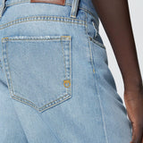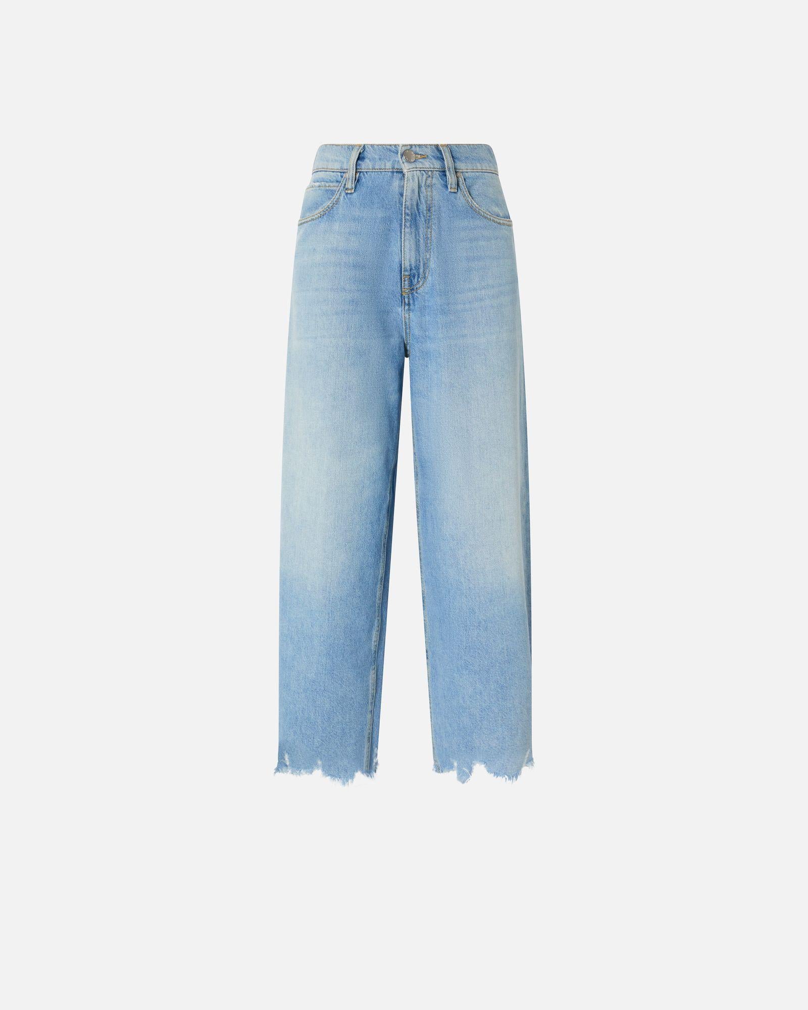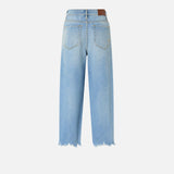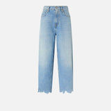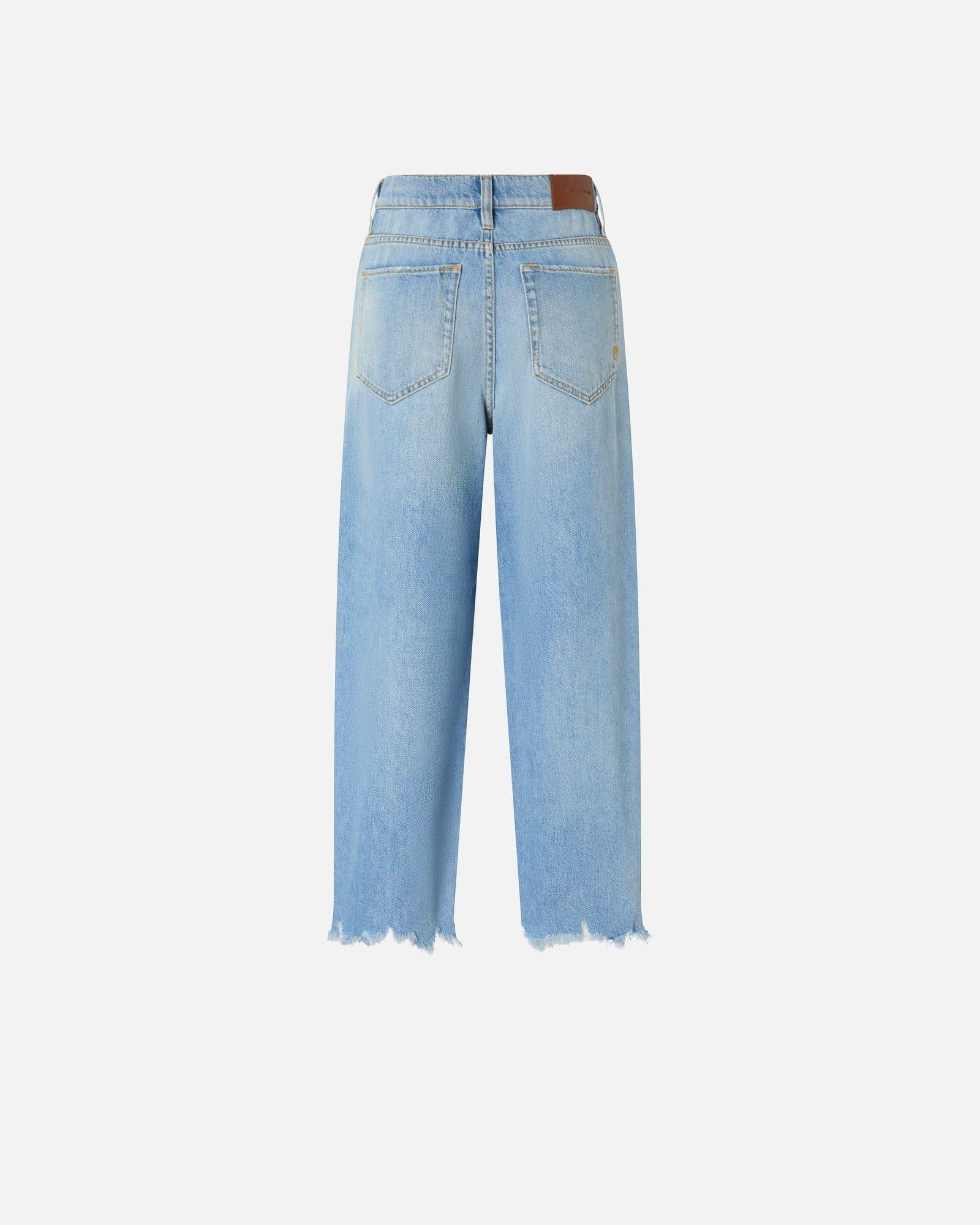 Jeans modello cinque tasche dalla silhouette ehh-fit realizzato in denim soft touch di misto cotone e lyocell dal lavaggio light wash che dona una tonalità chiara. La linea della gamba ampia e arrotondata è completata da fondo capo con orlo sfrangiato e irregolare, con rotture create per ottenere un effetto vissuto. Ha la vita regular con cavallo leggermente sceso, chiusura con zip e bottone a chiodo in metallo.